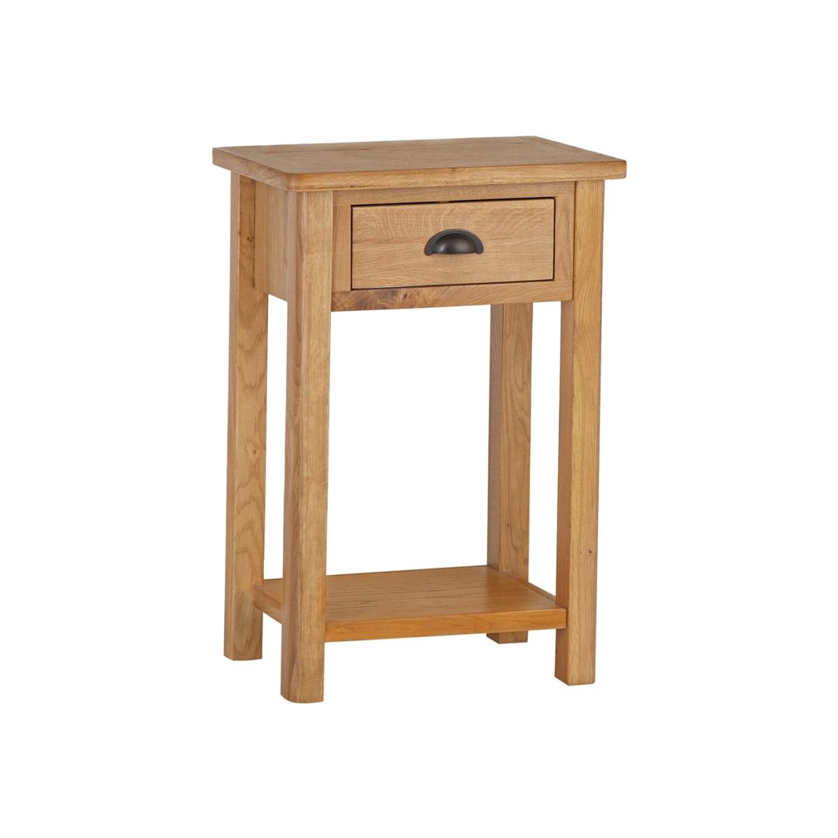 Transform your hallway with our Rutland oak telephone table. The caramel-coloured combination of solid oak and real oak veneers brings a rustic feel to your home, while the smooth, rounded corners and edges provide a sophisticated finish. A single roomy drawer is ideal for keys, wallets and other going-out essentials, and the lower shelf makes the perfect spot for your shoes or slippers. Did we mention the brass-effect cup handle and elegant lacquered finish? This versatile piece also makes an ideal lamp stand or bedside table, and comes ready-assembled and raring to go. Oh, and a telephone’s entirely optional.