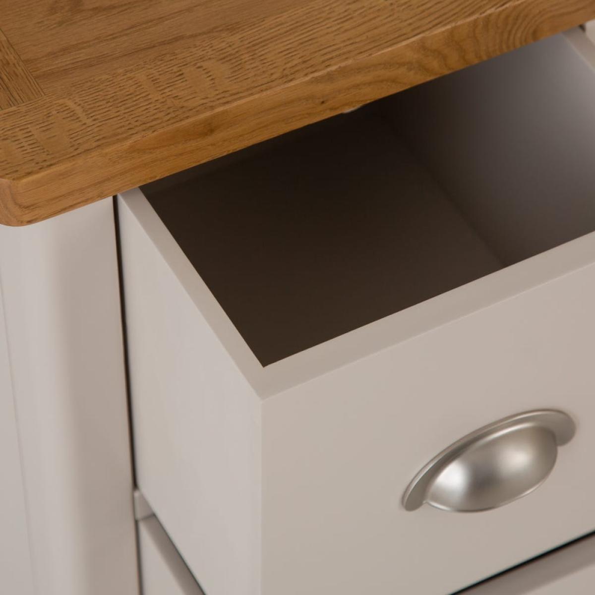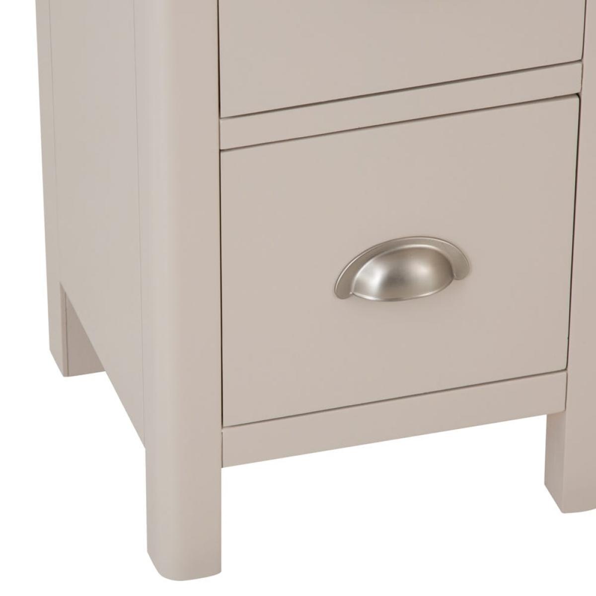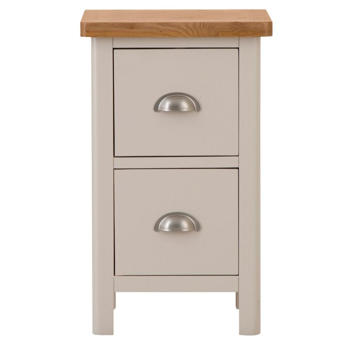 This Rutland painted oak 2-drawer slim bedside table is sure to elevate your bedtime routine. It’s slender enough to slot easily next to your bed while having ample space for a reading lamp and book. Light sleeper? You can keep eye masks, earplugs and essential oils in the two spacious drawers to make getting your 40 winks that little bit easier. The golden oak top gives a warm glow to our elegant stone-grey finish, while the chrome cup handles add a touch of class. This item comes ready-assembled, and with looks this good, you’ll surely need a pair.