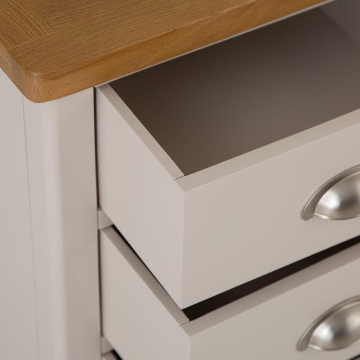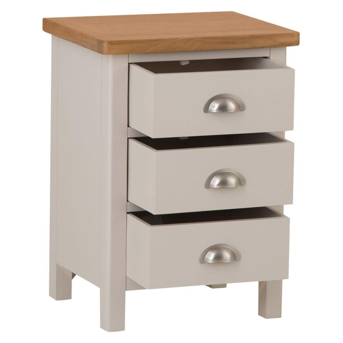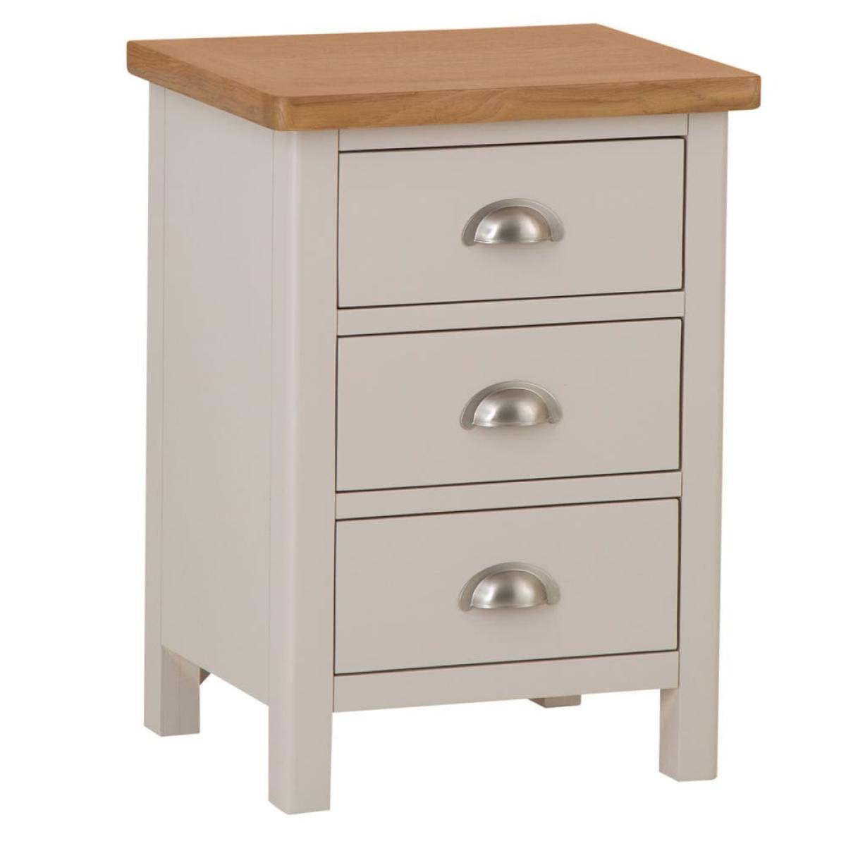 Bedtime will be even more appealing with our Rutland painted oak 3-drawer large bedside table. The spacious oak top has plenty of room for a reading lamp and your latest book, while the trio of drawers keeps night-time necessities close at hand. The smart dove-grey finish fits effortlessly into any style of bedroom and its contemporary feel is complemented by our stylish chrome cup handles. Distinctive rounded corners to add a touch of luxury to your evening wind-down. For a synchronised sleep set-up, choose a pair of these tables to sit either side of any Rutland painted oak bed frame.