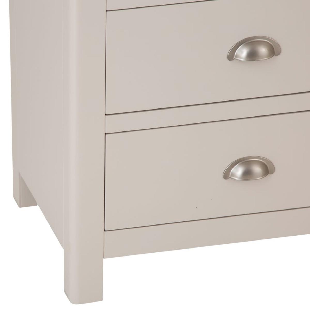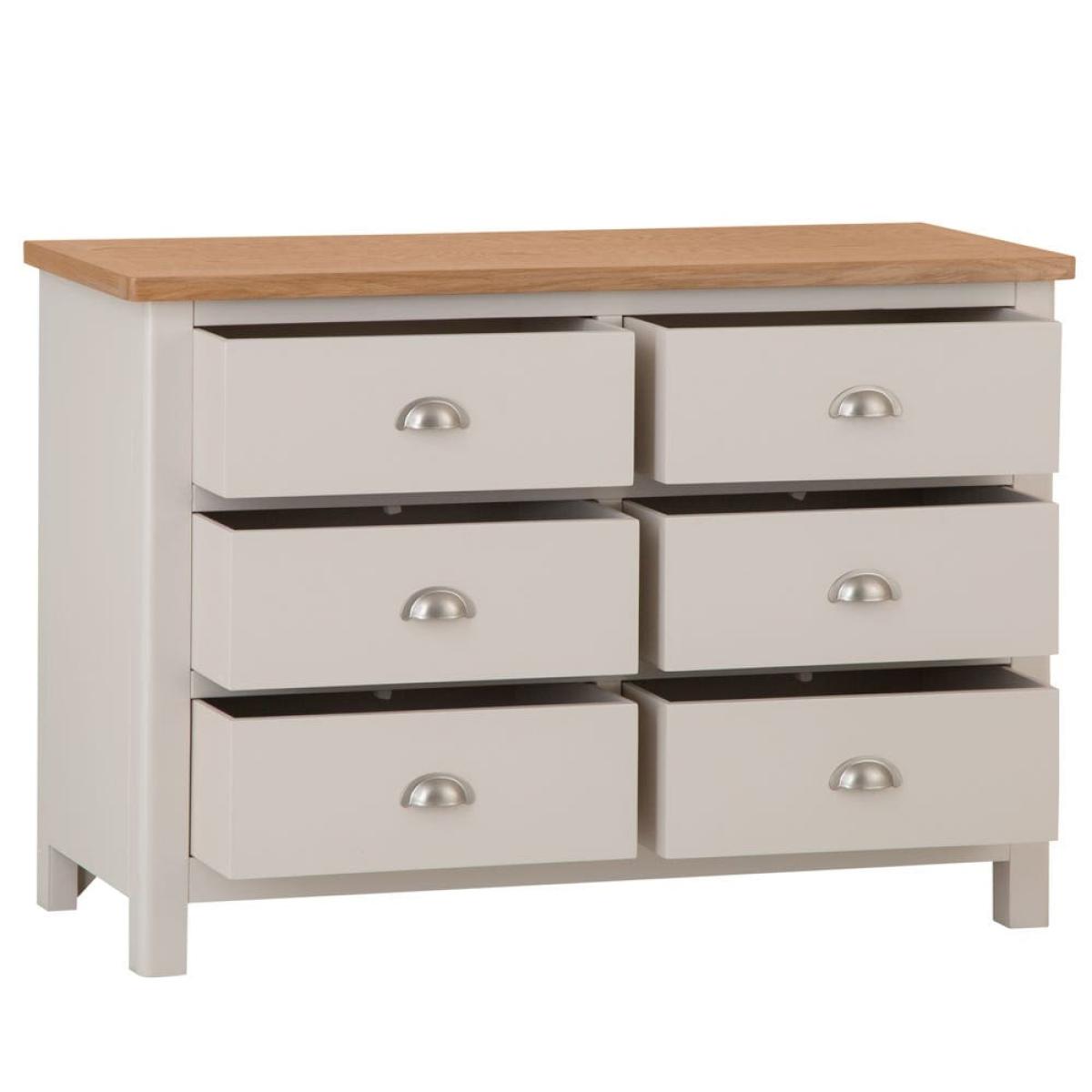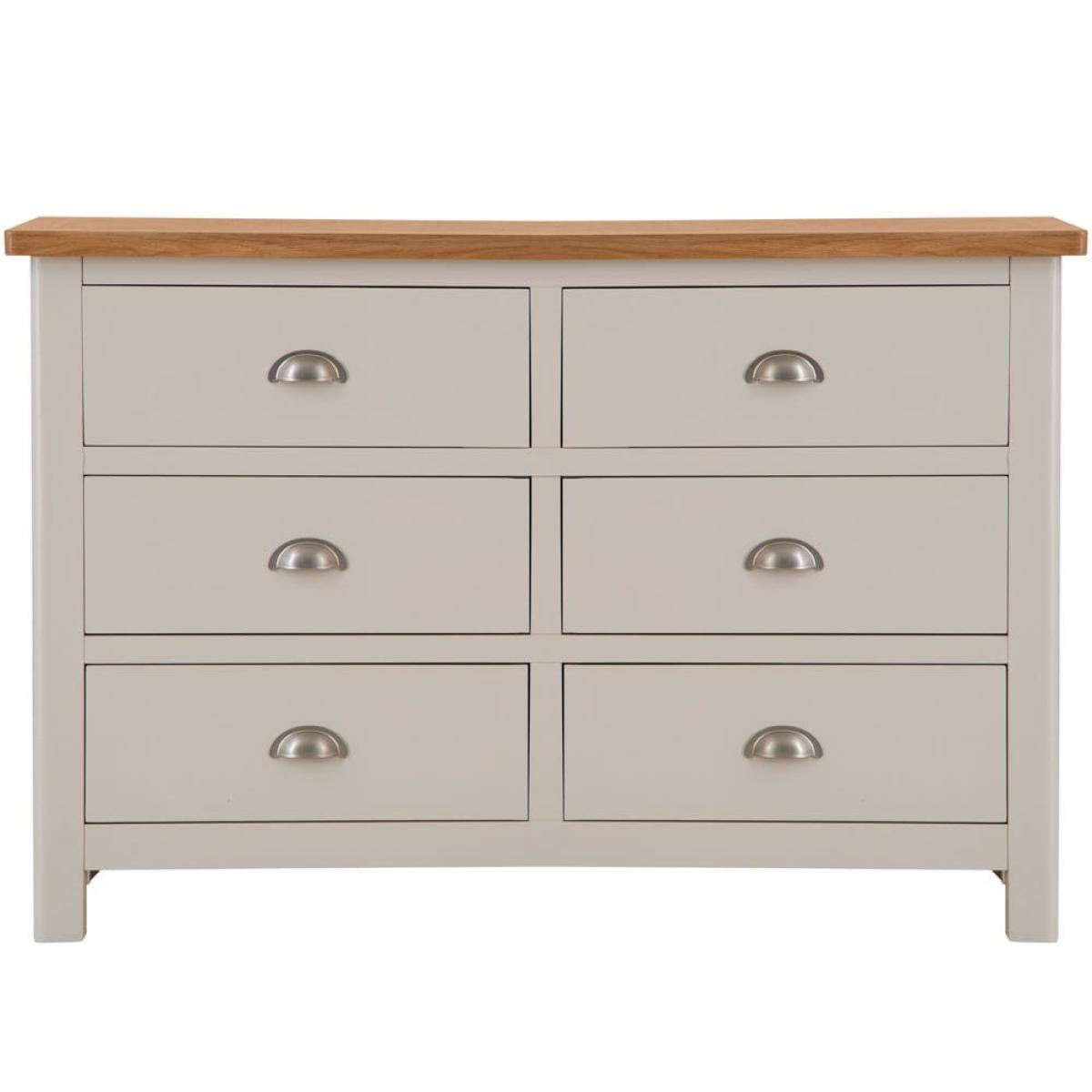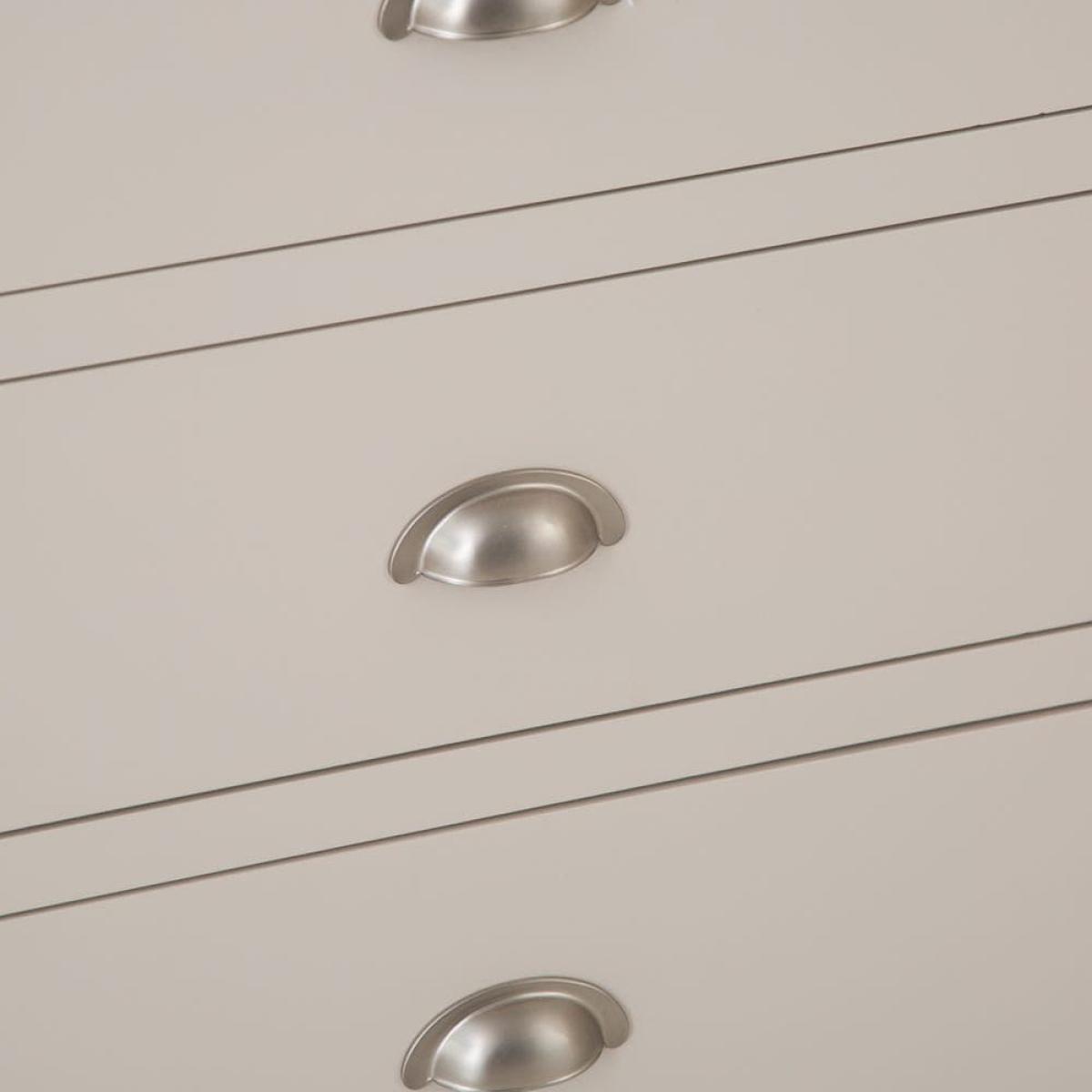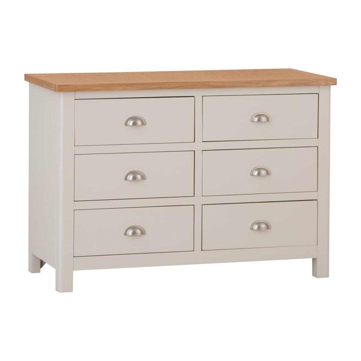 Our Rutland painted oak chest of 6 drawers is a classic addition to your master bedroom or spare room. It has six drawers of equal size to keep your foldables in pristine condition. Stylish chrome cup handles enhance our stone-grey finish, a timeless hue that brings low-key sophistication to your home. The oak top has a traditional farmhouse feel, and the rounded corners add an artisan’s eye for detail. At 46cm wide, the drawers have plenty of room for cosy knits as well as warm-weather wear. Dress up the top with a few of your favourite ornaments to give it your signature flair.
