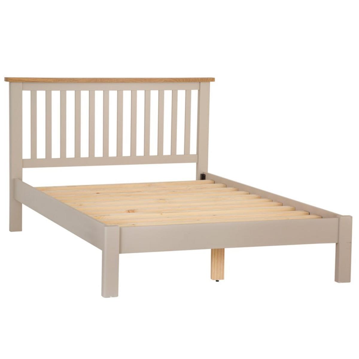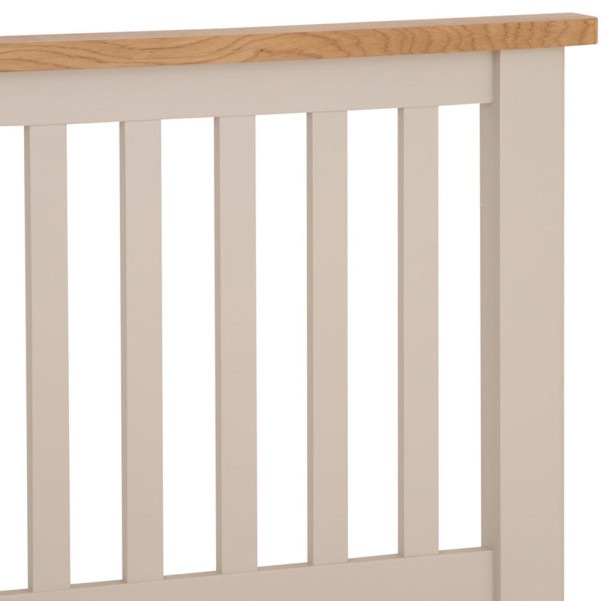 Even night owls will look forward to bedtime with this elegant Rutland painted oak double bed frame. The stone-grey finish is a serenely snooze-inducing hue and makes a flattering backdrop to both simple white bedlinen and colourful duvets. The slatted headboard has a classic elegance, and the natural oak top brings a rustic feel. Make yourself comfortable against it while you sip your morning coffee, or plump up your favourite cushions during the day. At 4ft x 6ft, this bed frame takes a standard double mattress, and the sturdy slats and support rail will keep you sleeping soundly all night long.