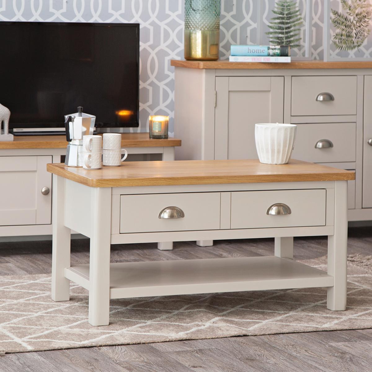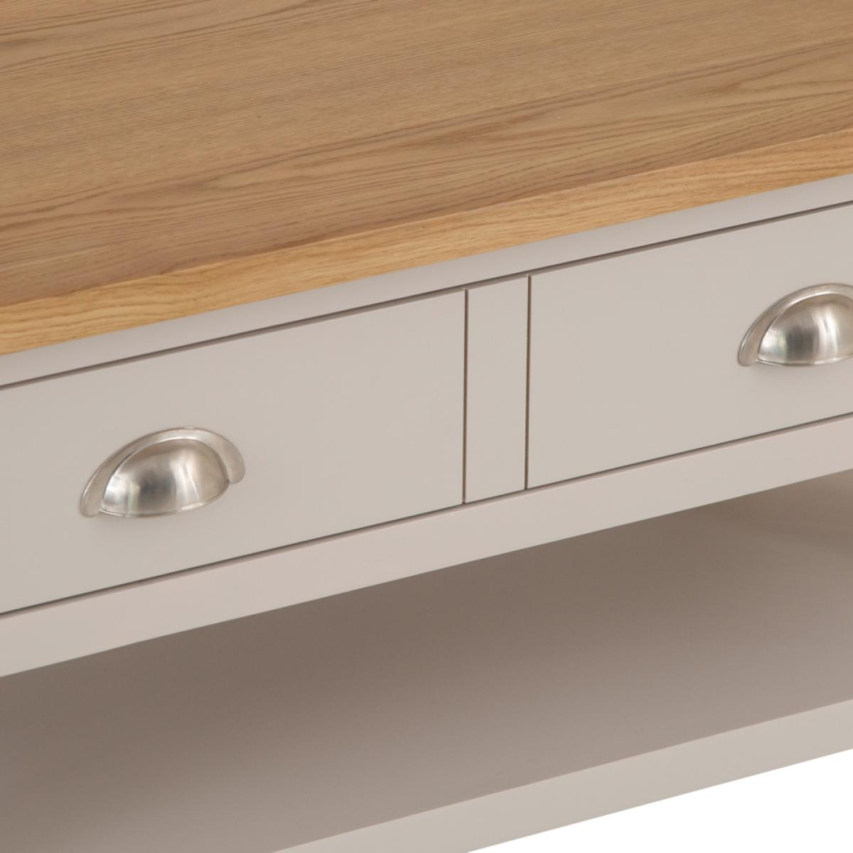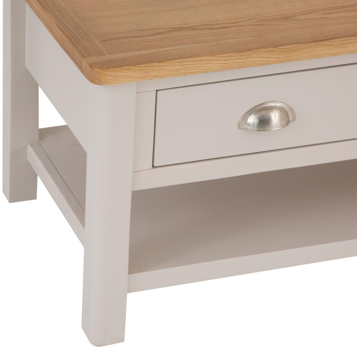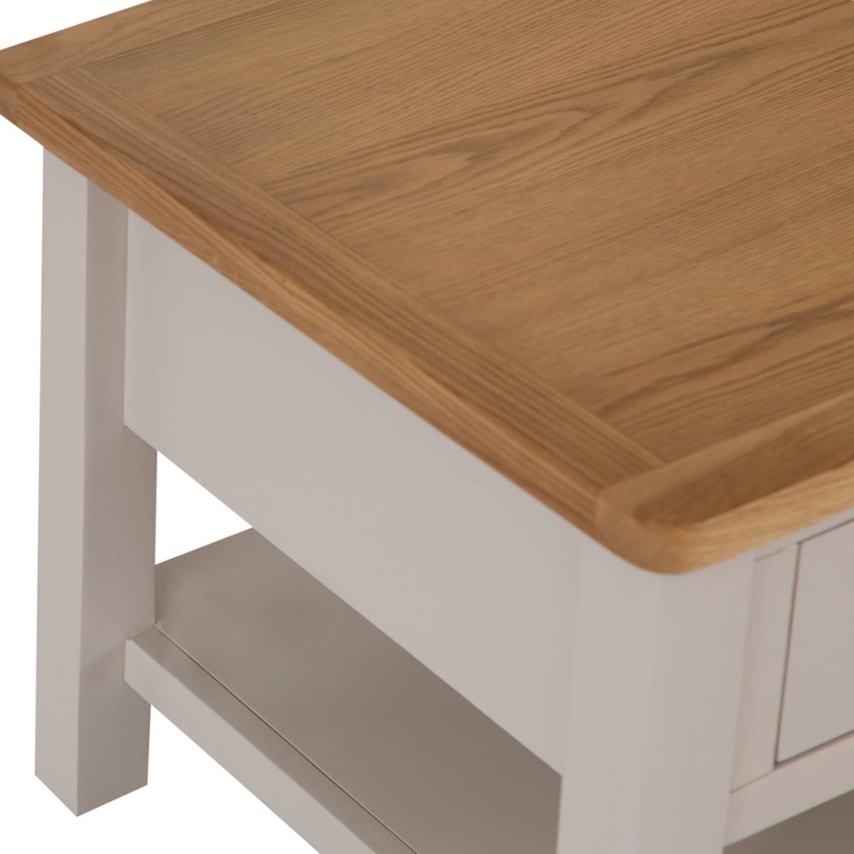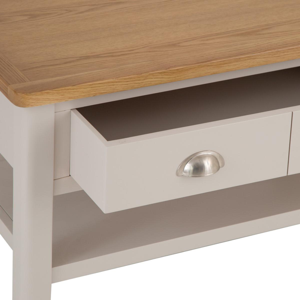 The living room just wouldn’t feel like home without a Coffee Table at the centre of things, would it? The Rutland Painted Oak Large Coffee Table allows you to put your feet up, put your favourite brew down, and generally just relax at the end of a long day. The vibrant oak top anchors the piece within the existing colour scheme, whilst the stone grey painted finish brings it to life with a mix of modern and country aesthetics. Look closer and you’ll see that the real finishing touch is provided by the smooth transitions of the edges and corners.
