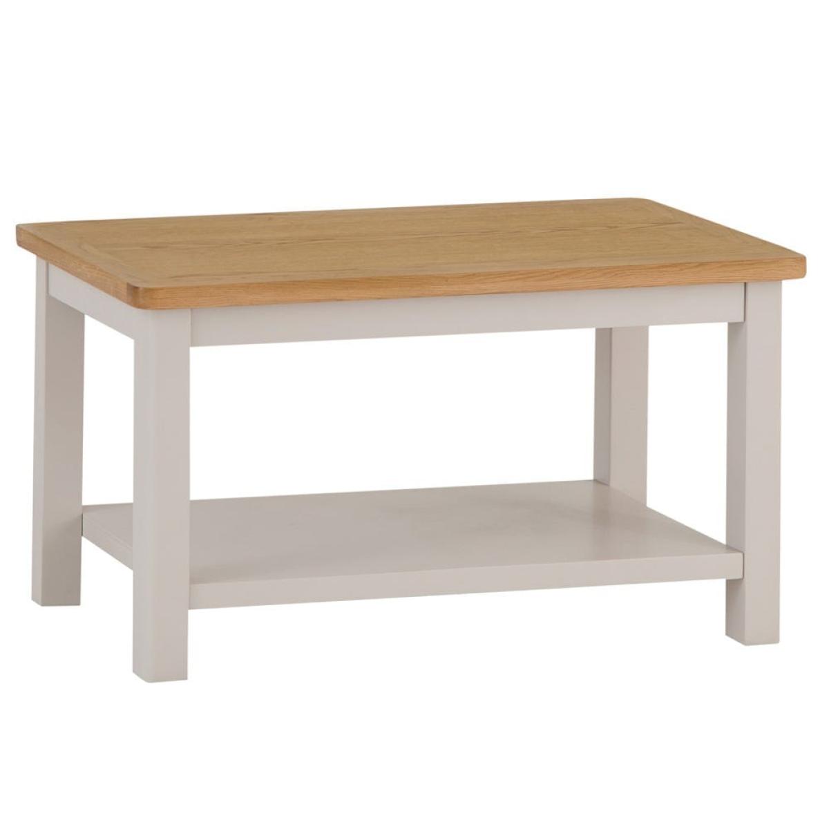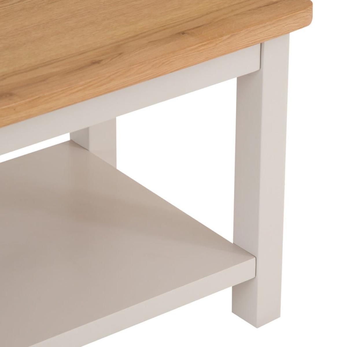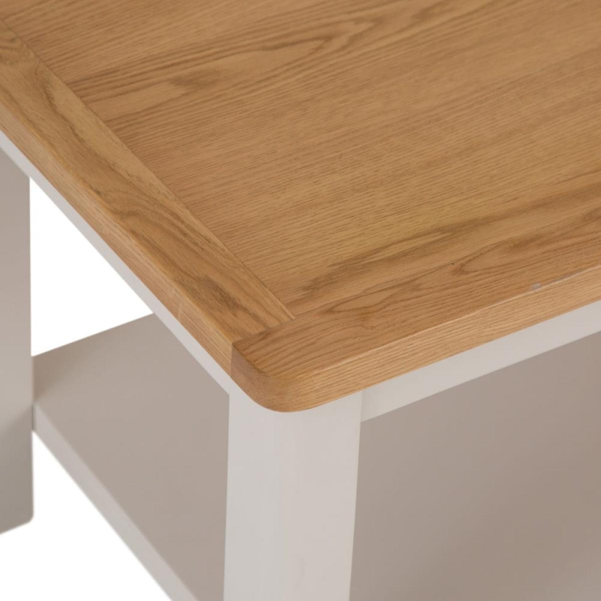 Make your living room even cosier with this Rutland painted oak small coffee table. Its sturdy top is the ideal surface for that mid-morning cup of coffee (or a glass of something chilled at the end of the day). Our stone-grey finish will fit seamlessly into any home, and is complemented by the natural oak top, which has rounded corners for an artisan flourish. The lower shelf can accommodate your choice of books, boardgames and magazines. Dress this coffee table up with your favourite ornaments – whether a bold fruit bowl, bright candles or an elegant vase – to enhance its classic looks.