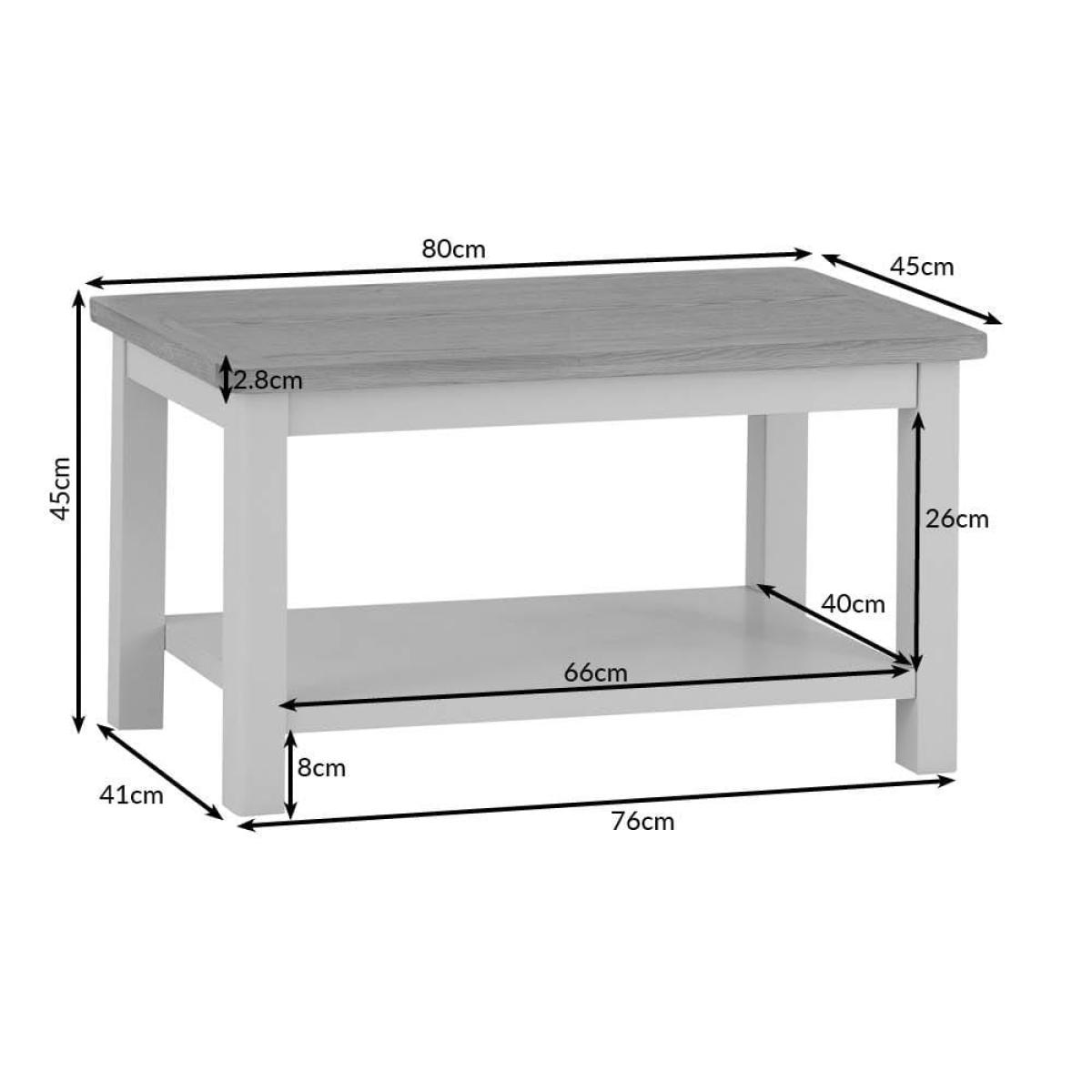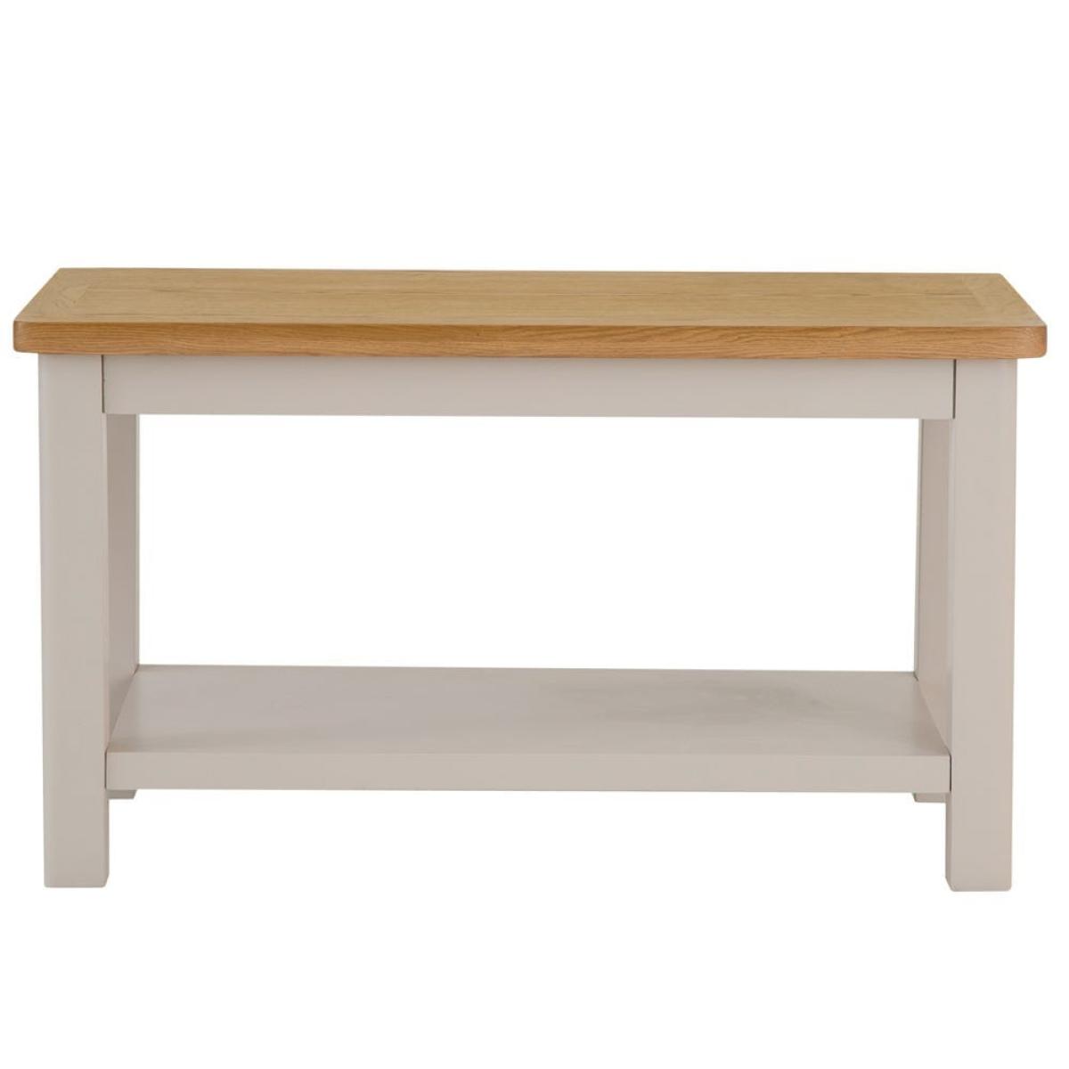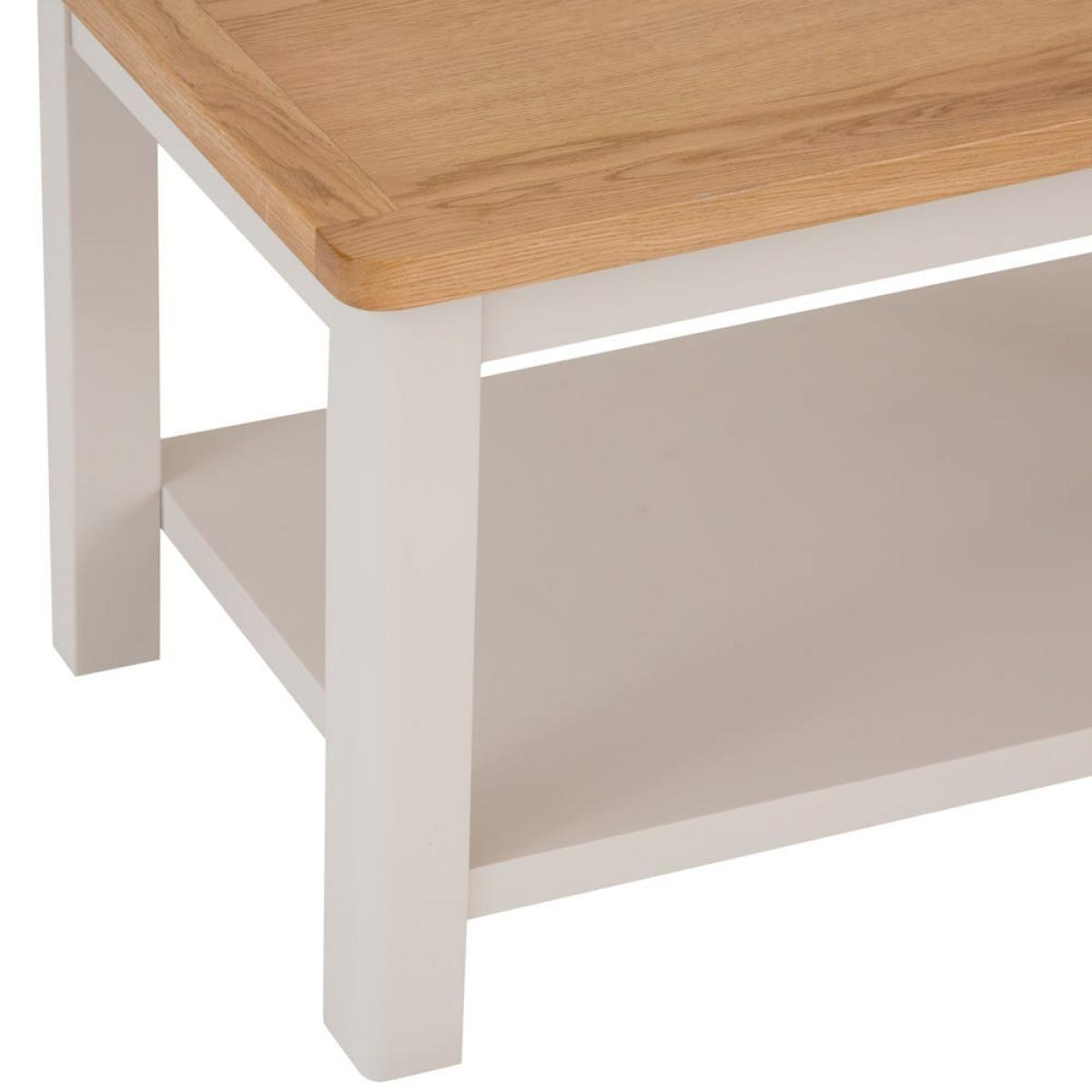 Make your living room even cosier with this Rutland painted oak small coffee table. Its sturdy top is the ideal surface for that mid-morning cup of coffee (or a glass of something chilled at the end of the day). Our stone-grey finish will fit seamlessly into any home, and is complemented by the natural oak top, which has rounded corners for an artisan flourish. The lower shelf can accommodate your choice of books, boardgames and magazines. Dress this coffee table up with your favourite ornaments – whether a bold fruit bowl, bright candles or an elegant vase – to enhance its classic looks.