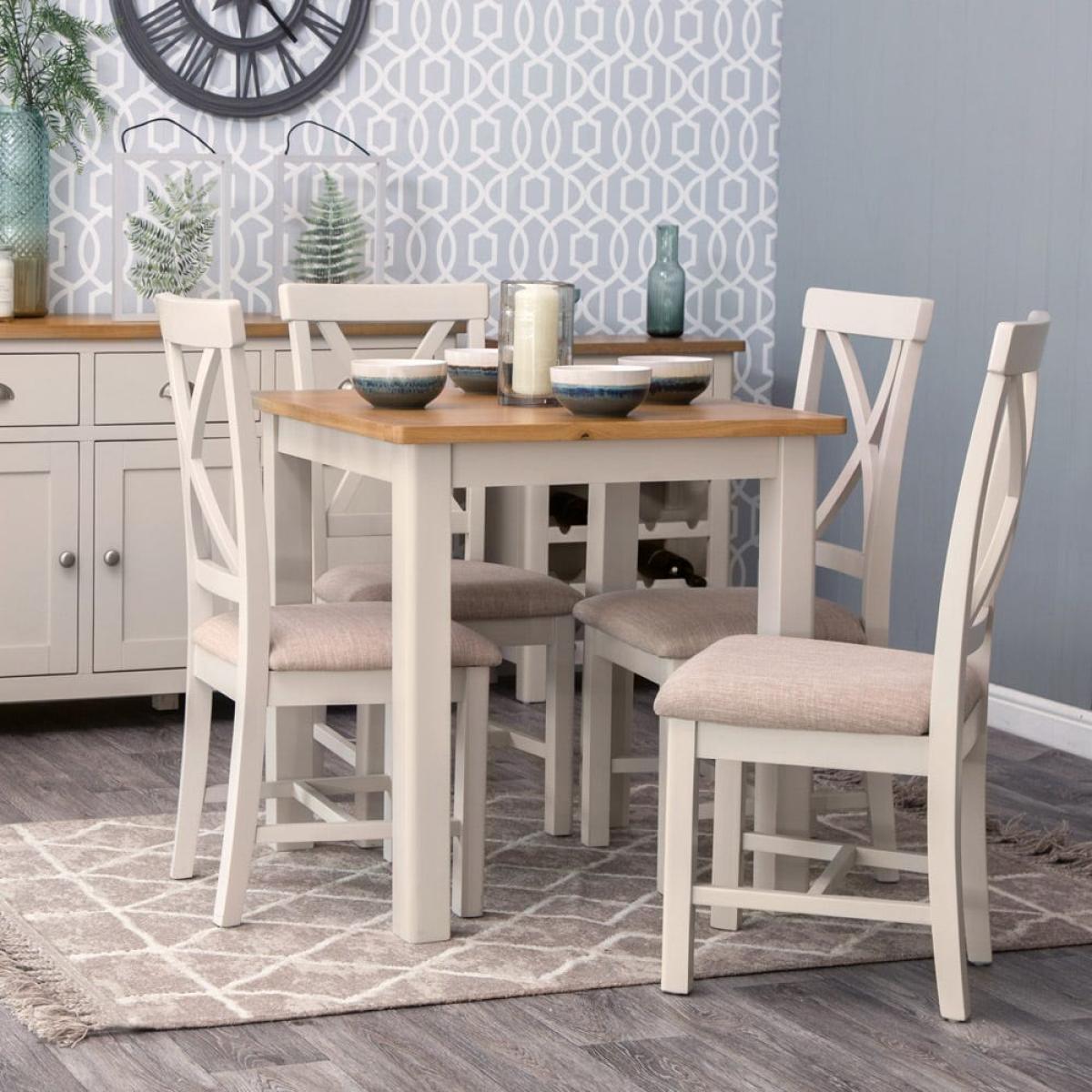 Our Rutland painted oak square fixed top dining table was built for Sunday morning fry-ups and after-school snacks. Its elegant looks make it an irresistible addition to your home. This compact table easily seats a family of four, and the fresh stone-grey hue suits both contemporary and traditional decor. The natural oak top has country-kitchen charm and a smooth finish to withstand accidental spills, while its rounded corners balance the chunky square legs and frame. Pair this table with matching chairs from the same range or choose contrasting designs for a sophisticated set-up when you’re hosting a cosy dinner party.