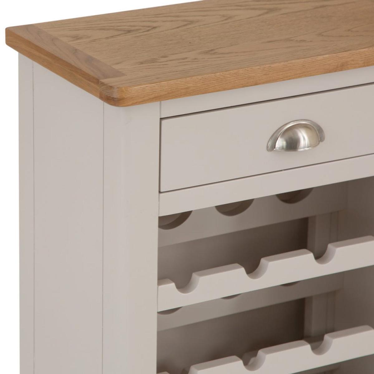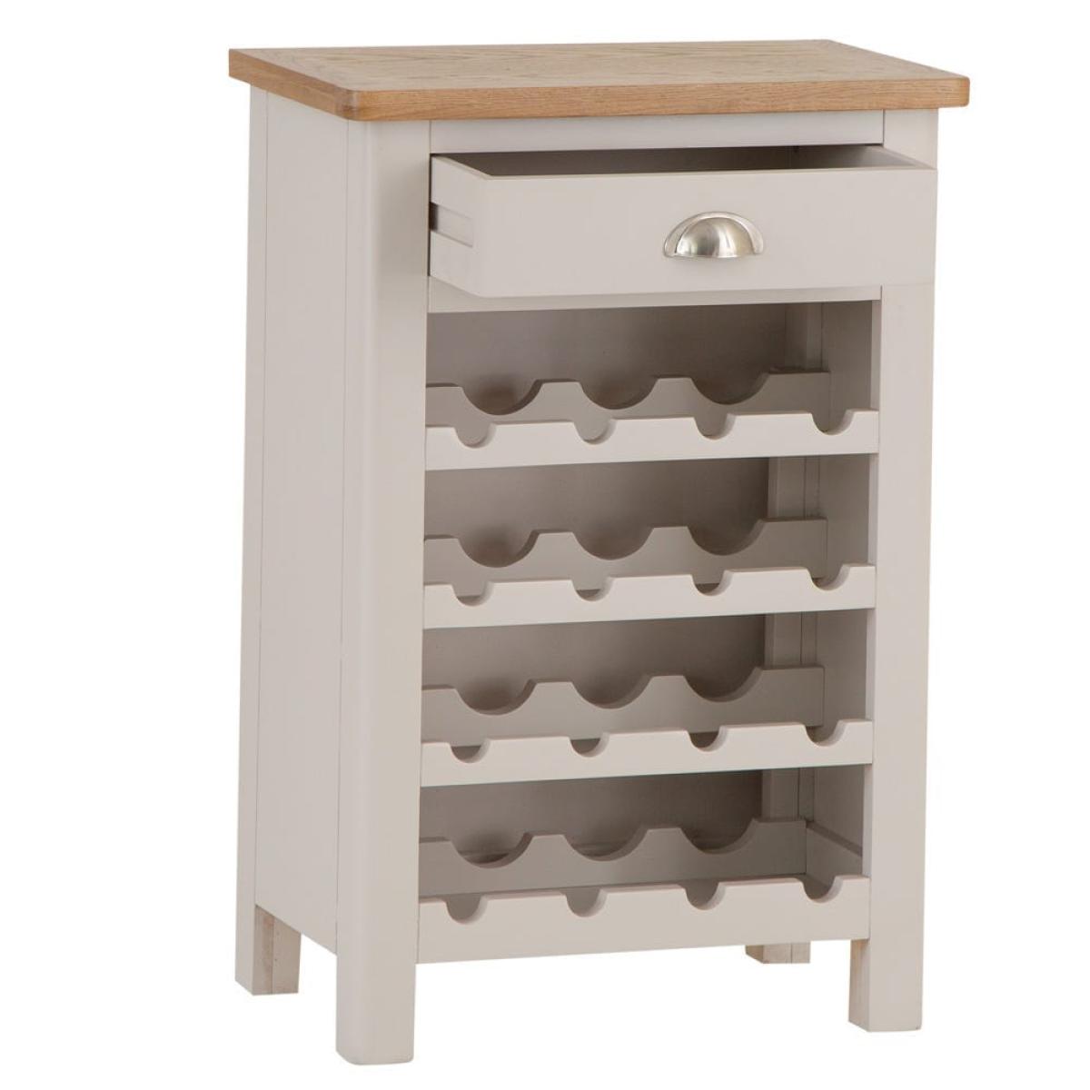 Display your prized vintages in this Rutland painted oak wine cabinet. It has space for 16 bottles of your favourite red, white or rosé, plus a handy drawer for corkscrews, stoppers and foil cutters. The honey-coloured oak top paired with our stone-grey paintwork provides a colour combination that enhances both modern and traditional homes. The rounded corners balance the square legs to complete the balanced feel. Whether you're hosting a special celebration or planning a cheese and wine night, you can be sure of supplies with this spacious wine rack. Light some candles on the top and you’ll be dinner party-ready.