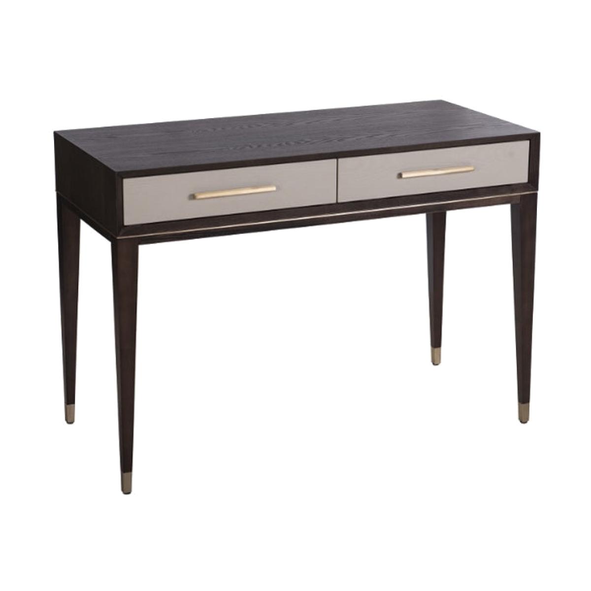 RV Astley’s suave Arnaude ceramic grey and chocolate dressing table features meticulous design and flawless finishes. Beneath its sleek chocolate surface are two slender ceramic grey drawers with charming cream handles. Long tapered legs are detailed with discreet and elegant antique gold ends. Measuring 110cm wide, 50cm long and 76.5cm high, the Arnaude forms part of a sophisticated trio including an equally elegant bedside table and chest of drawers. RV Astley’s dapper dressing table also makes a slick home office desk or a fabulous hall console table. This dynamic dressing table delivers a structured style to your home’s overall aesthetic. Ideal for multi-faceted, stylish interiors. Dimensions: L:50 x W:110 x H:76.5 cm