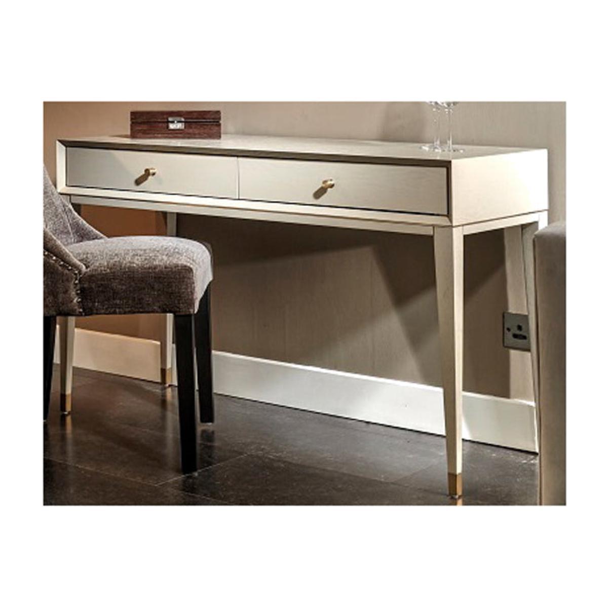 This timeless RV Astley Bayeux ceramic grey dressing table is a sleek and elegant piece, guaranteed to bring a touch of sophistication to your bedroom, dressing room or hallway. With a ceramic grey finish and brass touches on the legs and drawer pulls, it will complement a full scope of décor and colour schemes. Standing 76. 5cm tall, with a length of 50 cm and width of 120cm and two drawers, this classic table provides ample storage and display space while remaining streamlined. Its subtle beauty is sure to add an element of delicate luxury to any style and size room. Requires some assembly. *Moot Trading Ltd is not a lender and acts only as an introducer. The credit product is provided by Klarna Bank AB (publ). Credit is only available to permanent UK residents aged 18 and over, subject to status. Terms and conditions apply. Please note that the following products are not regulated by the FCA: Pay in 30 days and Pay in 3 instalments. Read More.