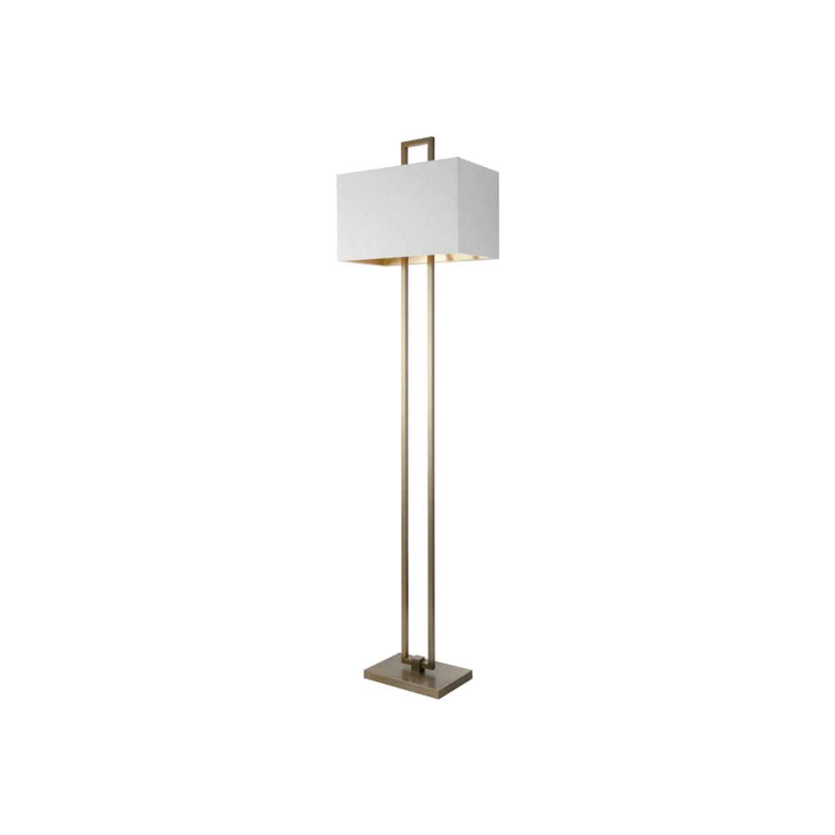 This antique brass Danby Floor Lamp fuses new with old in stunning fashion. It features a traditional brass finish paired with smooth, contemporary lines in a design that is truly refined. Twin me. View More. This antique brass Danby Floor Lamp fuses new with old in stunning fashion. It features a traditional brass finish paired with smooth, contemporary lines in a design that is truly refined. Twin metal necks extend gracefully from a ringlet on the base and are fused together at the top of the lamp for a stylish twist. The look is completed with a square lampshade that beautifully complements the angles of the base and neck. The base of this piece is 18cm deep and 17cm wide, and the shade is 25cm high and 41cm deep. The lamp requires an E14 bulb max 40. W.