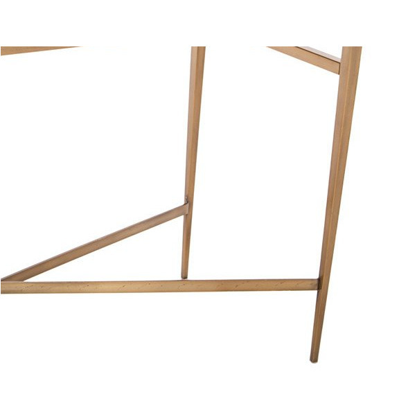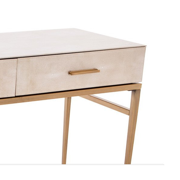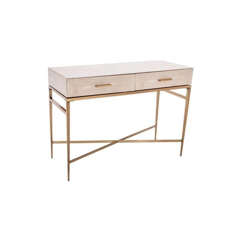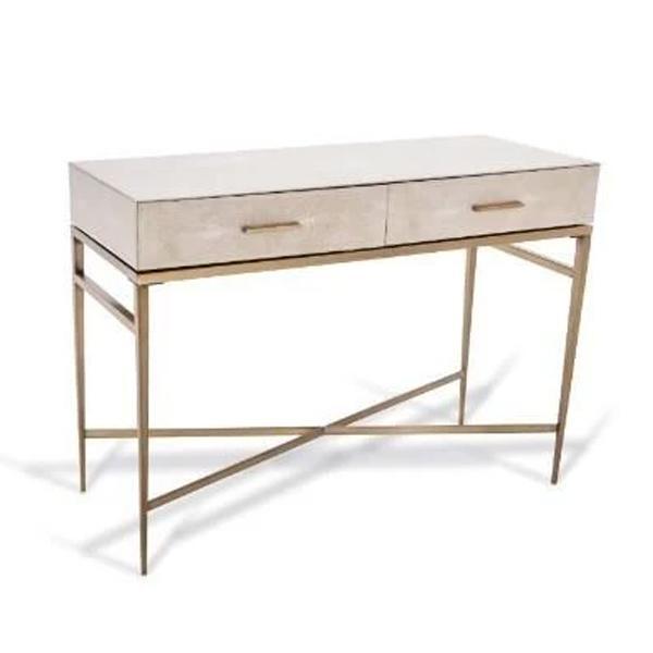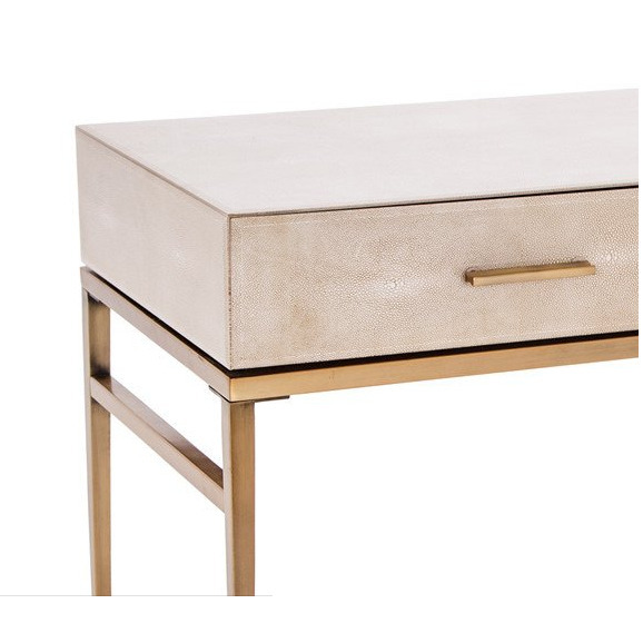 The Esta console table is an exceptionally striking piece created by RV Astley. The antique brass colour of the minimalist frame is perfectly balanced and complemented by the delicate biscuit tones of the shagreen-effect two-drawer top, encased in glass for practicality and beauty. With its classic long, narrow shape and neutral tones, this console table fits well into a hall or sits gracefully in a larger room, lending any space a contemporary elegance. Perfect for displaying a sculpture, pair of statement vases or striking lamp from the RV Astley range, this table gives convenient storage a beautiful lift to something wonderful.