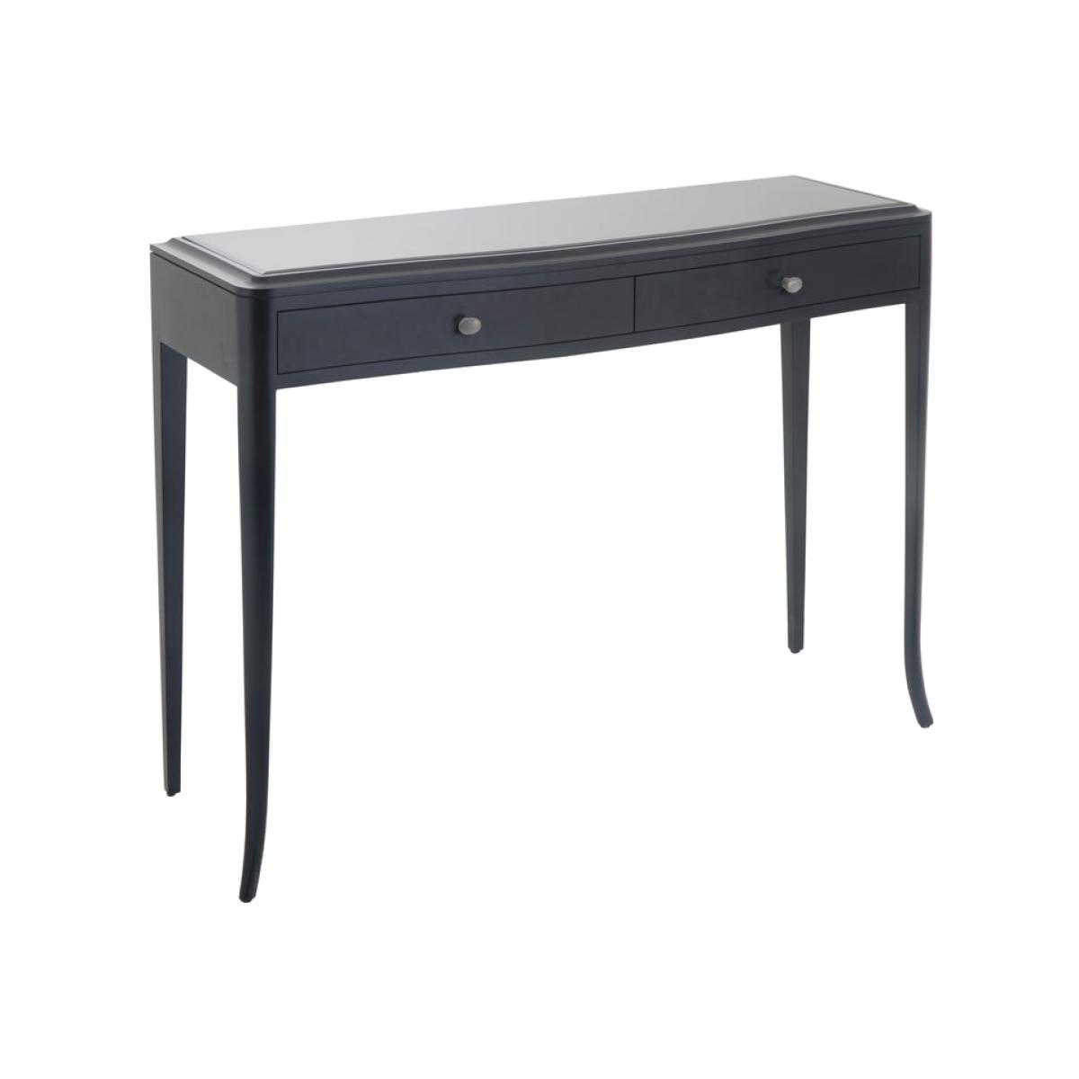 The RV Astley Maxton dressing table is a slimline piece of furniture that will bring character to the bedroom or dressing space. Made from black finish mahogany, the dressing table has two drawers,. View More. The RV Astley Maxton dressing table is a slimline piece of furniture that will bring character to the bedroom or dressing space. Made from black finish mahogany, the dressing table has two drawers, both of which have brushed nickel handles. The table top is made of black glass, giving this piece a real sophisticated and classy look. Measuring D: 40cm x W: 111cm x H: 80cm, the table has added detail on the legs and surface edge, and is ideal for keeping personal accessories tidied away. This timeless table will coordinate with a range of other bedroom furniture and decor.
