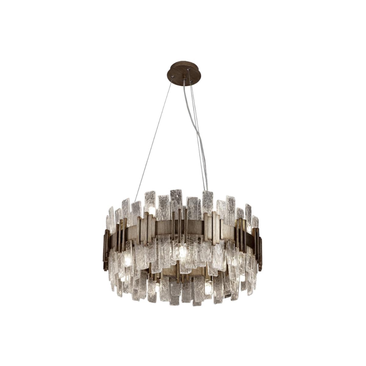 A statement piece chandelier, created by using textured glass and antique gold painted finish. Requires 10 x G9 bulb max 40W Dimensions:Dia: 60 x H: 28 cm
