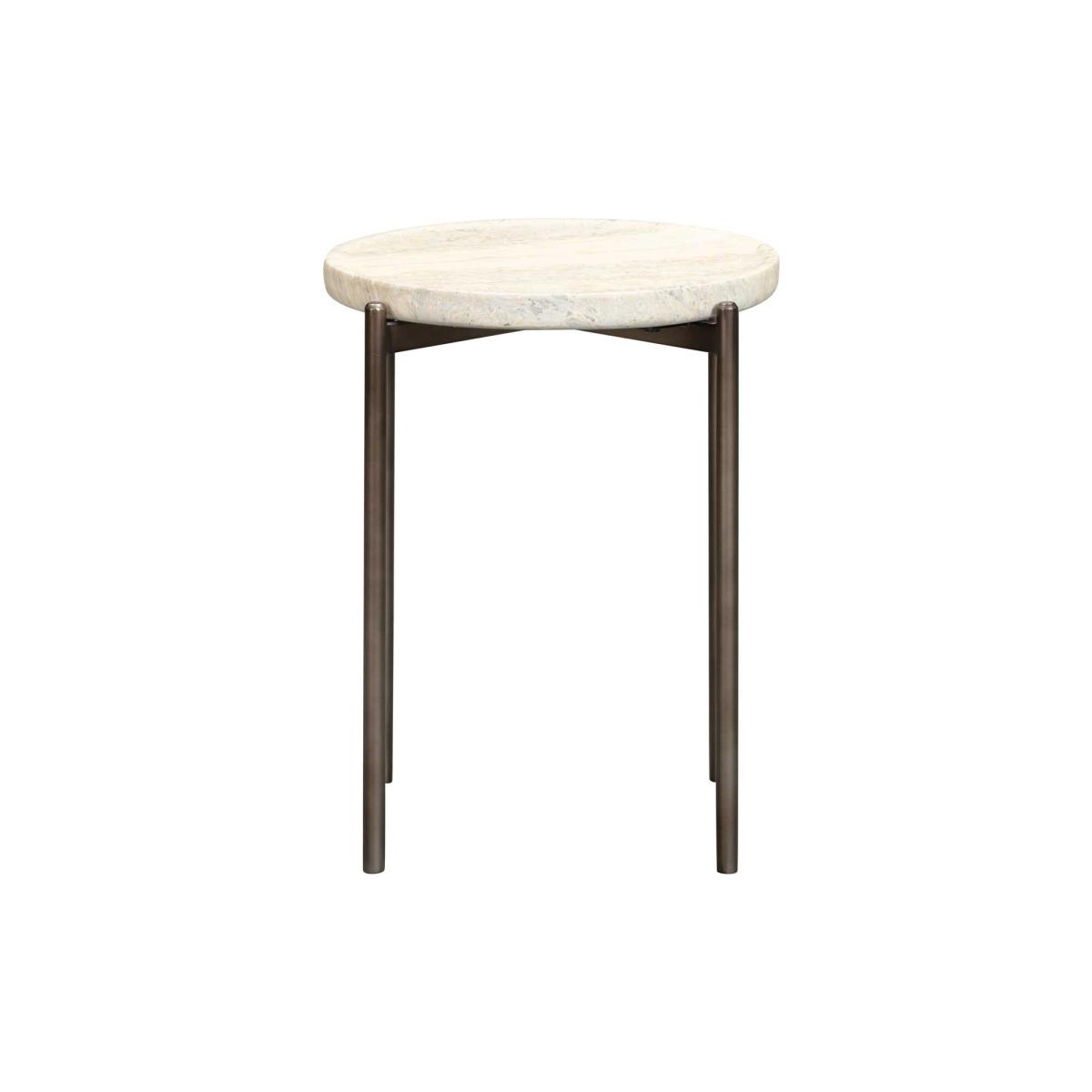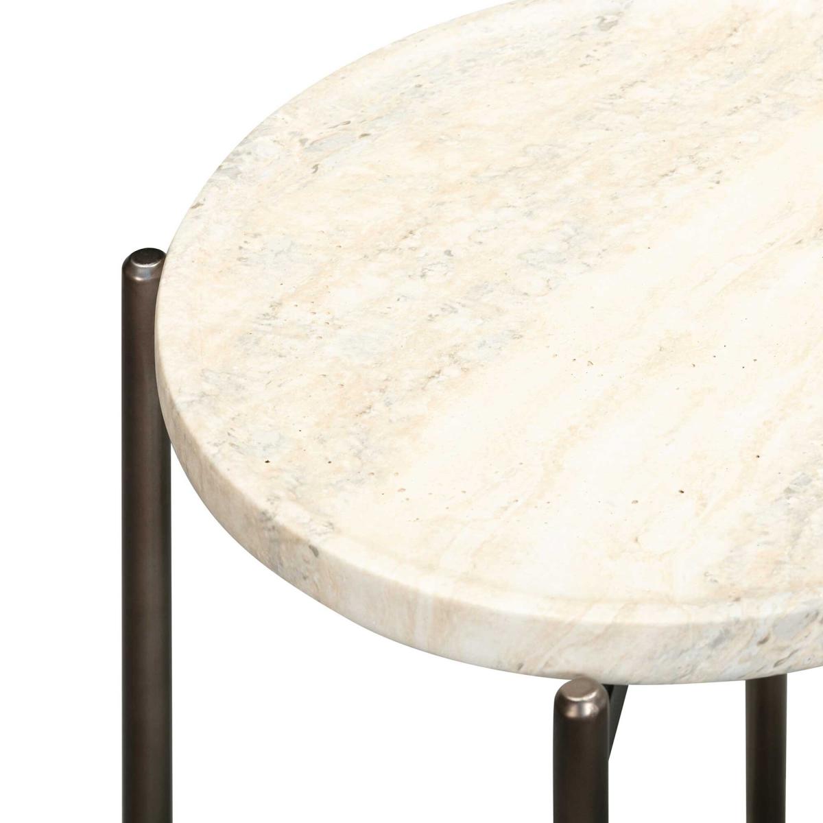 This stylish low side table features a faux travertine top with a smooth, natural stone-like finish, perfectly paired with sturdy chocolate brown legs. Designed for indoor use, it also complements a garden setting beautifully, adding warmth and charm to any space. Its compact height makes it ideal for displaying plants, books, or decorative pieces. With its earthy tones and timeless appeal, this versatile table is a perfect accent for both modern and classic aesthetics.