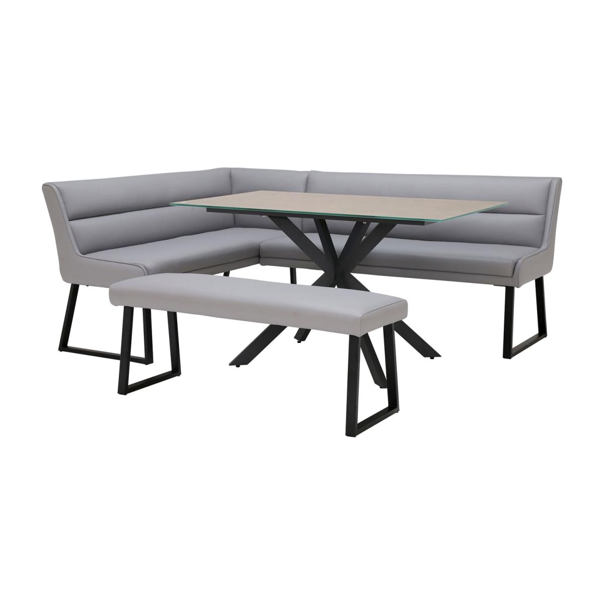 The Ryker right hand facing corner dining set is comprised of a corner bench and dining bench upholstered in supple grey faux leather, alongside a modern dining table with dark greymetal legs and a grey ceramic top. Incredibly comfortable and full of contemporary style, this corner bench dining table looks just as good in a dining room as it does in the kitchen. Durable and easy to clean, the quality materials make mealtimes a breeze, while complementing a wide variety of colour schemes.