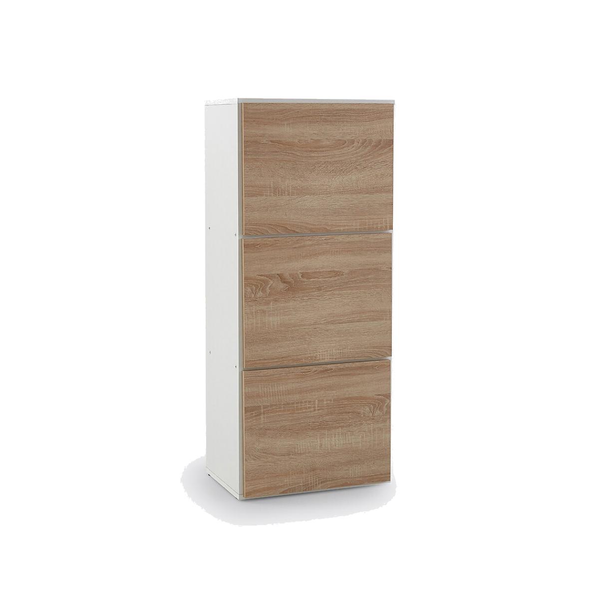 I really rate this slim three-door shoe unit for busy homes - it tucks neatly into narrow halls without skimping on capacity. The oak-effect fronts paired with white sides suit Scandi, contemporary and minimalist schemes alike, and the lightweight flip-down doors keep shoes out of sight while still easy to reach. For styling, top it with a shallow tray or matching storage baskets to catch keys and post, and hang a slim mirror or floating shelf above to make the most of your entryway. Inside, use clear shoe boxes or labelled bins to group footwear by season, so everything stays organised and ready to grab.