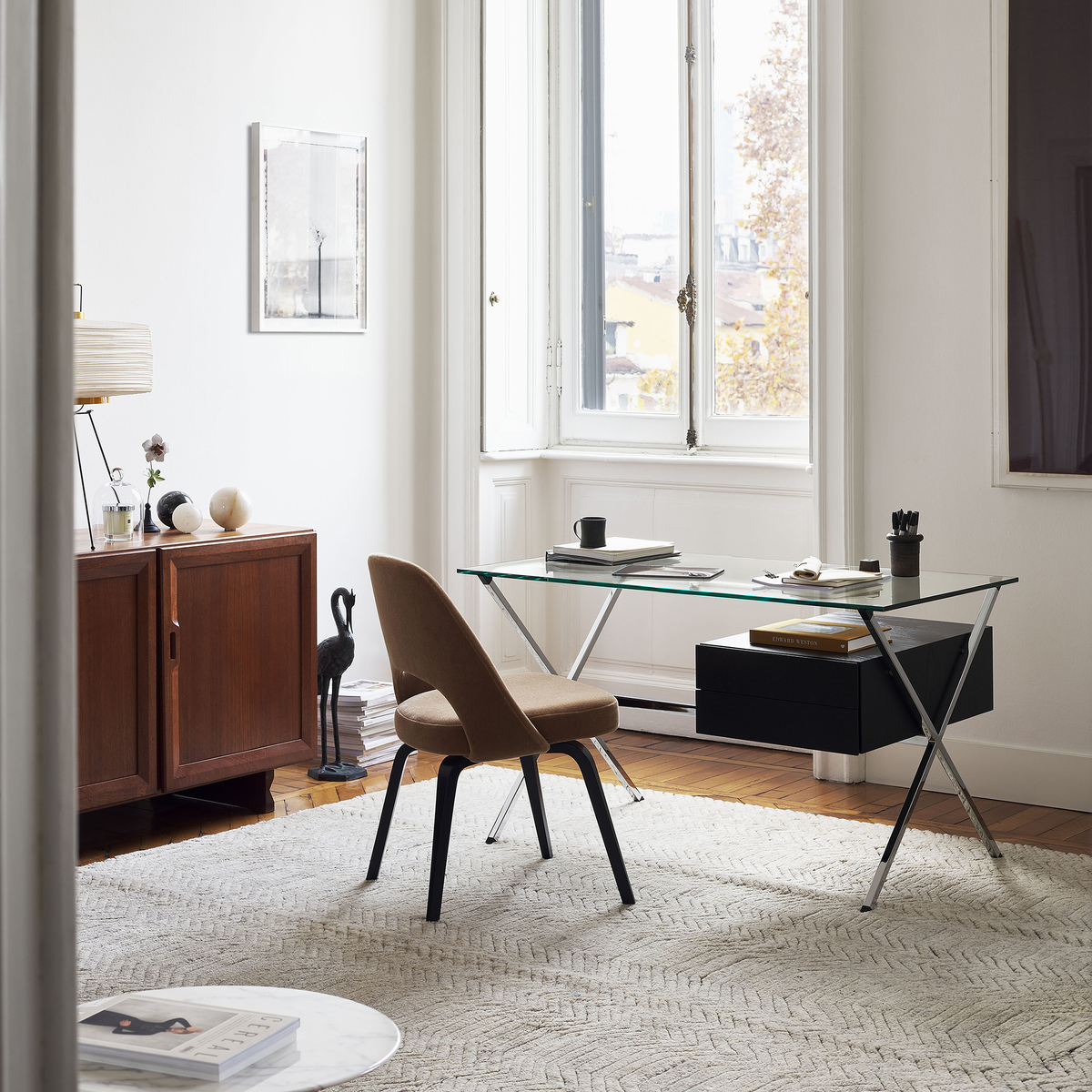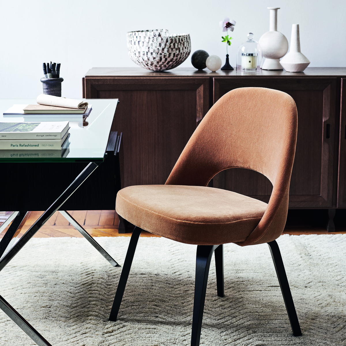 An iconic design by Eero Saarinen, the Conference Chair, shown here with elegant walnut legs and Knoll's Cato fabric upholstery, was first introduced in 1950 and revolutionised the notion of what executive seating could be. With simple semi-circular shaping and a streamlined silhouette, the Saarinen Conference Chair offers uncomplicated comfort through its fluid and sculptural form. Its contemporary style is accented by several colours of Cato fabric upholstery; Knoll's Cato fabric was introduced in 1961 and is crafted from a wool-mix composition, with an exaggerated texture that makes it the ultimate accent. Supported by four stained walnut legs, the Saarinen Conference Chair is awarded a rustic touch with the rich, natural grain of the wood, which contrasts beautifully with the soft woven texture of the upholstery. Ideal as a comfortable side chair at a dining table or the perfect accent to a workspace, the Saarinen Conference Chair presents a stylish design combined with minimalist style, and is still to this day made by renowned manufacturer Knoll. The Saarinen Conference Chair is available in fire red, green, grey, ivory, brown, natural and sand hues.