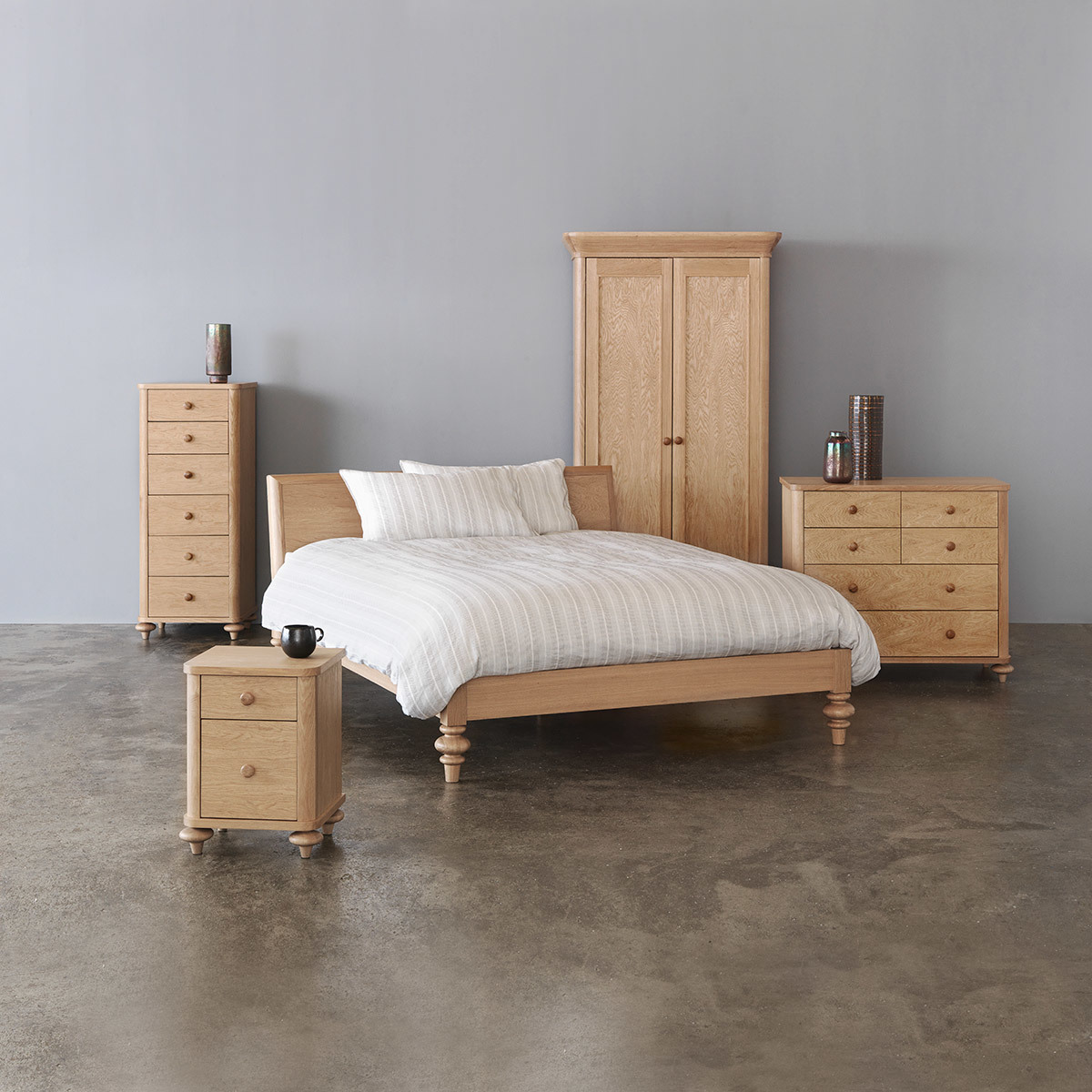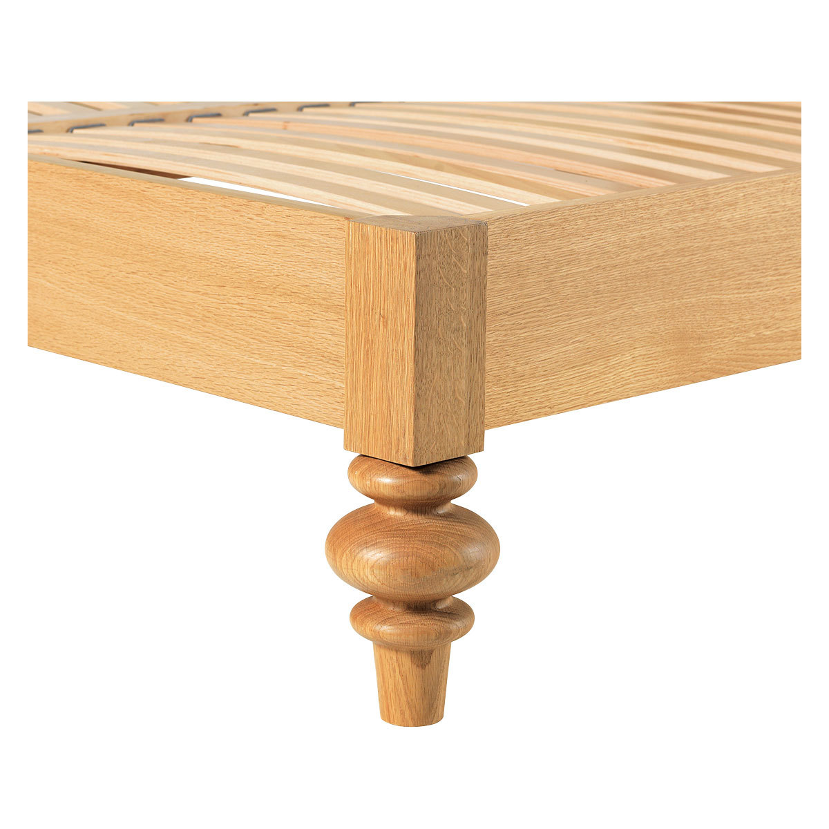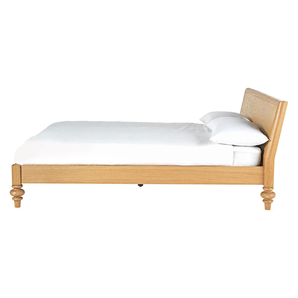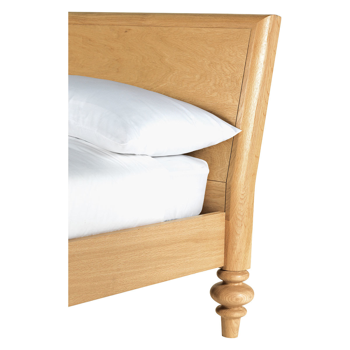 The Sabine oak double bed with turned feet is a substantial design with a distinctive personality, beautifully crafted with feature oversized feet. The wild oak veneered headboard showcases the wood's beautiful grain and is slightly reclined for comfort when sitting up in bed. Designed in house by Matthew Long and exclusive to Habitat, the bed is made from solid and veneered oak, and is part of the Sabine bedroom furniture range, constructed to last, these quality pieces will be passed from generation to generation. The bed fits a standard 135cm double mattress and is also available as a kingsize bed.