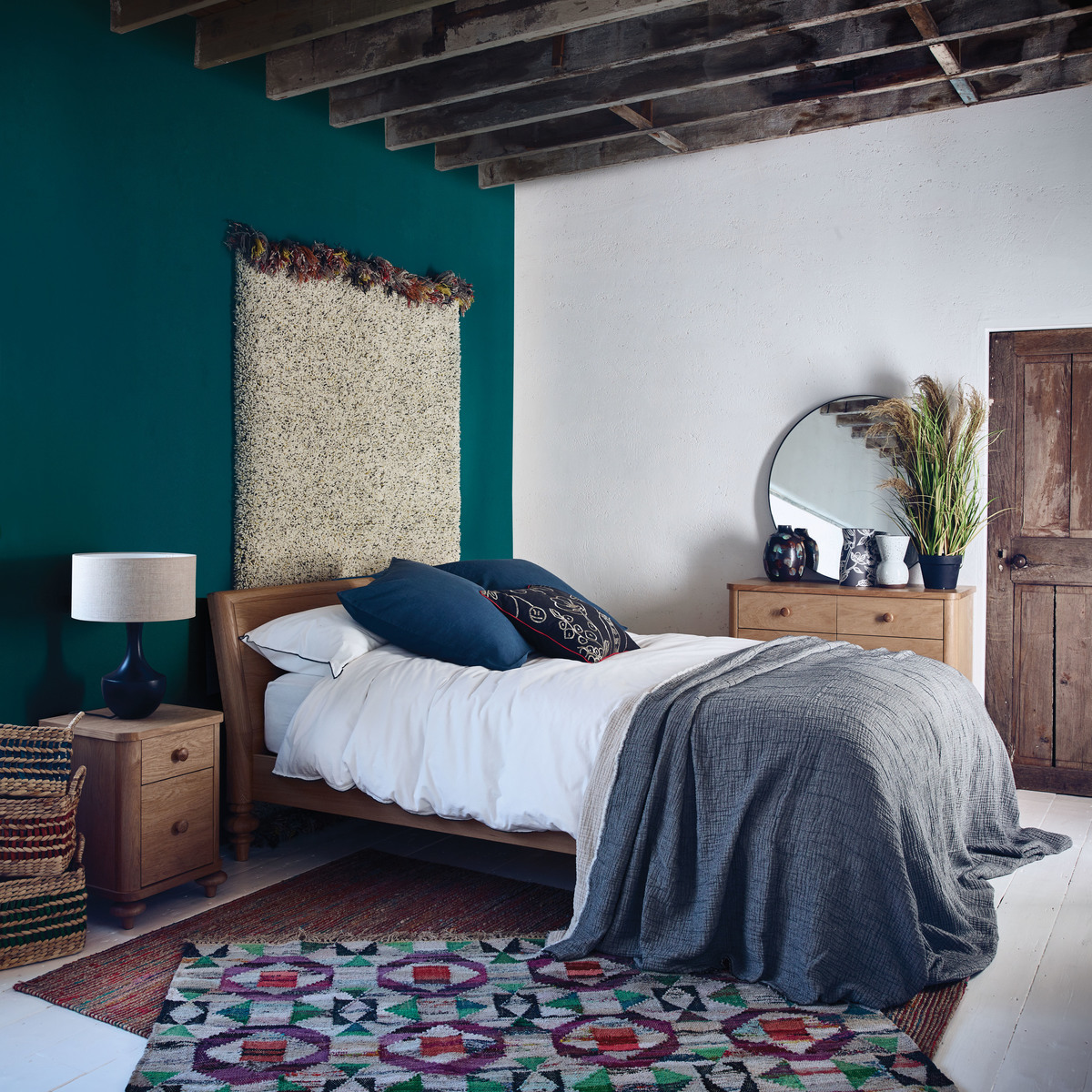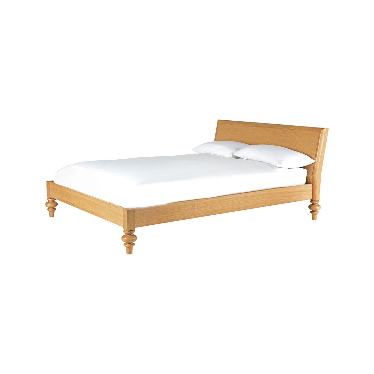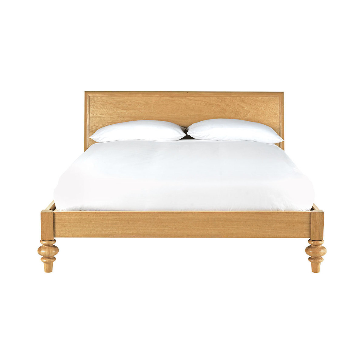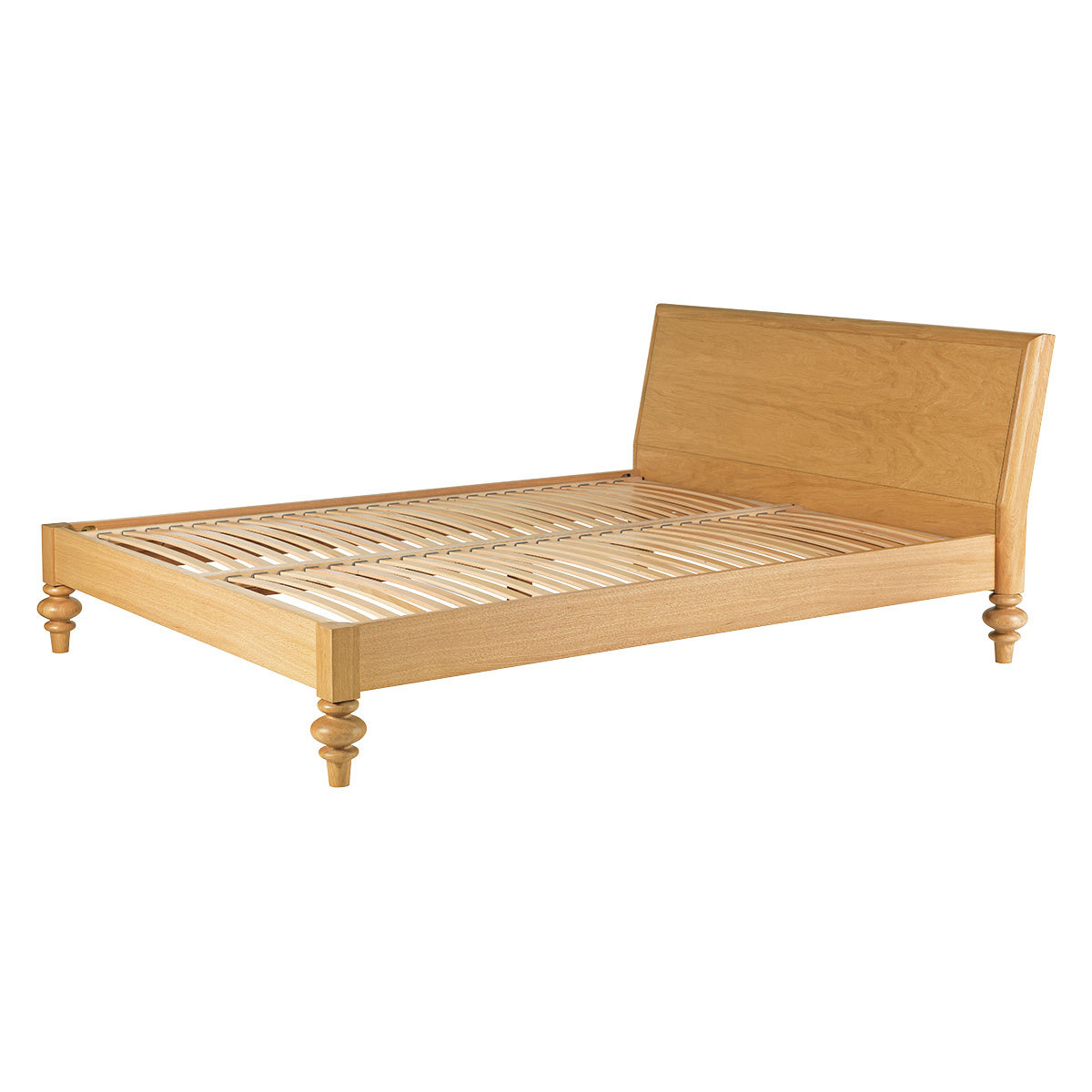 The Sabine oak kingsize bed with turned feet is a substantial design with a distinctive personality, beautifully crafted with feature oversized feet. The wild oak veneered headboard showcases the wood's beautiful grain and is slightly reclined for comfort when sitting up in bed. Designed in house by Matthew Long and exclusive to Habitat, the bed is made from solid and veneered oak, and is part of the Sabine bedroom furniture range, constructed to last, these quality pieces will be passed from generation to generation. The bed fits a standard 150cm kingsize mattress and is also available as a double bed.