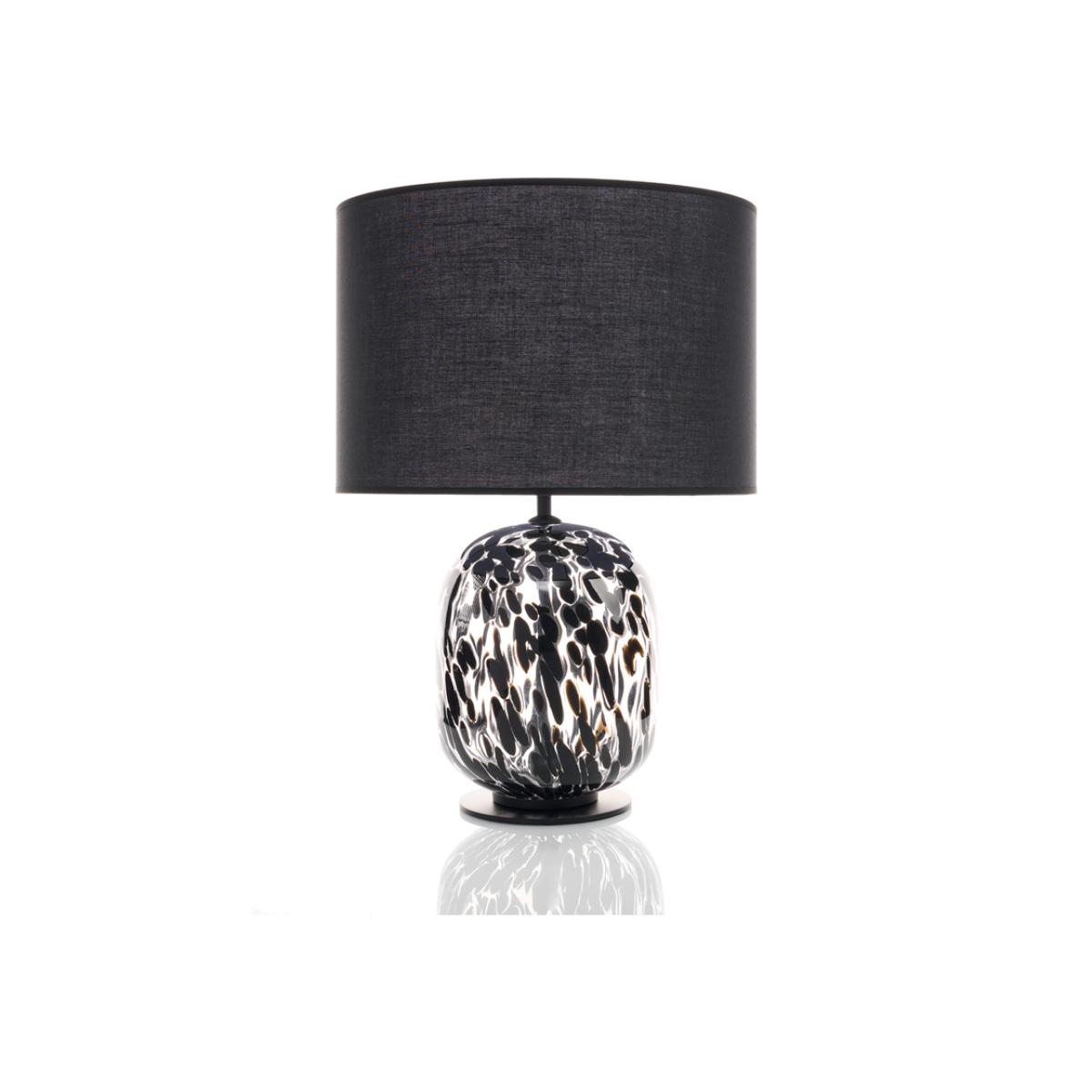 A stylish contemporary table lamp with ‘confetti’ glass base. Black metal details. Black fabric shade. Woven fabric cable with in-line switch. 40W E27 LED bulb included.