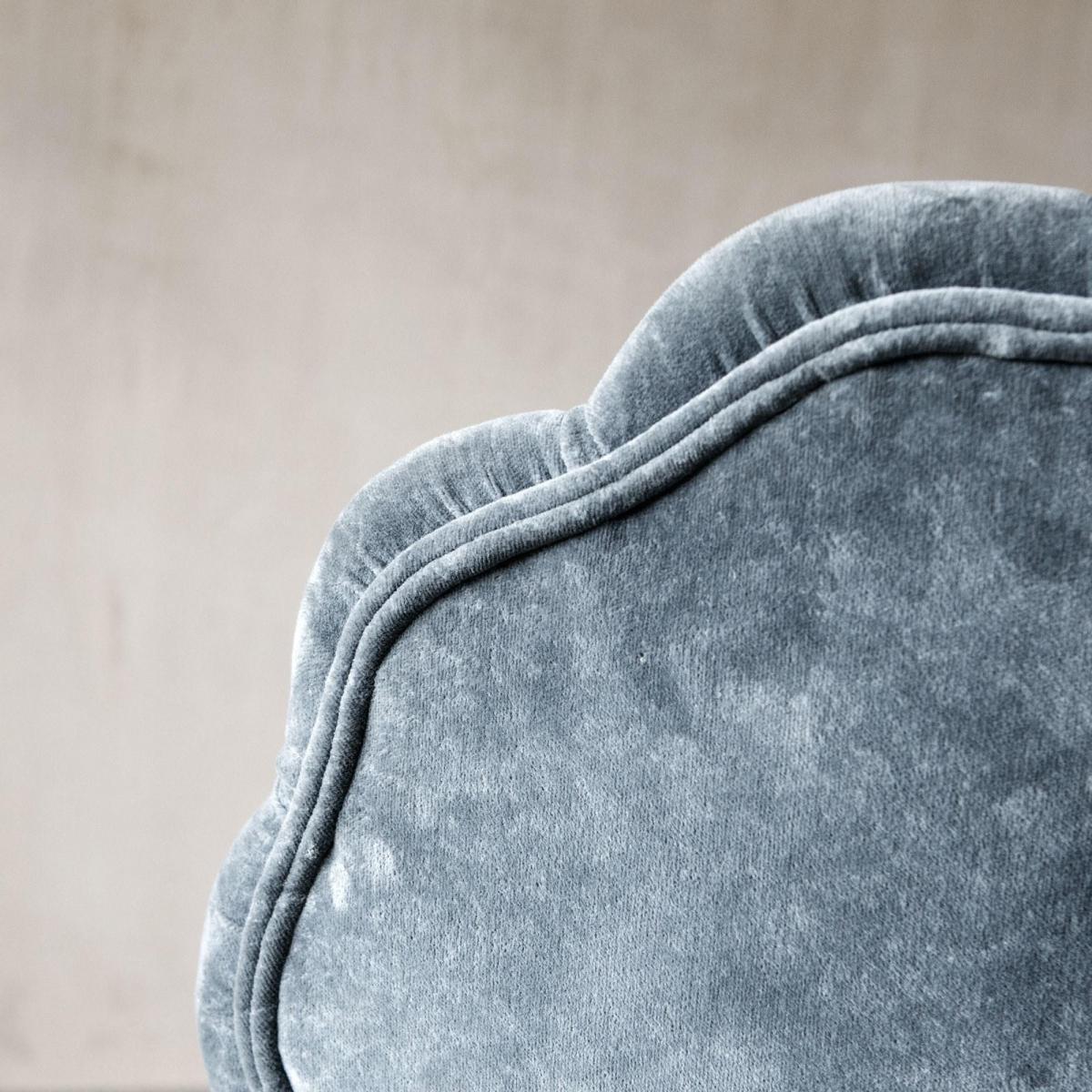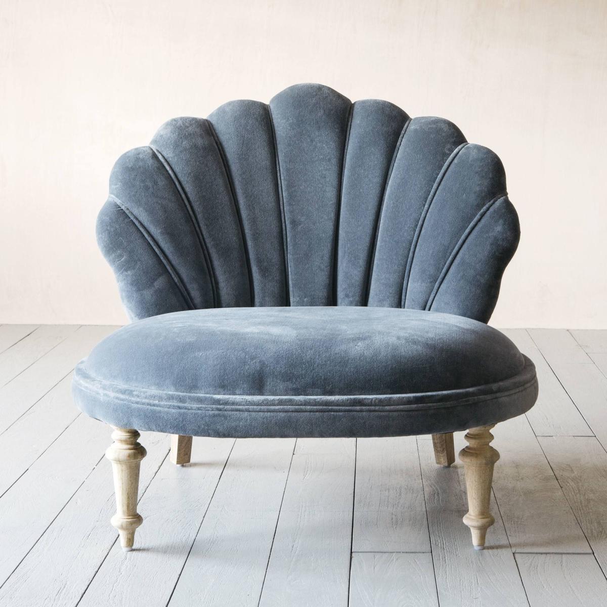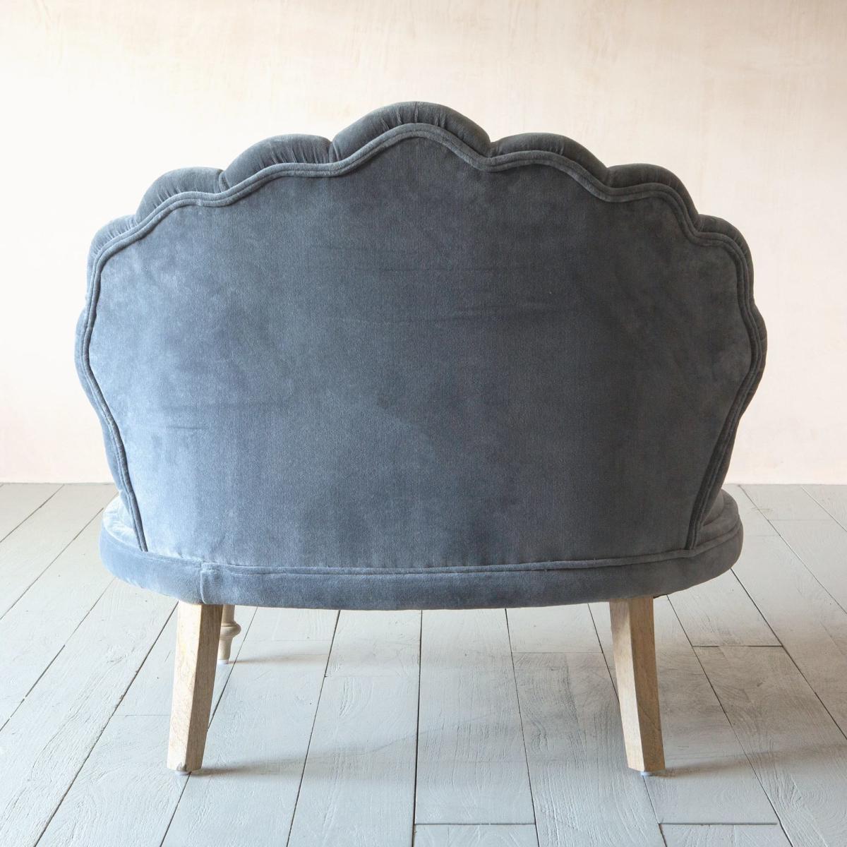 Spacious enough for two, our Sabrina clam chair features a curved, scalloped back with piping details, upholstered in luxurious grey velvet and finished with turned mango wood legs.
