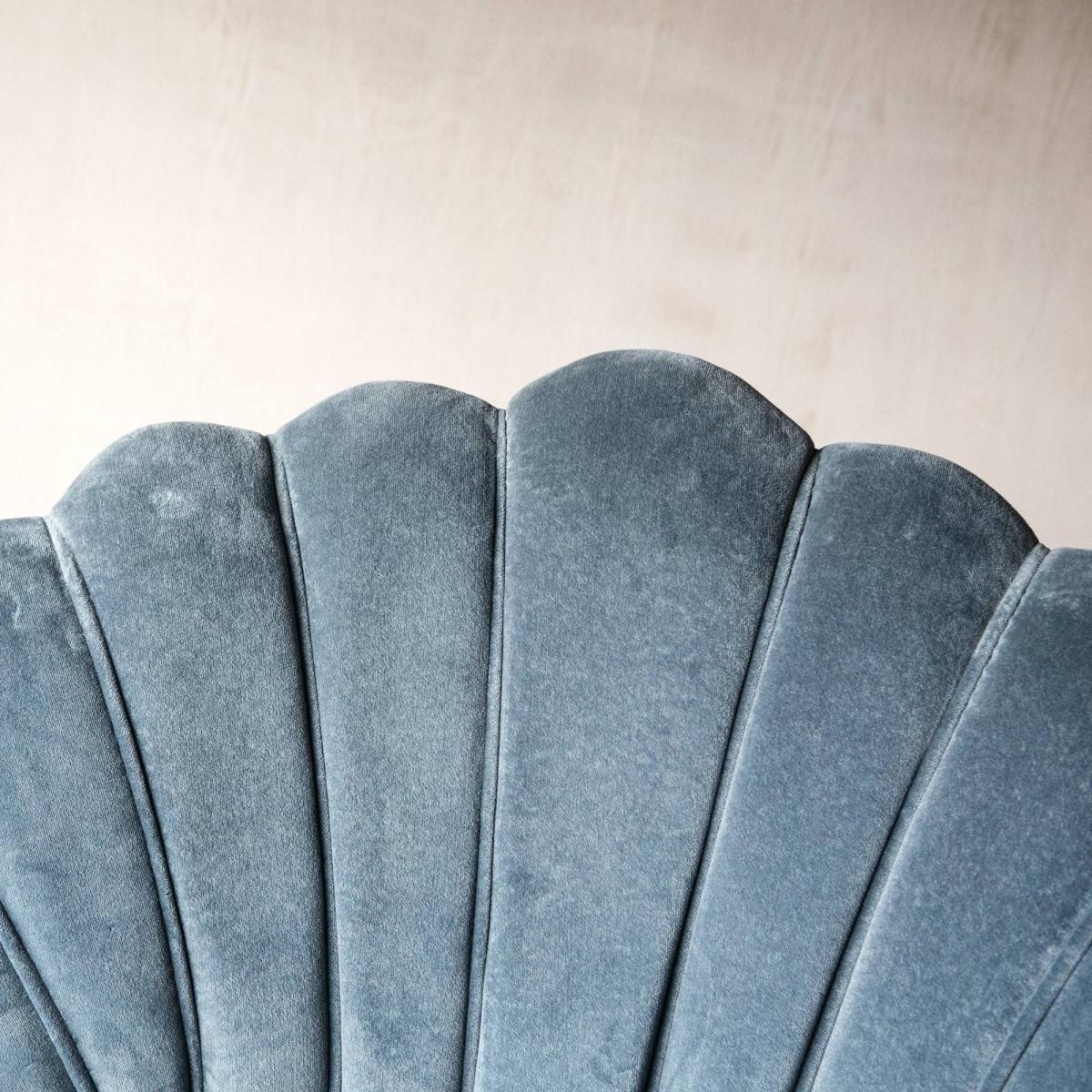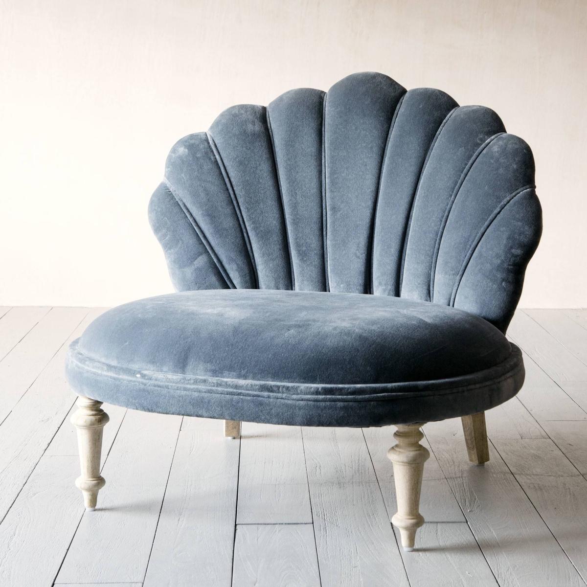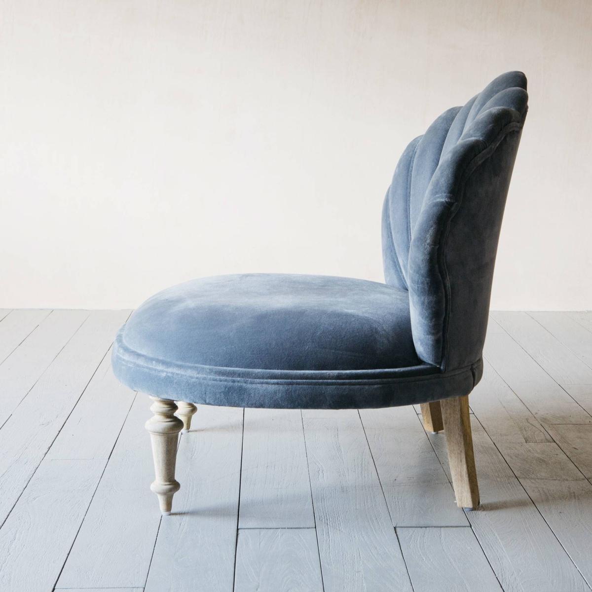 Spacious enough for two, our Sabrina clam chair features a curved, scalloped back with piping details, upholstered in luxurious grey velvet and finished with turned mango wood legs.