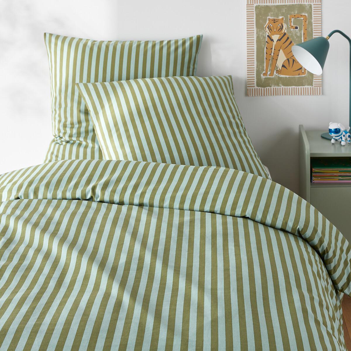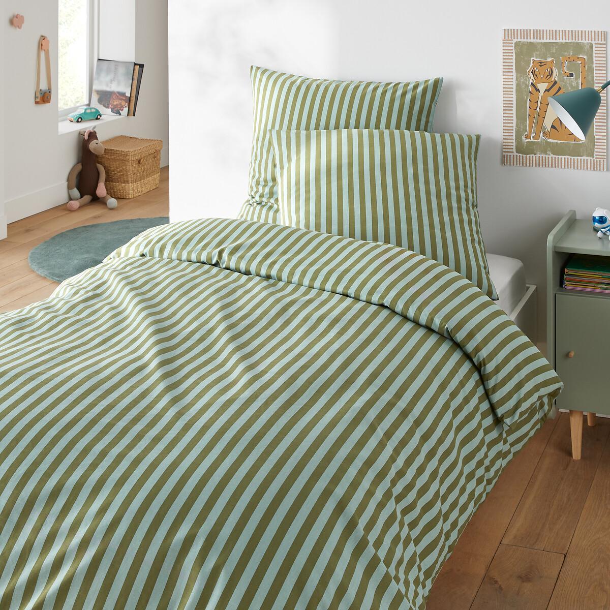 A vibrant world, where striped prints come together in monochrome shades. Sacha Pink, Sacha Green... contemporary duvet sets to mix and match to your heart's content. Designed by La Redoute Interiors. Cotton is part of our daily lives. We love it for its suppleness and softness. Easy Care, it is ideal for the beds of young and old alike!Product Details • 100% cotton, 115g/m2 • Contains 50% recycled cotton • 144 thread count • Striped print both sides • Straight buttoned hem. As the seasons change, add your own personal touch by mixing the Sacha range with our range of Scénario plain cotton bed linen. Care Advice • Machine washable at 40°CDimensions • Duvet cover (140 x 200cm) + 1 square pillow case (63 x 63cm): Single • Recycled cotton. Using recycled cotton is all about conserving resources and reducing waste. • OEKO-TEX® Standard 100. Standard 100 certification by OEKO-TEX® tests textile products for harmful substances via an independent, international label.