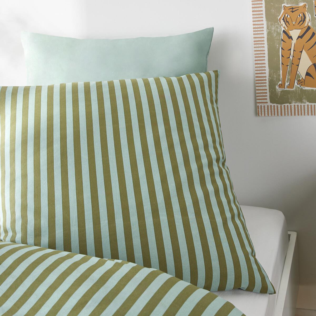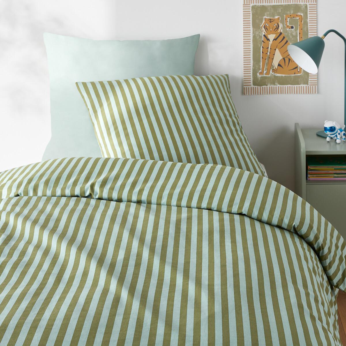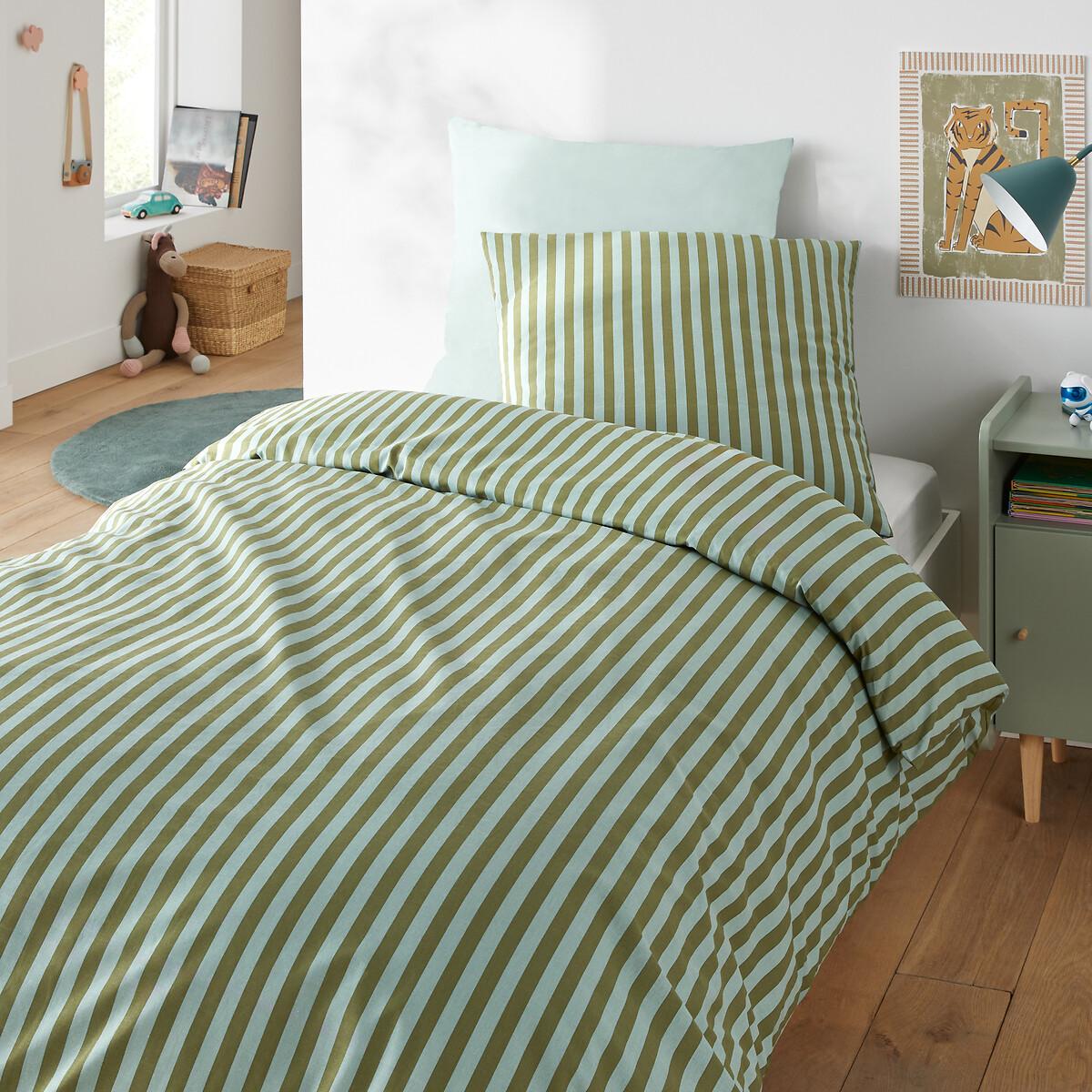 A vibrant world, where striped prints come together in monochrome shades. Sacha Pink, Sacha Vert... contemporary duvet sets to mix and match to your heart's content. Designed by La Redoute Intérieurs. Cotton is part of our daily lives. We love it for its suppleness and softness. Easy Care, it is ideal for the beds of young and old alike!Product Details • 100% cotton, 115g/m2 • Contains 50% recycled cotton • 144 thread count • Striped print both sides • Straight buttoned hem. As the seasons change, add your own personal touch by mixing the Sacha range with our range of Scénario plain cotton bed linen. Care Advice • Machine washable at 40°CDimensions • Duvet cover (140 x 200cm) + 1 square pillow case (63 x 63cm): Single • Recycled cotton. Using recycled cotton is all about conserving resources and reducing waste. • OEKO-TEX® Standard 100. Standard 100 certification by OEKO-TEX® tests textile products for harmful substances via an independent, international label.