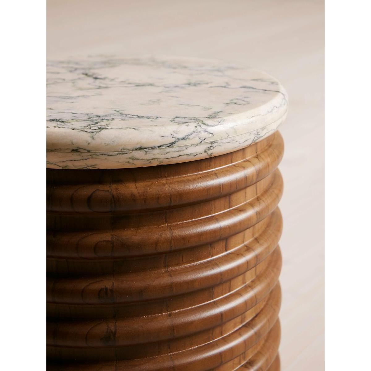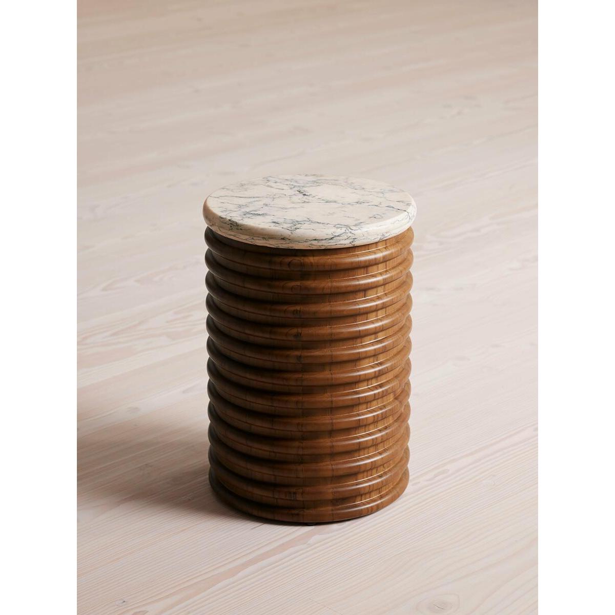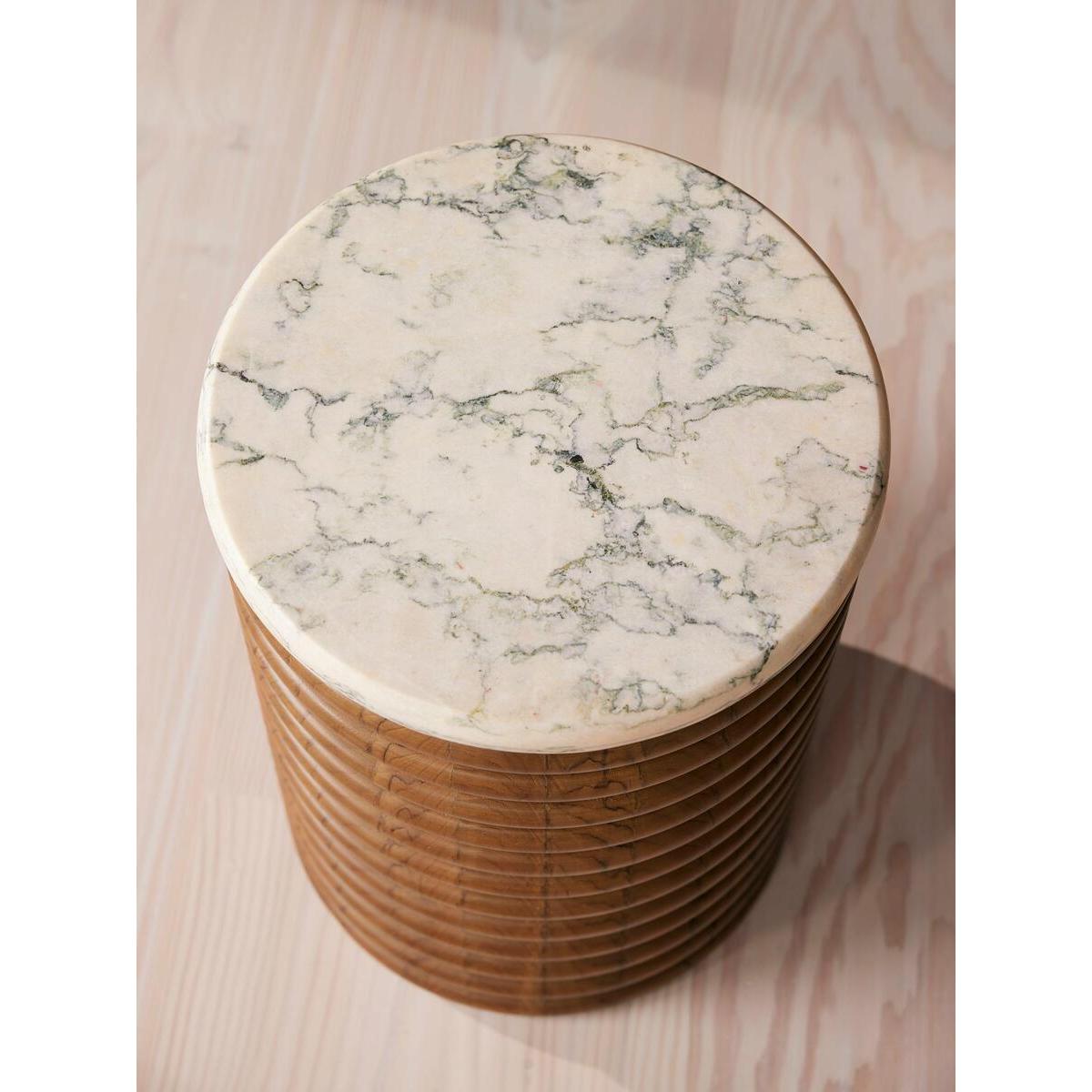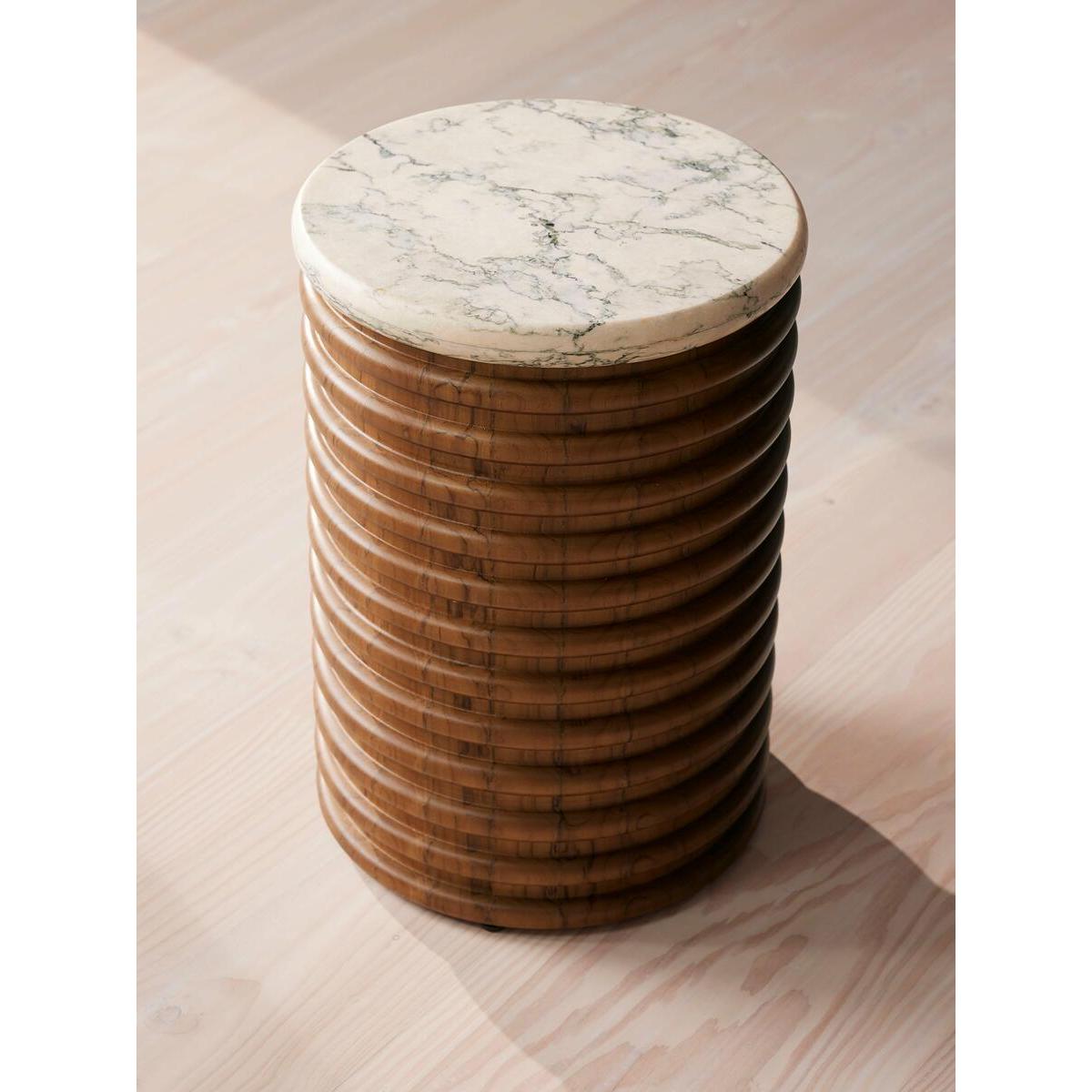 I really like this side table for its bold yet refined look. The green lotus marble top adds a touch of elegance and can serve as a subtle colour pop, especially in more neutral interiors. The ribbed, earthy base works well to ground the piece, making it versatile enough to slot into both contemporary and boho spaces. Tip: pairing it with textured fabrics or natural materials like wicker and linen enhances its organic feel. It's perfect as a side for a sofa or bed, and its compact size makes it great for smaller rooms or as an accent piece. Just be mindful of its delicate surface-using coasters or trays will help keep it pristine.