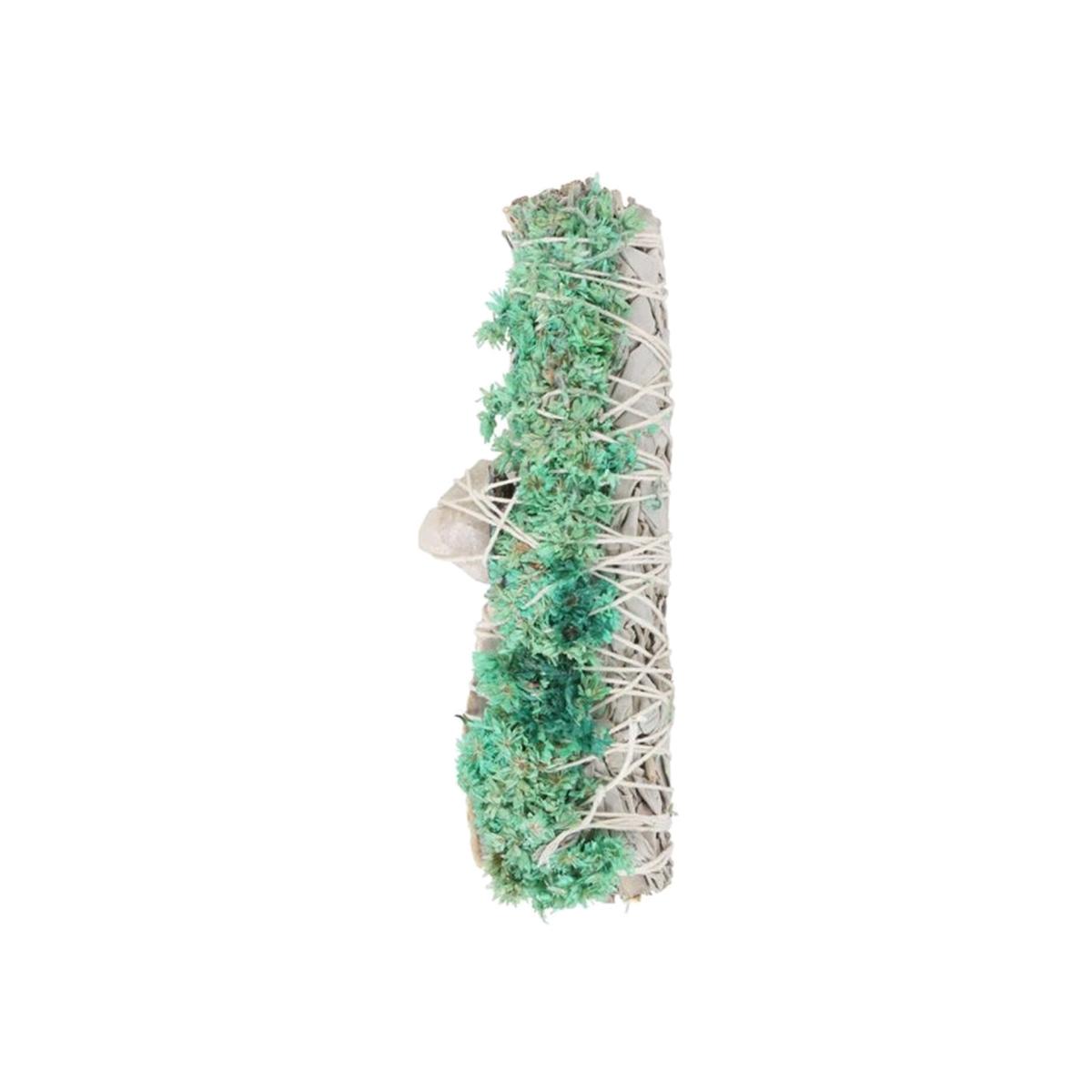 The act of smudging is a traditional Native American practice used to cleanse and purify spaces using the smoke of burning sacred herbs. Sustainably sourced and made in the USA, this beautiful ritual wand features white sage, abalone shell pieces, dried green flowers and a raw quartz crystal thoughtfully handtied into a tight bundle for burning and display. To use, light the end of the sage stick and allow to smoulder, place into a heat-resistant bowl or shell and gently disperse the smoke throughout the area to dispel negative energies. Fully extinguish after use and keep away from pets and children.