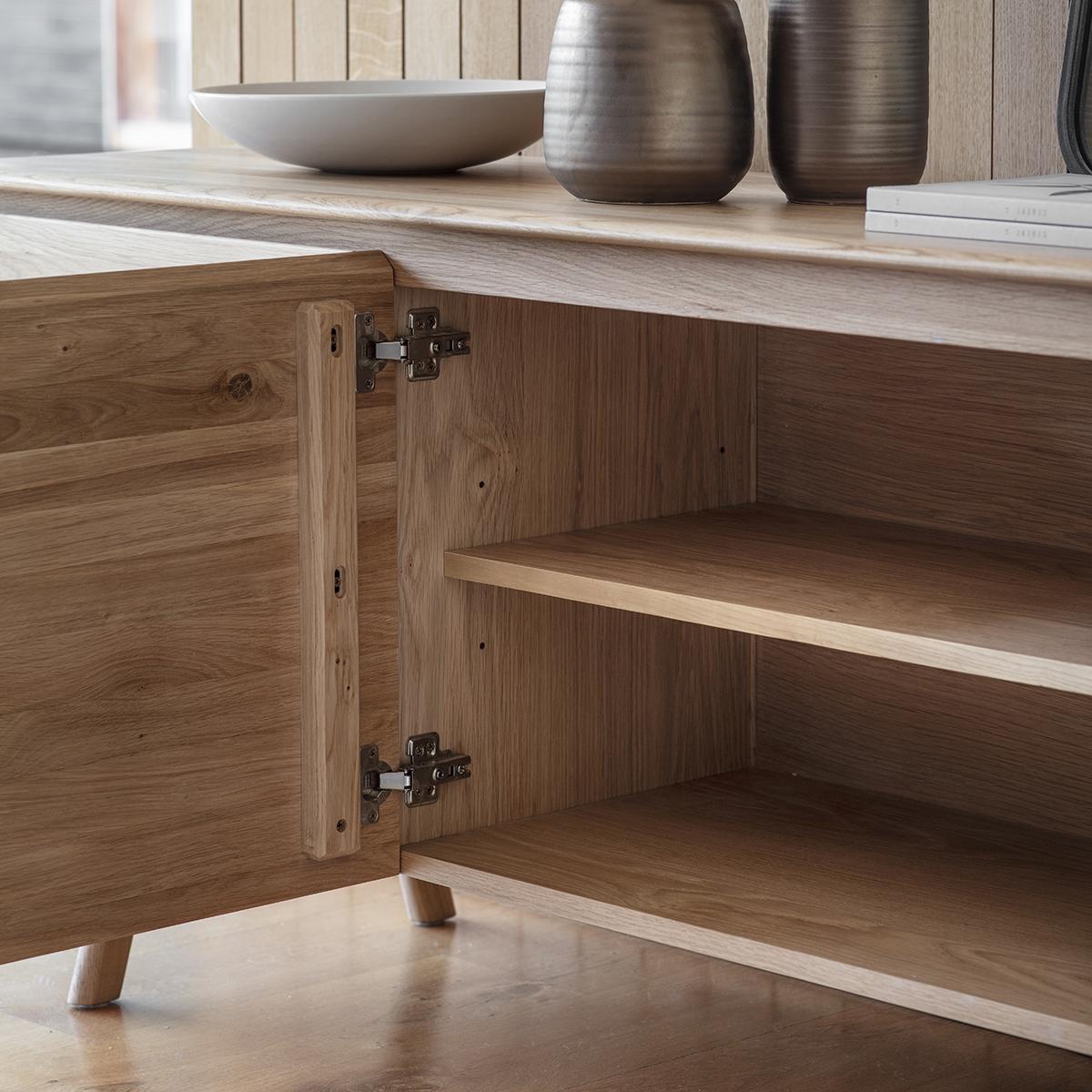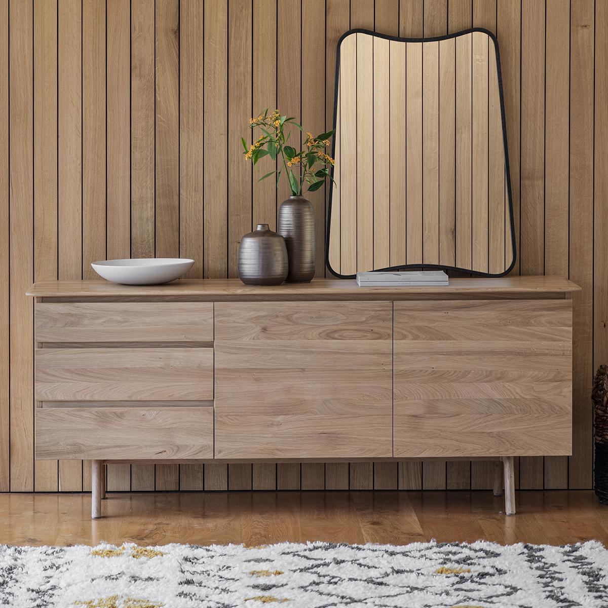 This sideboard is a versatile piece, thanks to its beautiful light oak finish, which adds warmth without overpowering a space. I love how it pairs well with both modern and Scandinavian-inspired interiors, thanks to its clean lines and natural material. Practical styling tips include using its top to display a mix of decorative vases, art books, or a statement lamp, while utilising the internal storage for organisation-perfect for keeping clutter out of sight. Its slender legs give it a light, airy feel, making it suitable for smaller dining rooms or living spaces, where it provides both style and functionality without taking up too much room.