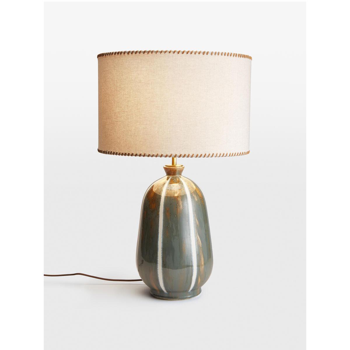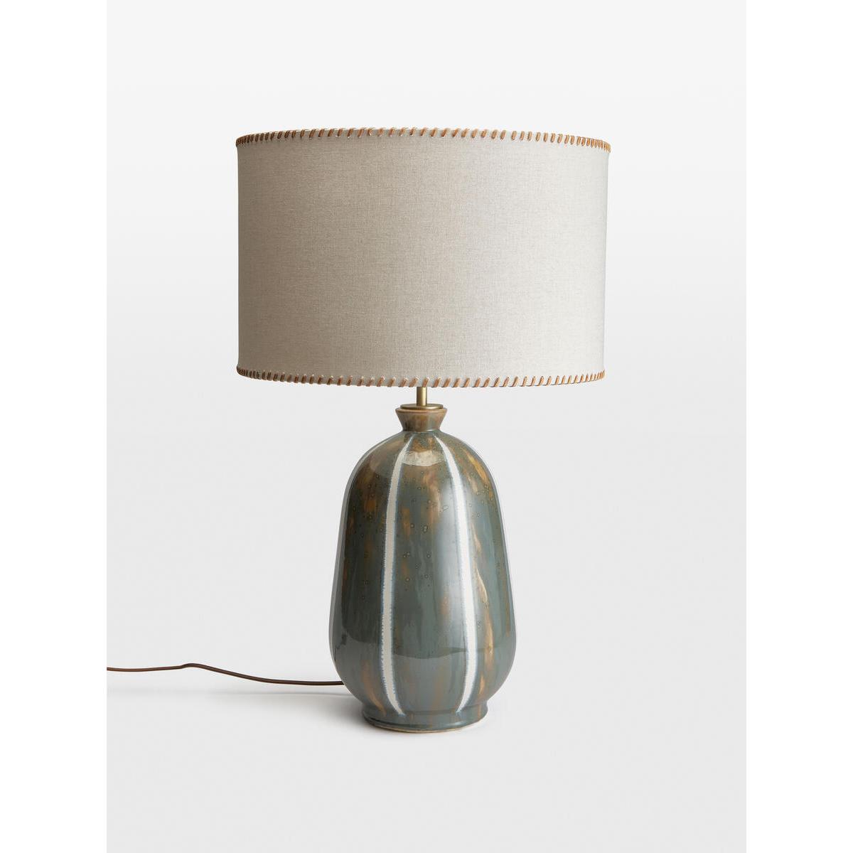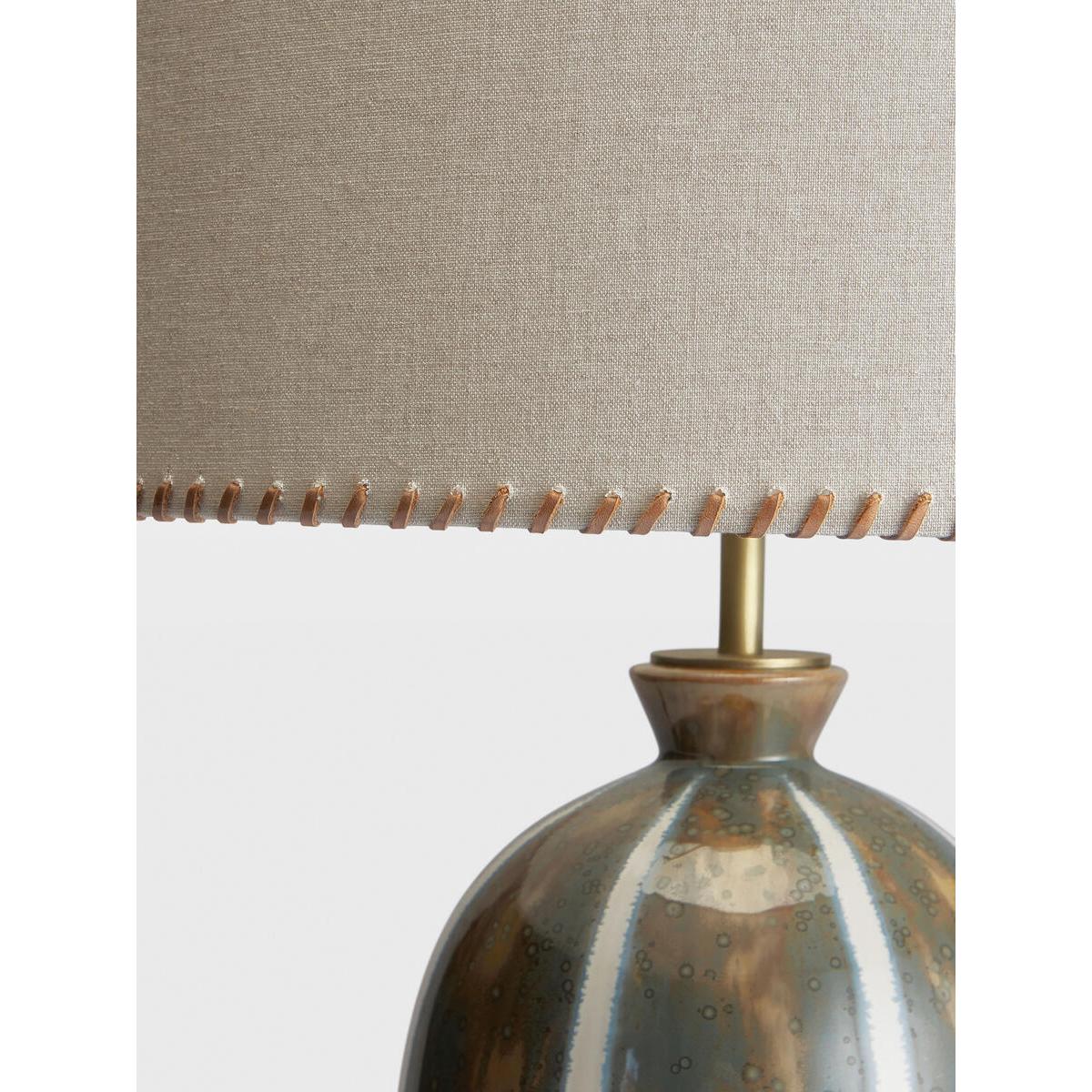 Inspired by the retro interiors at 180 House, the Sadie table lamp features a chunky ceramic base with a tonal reactive glaze and white stripes applied on top. A natural linen shade with woven leather edge stitching lends an artisanal touch, while antique brass detailing complements the lamp's varied textures. Ceramic table lamp Reactive glaze base White stripe detail Lined natural linen shade Woven leather stitching on each rim Antique brass detailing Dimmable Requires one x E27/ 9W max bulb Inspired by 180 House