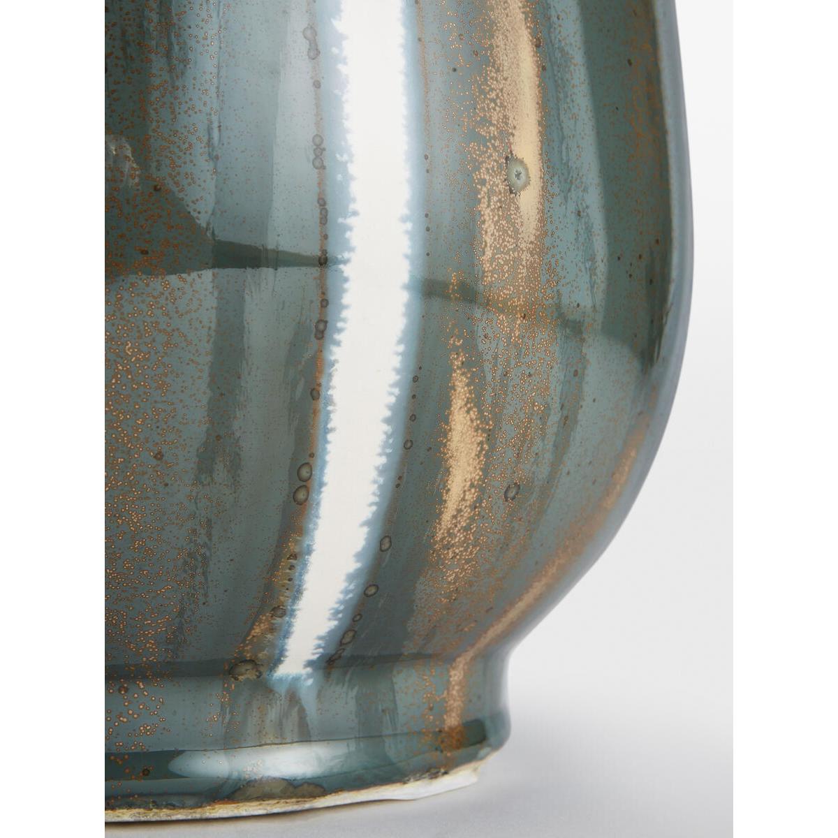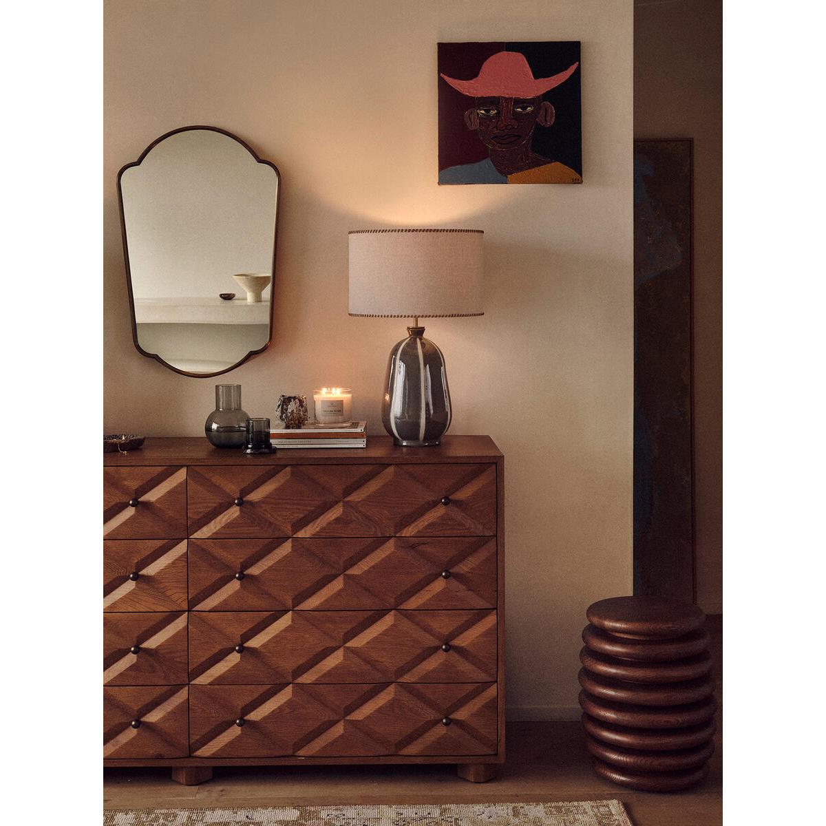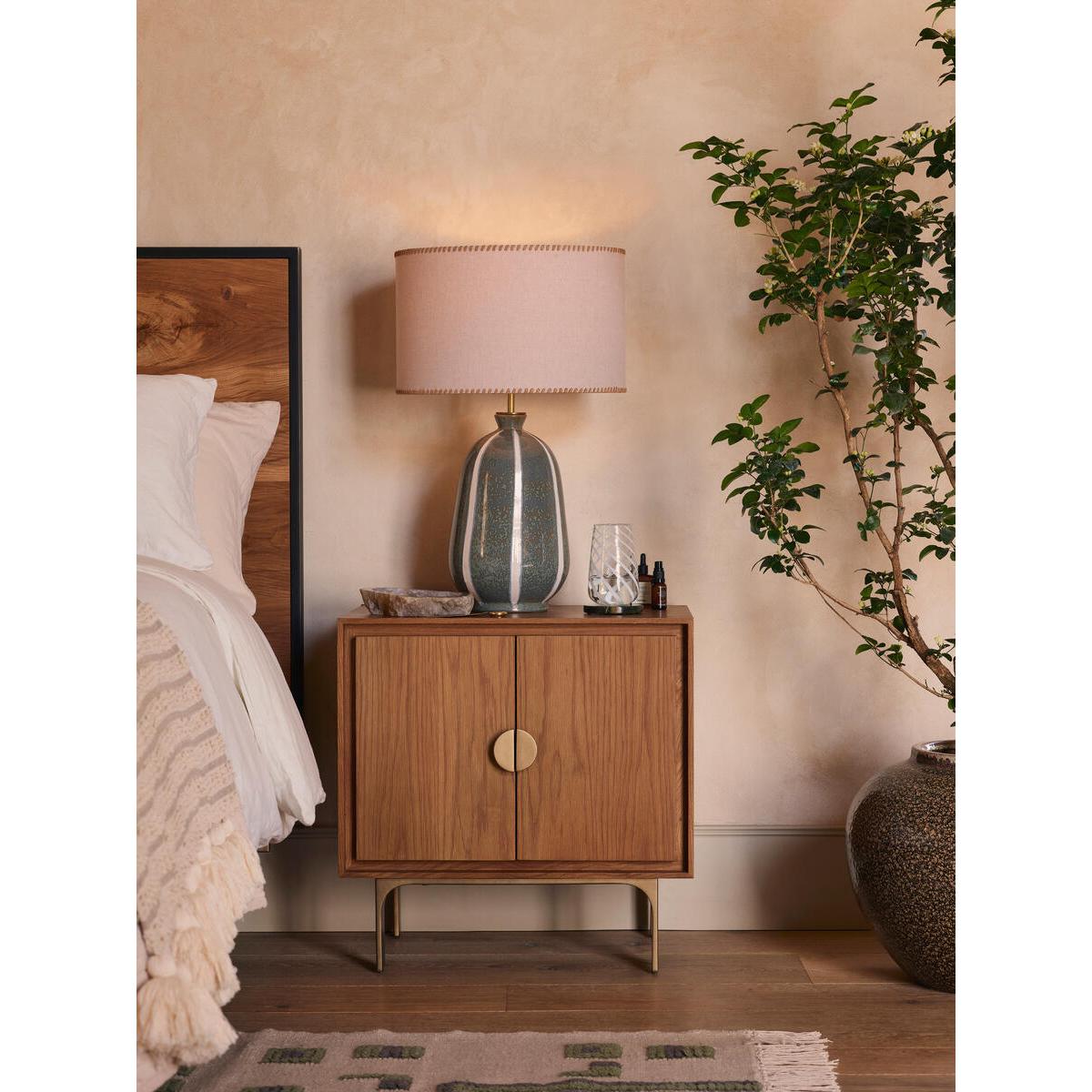 Inspired by the retro interiors at 180 House, the Sadie table lamp features a chunky ceramic base with a tonal reactive glaze and white stripes applied on top. A natural linen shade with woven leather edge stitching lends an artisanal touch, while antique brass detailing complements the lamp's varied textures. Ceramic table lamp Reactive glaze base White stripe detail Lined natural linen shade Woven leather stitching on each rim Antique brass detailing Dimmable Requires one x E27/ 9W max bulb Inspired by 180 House