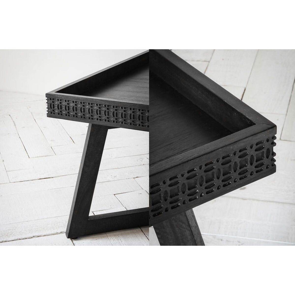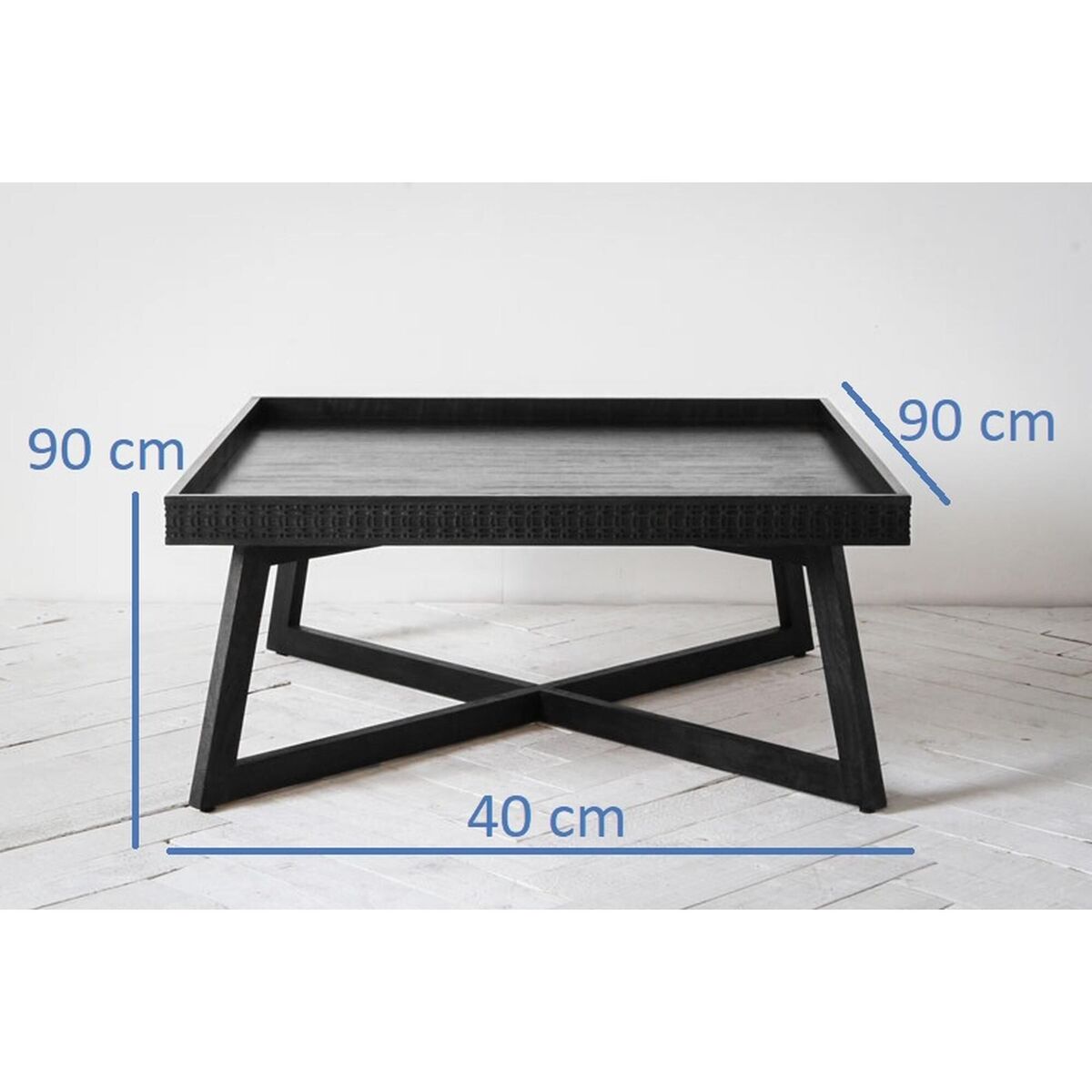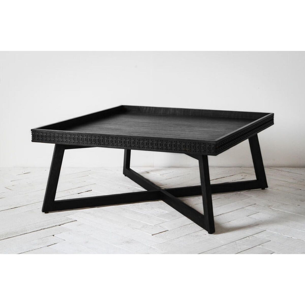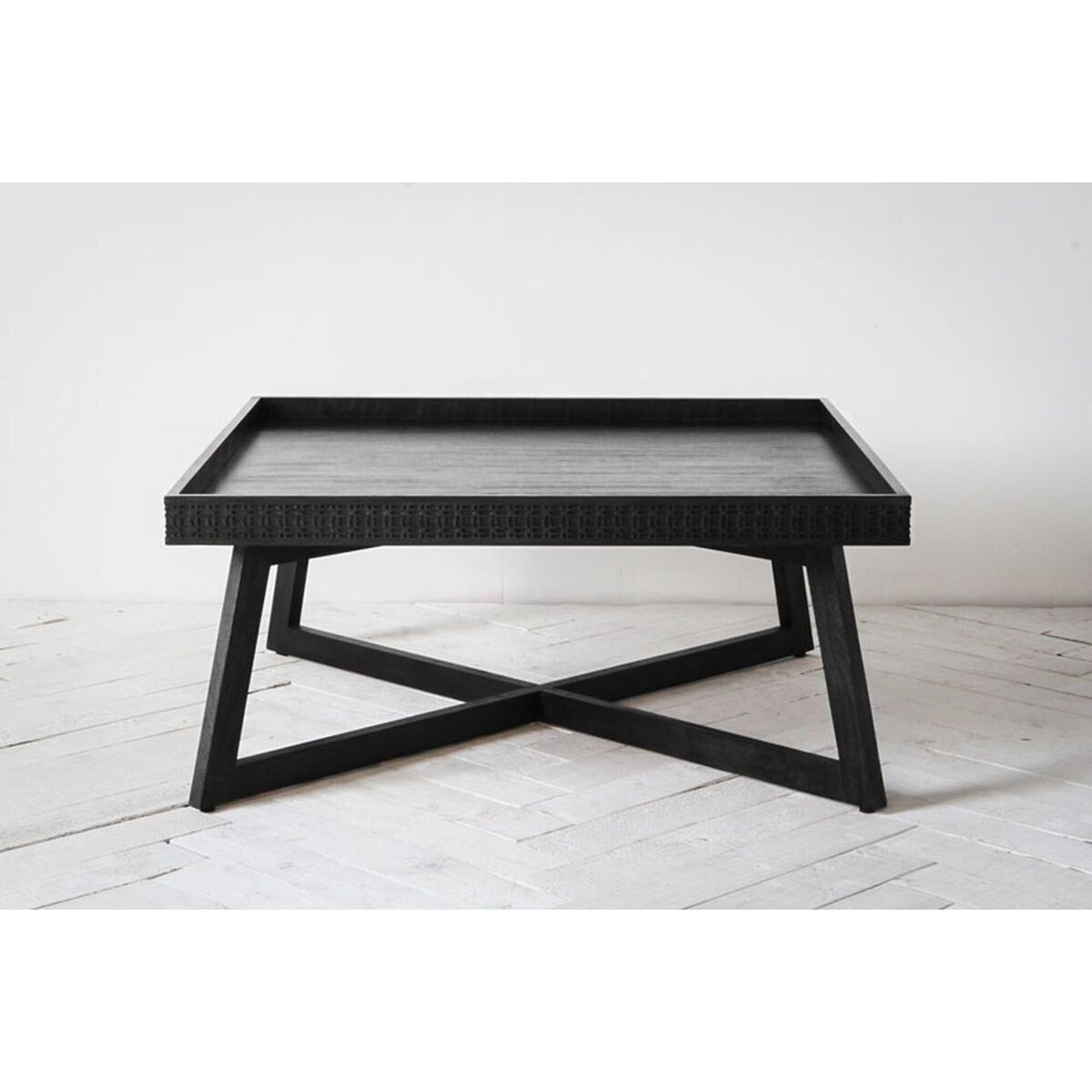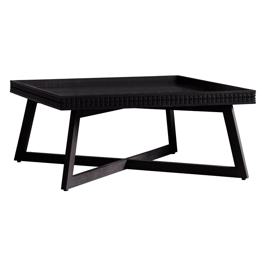 The Sadie is a wooden coffee table in matt black with a decorative patterned frieze on its table top.