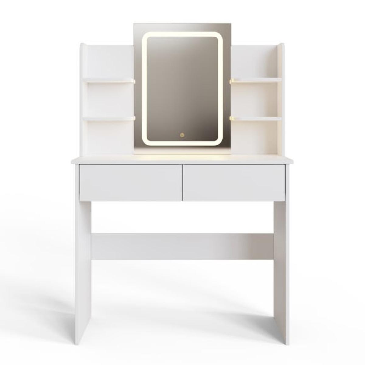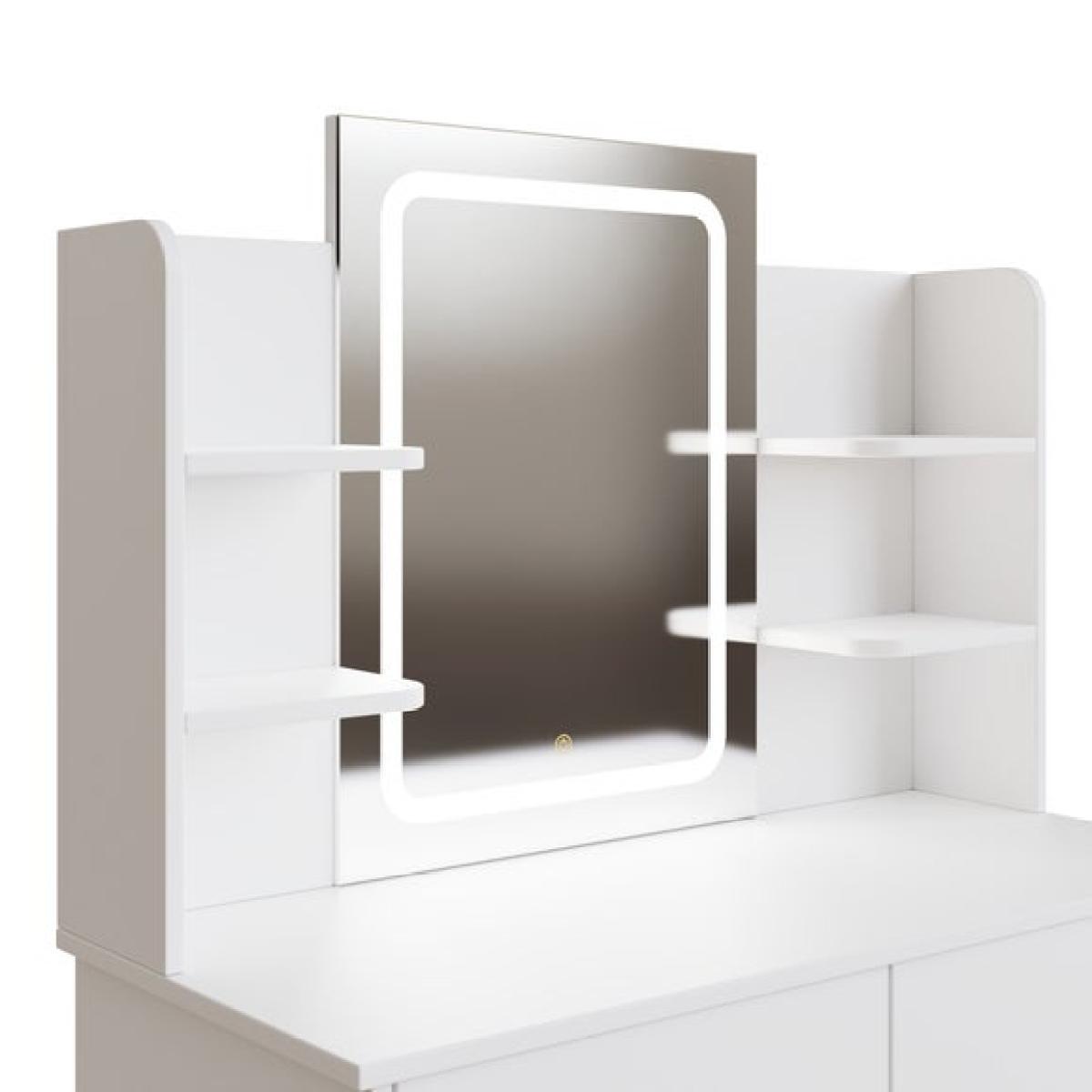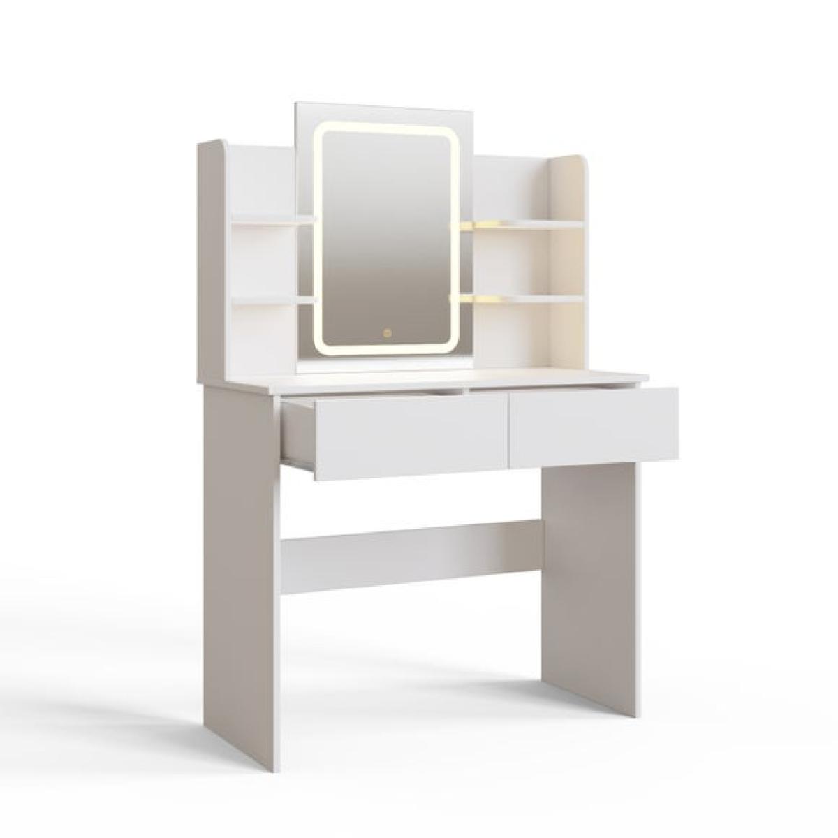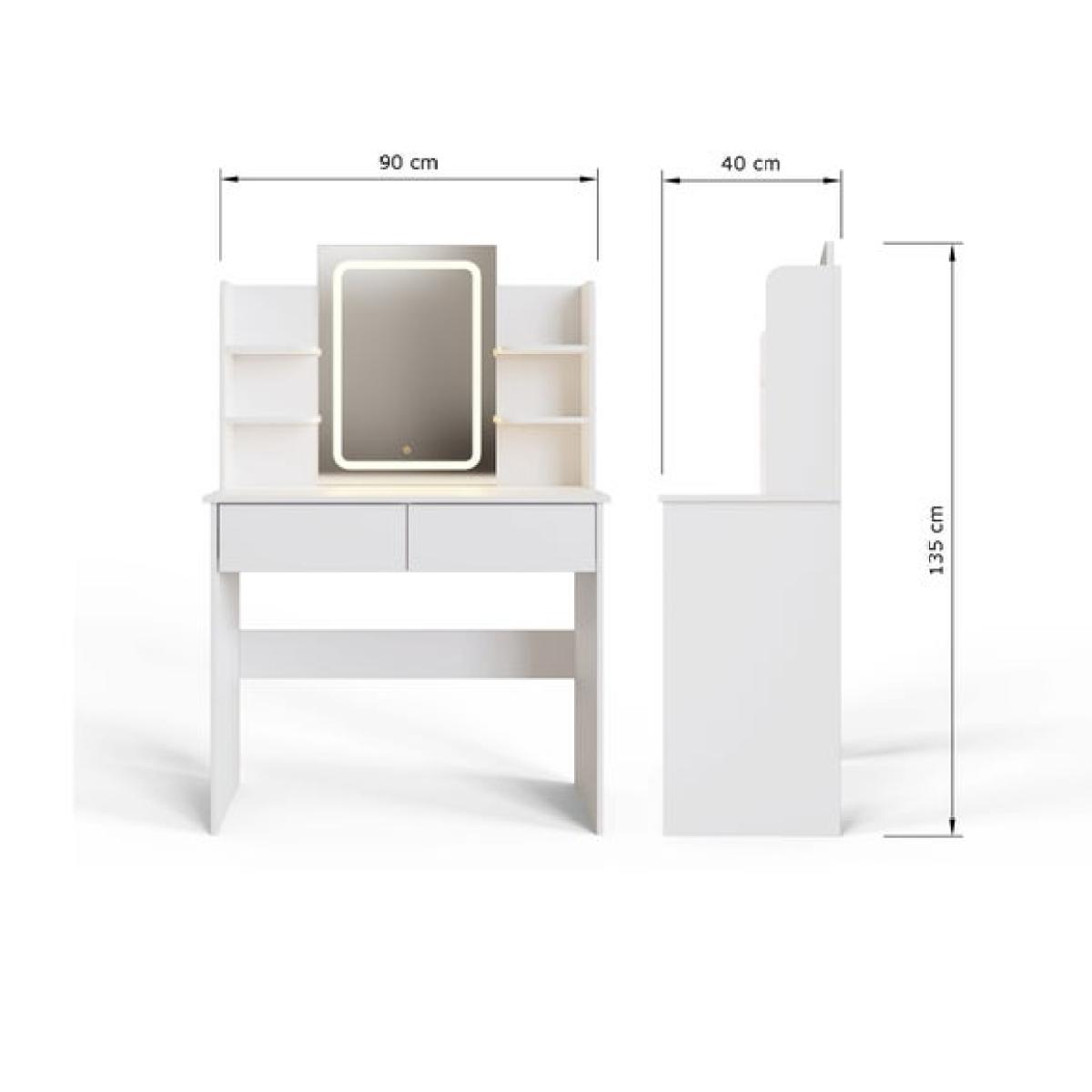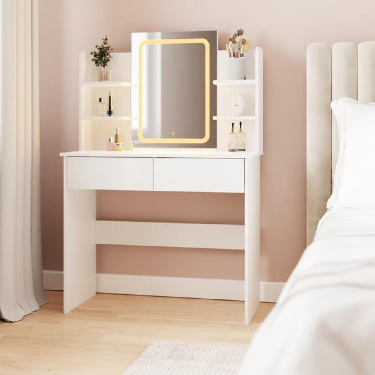 * Built-in LED mirror with touch control * Three lighting modes to suit your routine * Two drawers for beauty essentials * Open side shelves for extra storage * Compact design ideal for bedroom or dressing area The Sadie Dressing Table with LED Mirror is designed to bring light, order and style to your daily routine. Its built-in mirror features touch control and three lighting modes, so you can set the tone whether you're getting ready for the day or winding down at night. Two drawers and open side shelves offer plenty of space for makeup, skincare and accessories, keeping everything close to hand. The sleek white finish and clean lines give it a fresh look that works well in modern bedrooms or dressing areas. It’s a practical piece that helps you stay organised without taking up too much space. A smart setup for everyday use.