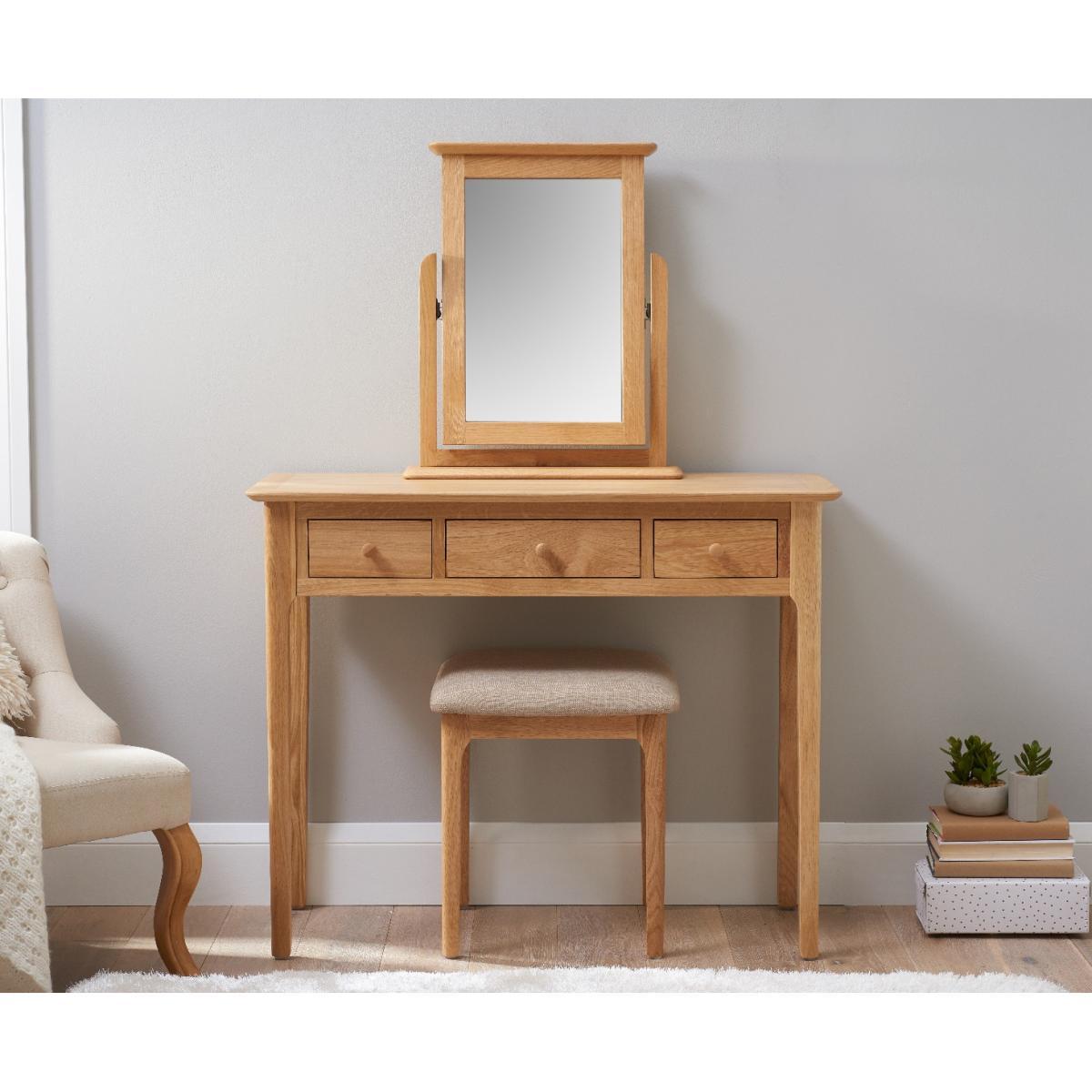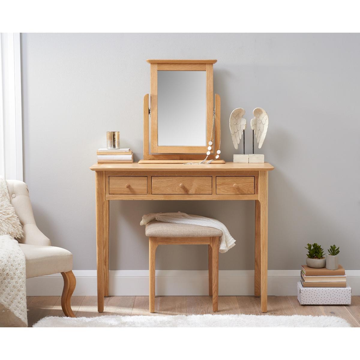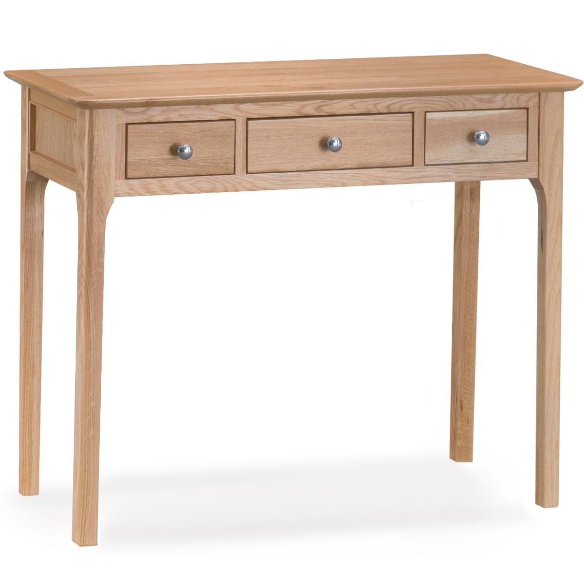 The Sadie Oak Dressing Table features a stunning minimalist design to complement and enhance any bedroom setting. Featuring a natural light oak finish, the dressing table is complete with three handy drawers and is supplied with both oak and chrome knobs. Elegant dressing table with stylish Danish-inspired design. Natural light oak finish complements any bedroom setting. Three handy drawers with metal ball bearing runners. Complete with oak and chrome knobs so you can choose the final look. Complements other items in the oak bedroom range