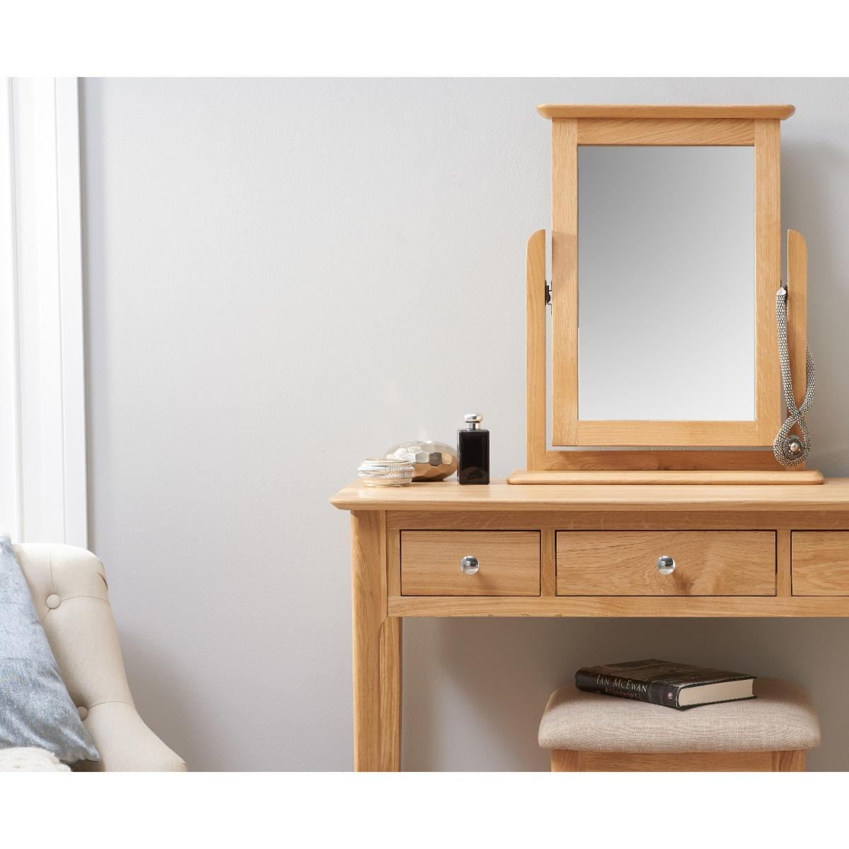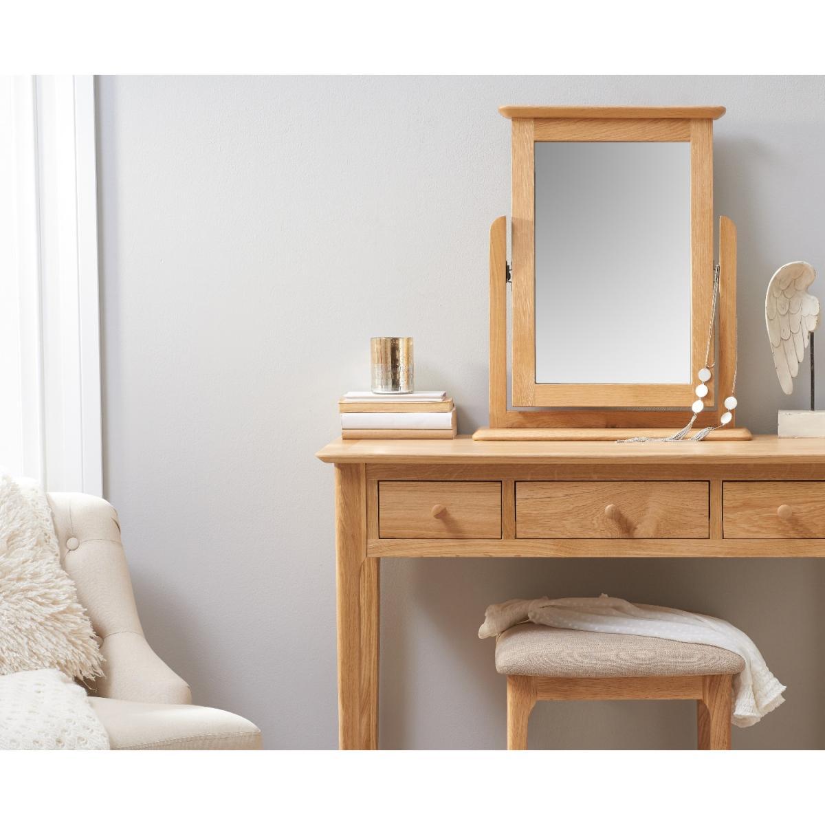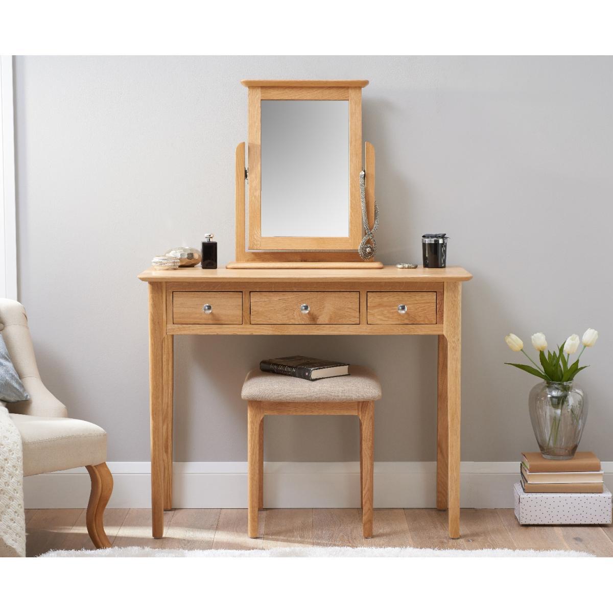 The Sadie Oak Dressing Table features a stunning minimalist design to complement and enhance any bedroom setting. Featuring a natural light oak finish, the dressing table is complete with three handy drawers and is supplied with both oak and chrome knobs. Elegant dressing table with stylish Danish-inspired design. Natural light oak finish complements any bedroom setting. Three handy drawers with metal ball bearing runners. Complete with oak and chrome knobs so you can choose the final look. Complements other items in the oak bedroom range