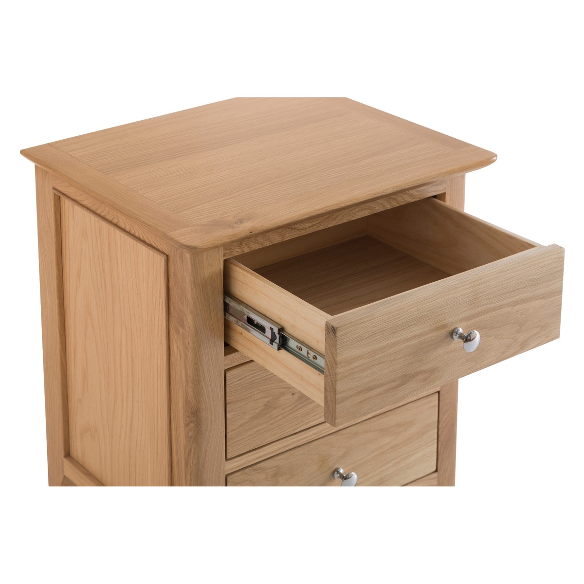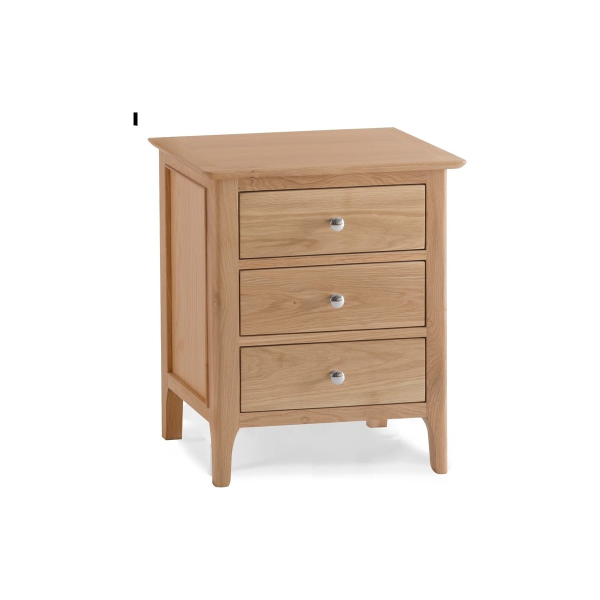 Featuring a Danish-inspired look, the Sadie Oak 3 Drawer Extra Large Bedside Table is stylish and minimalist. Featuring a light oak finish, the bedside table is a stylish and practical addition to your bedroom and comes complete with both oak and chrome knobs to finish the look. Stylish and practical extra large bedside table Light oak finish for a beautiful minimalist look. Three handy drawers on metal ball bearing runners. Comes complete with both oak and chrome knobs so you can choose your perfect look. Complements the other items in the oak bedroom furniture collection