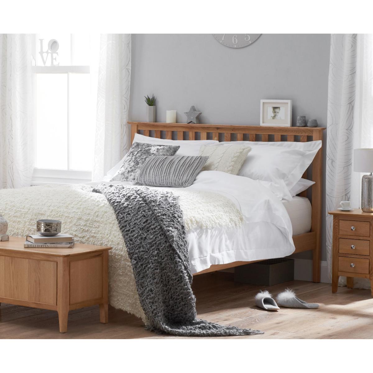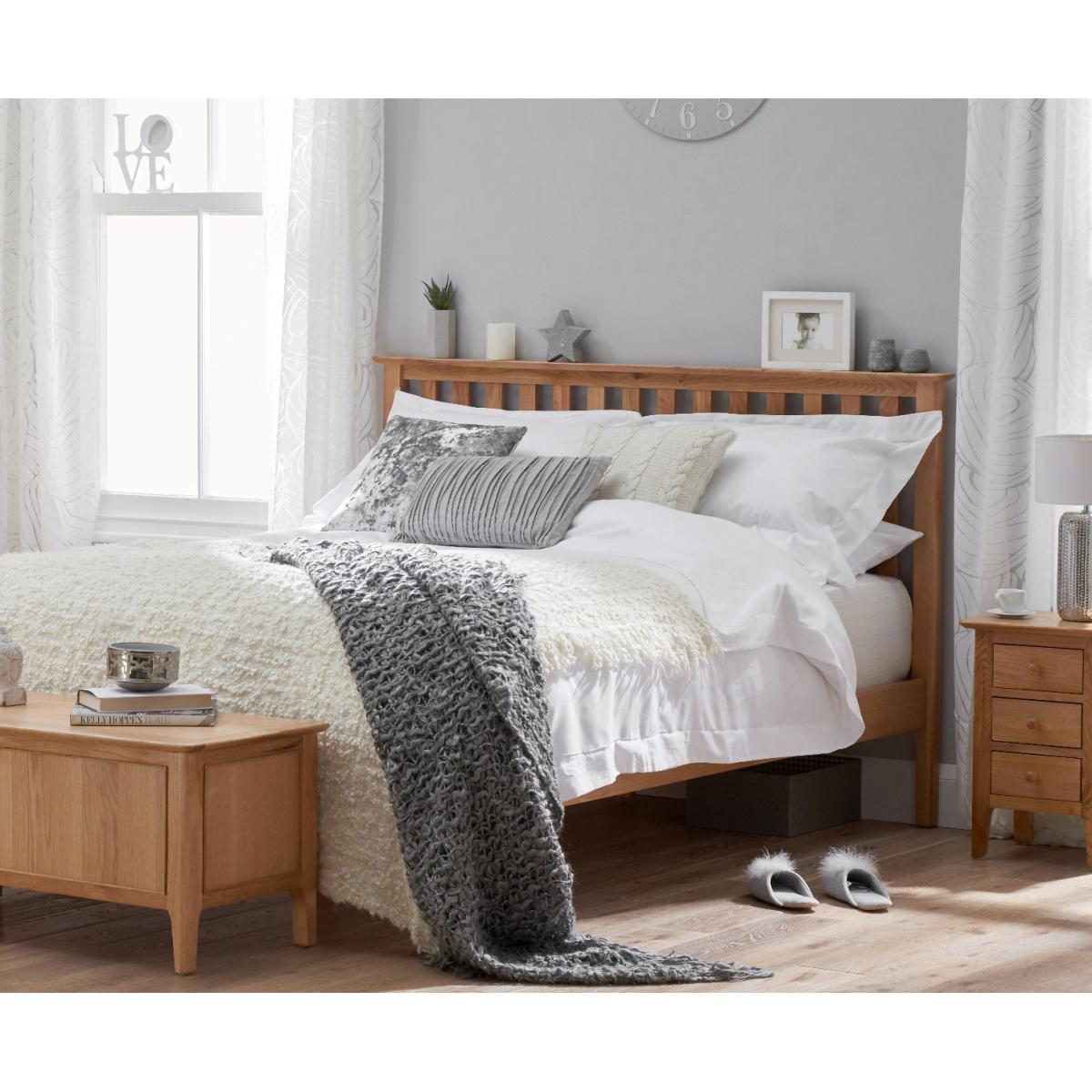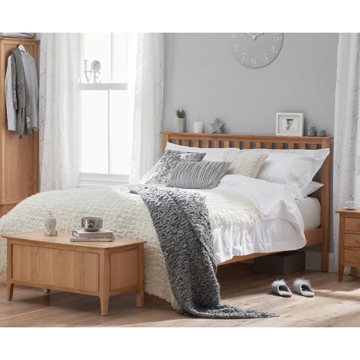 The Sadie Oak King Size Bed features a Scandinavian-inspired minimalist design to suit any bedroom setting. Featuring an attractive natural light oak finish, the king size bed is complete with pine base slats and is also available as a single and a double. Stylish king size bed with a natural light oak finish. Minimalist design complements any bedroom setting. Pine base slats with slat spacer included. Also available in Single and Double sizes. Complements other items in the oak bedroom furniture range