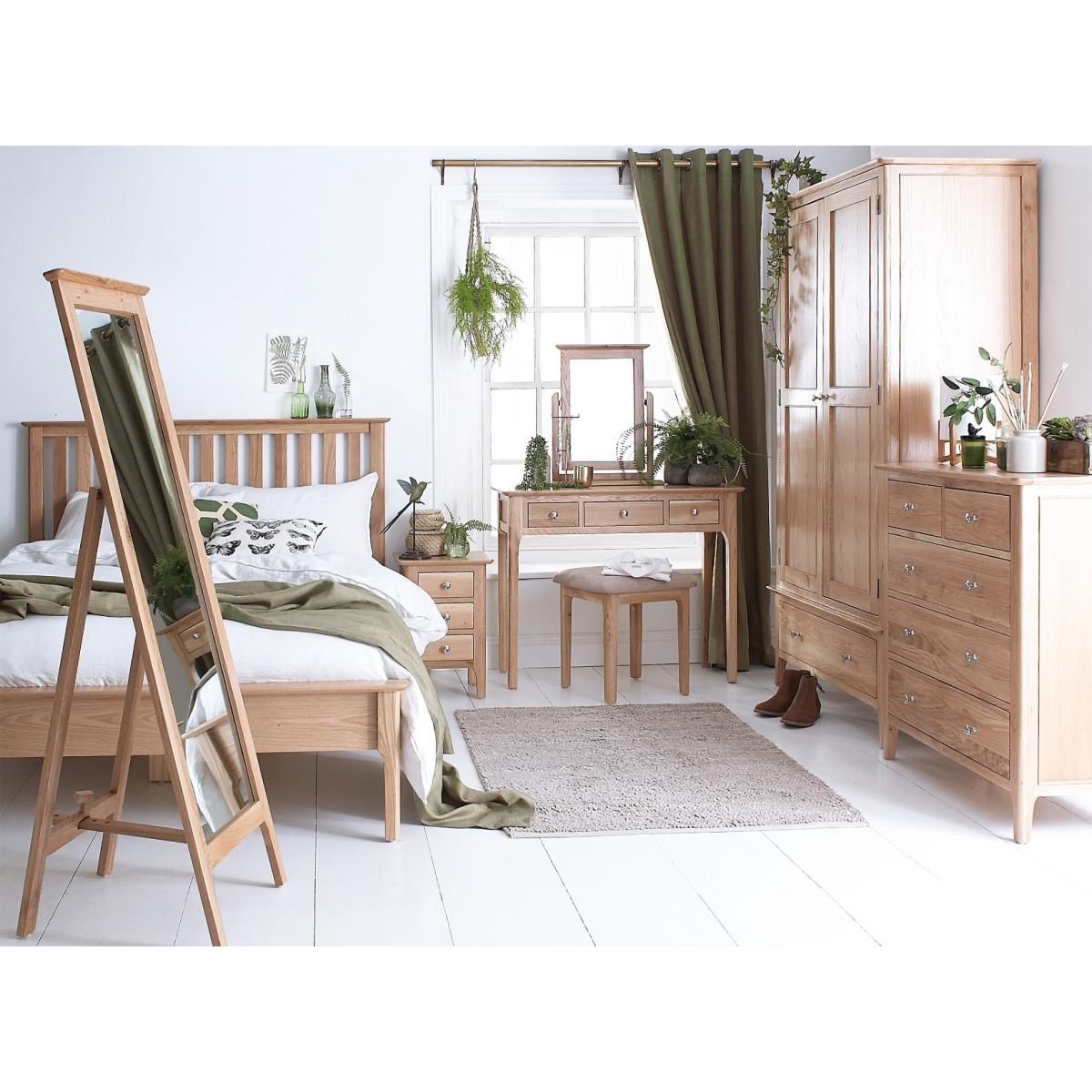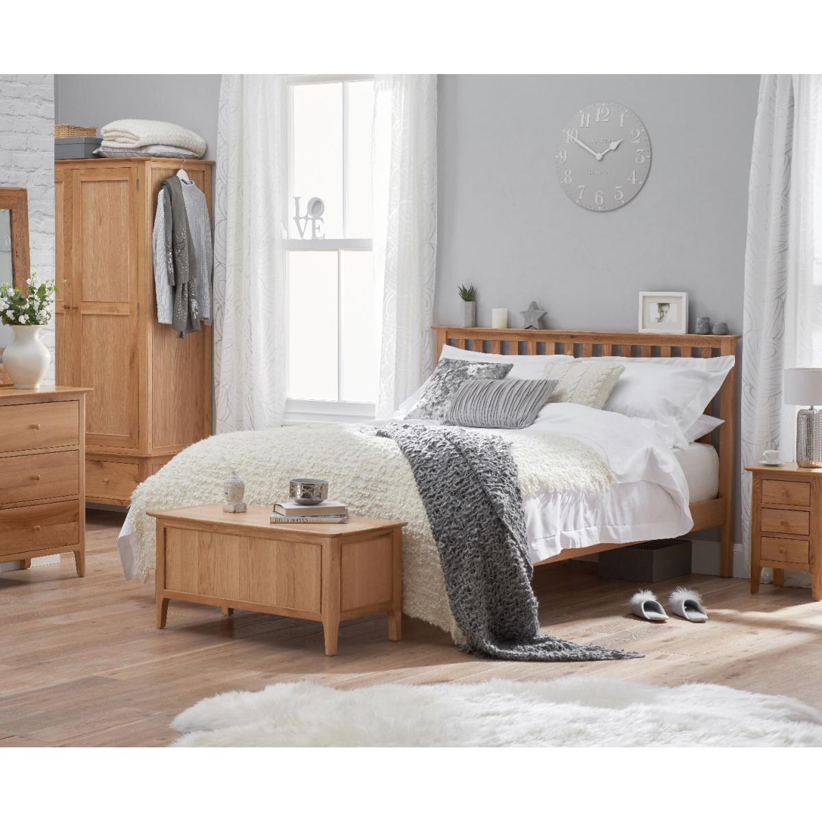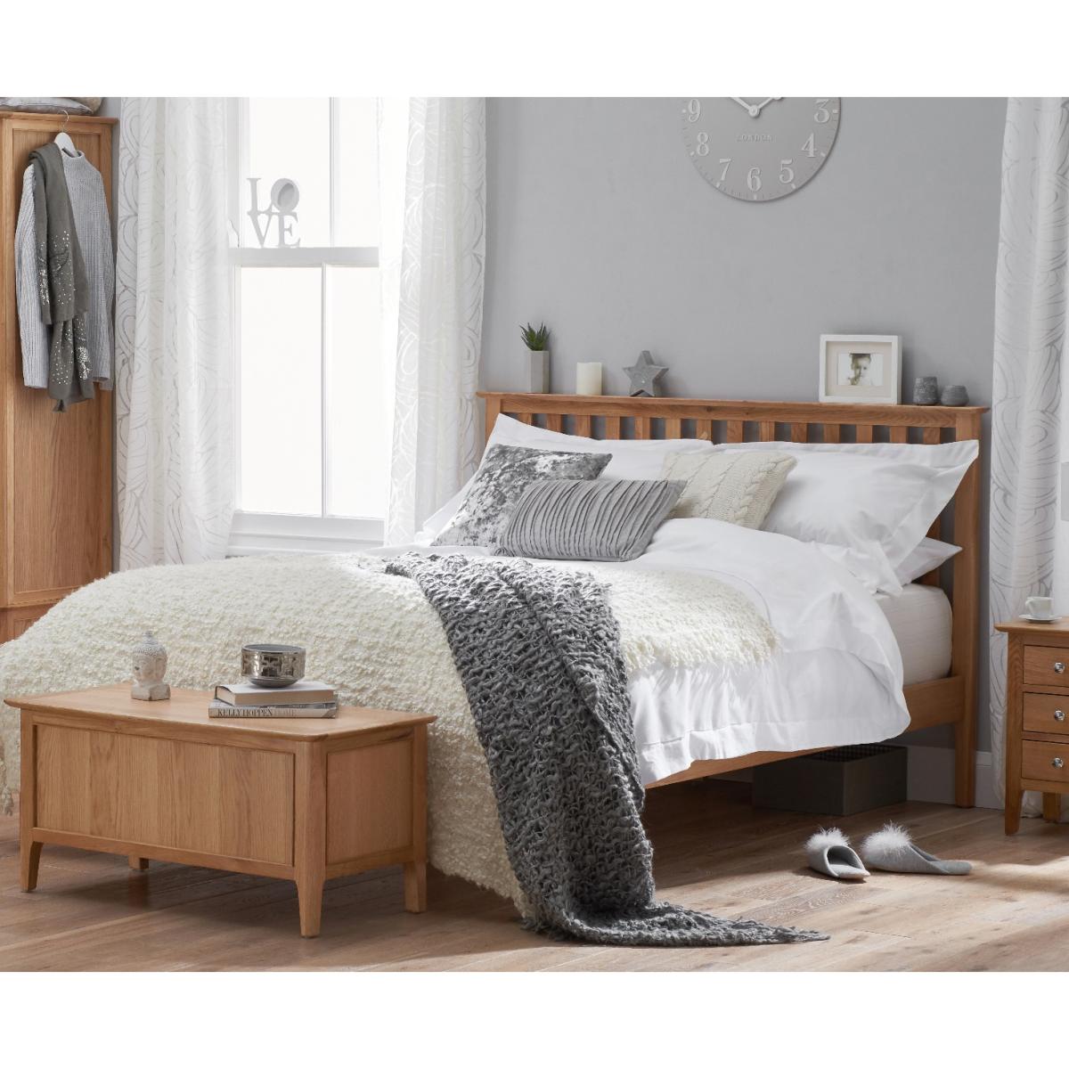 The Sadie Oak King Size Bed features a Scandinavian-inspired minimalist design to suit any bedroom setting. Featuring an attractive natural light oak finish, the king size bed is complete with pine base slats and is also available as a single and a double. Stylish king size bed with a natural light oak finish. Minimalist design complements any bedroom setting. Pine base slats with slat spacer included. Also available in Single and Double sizes. Complements other items in the oak bedroom furniture range