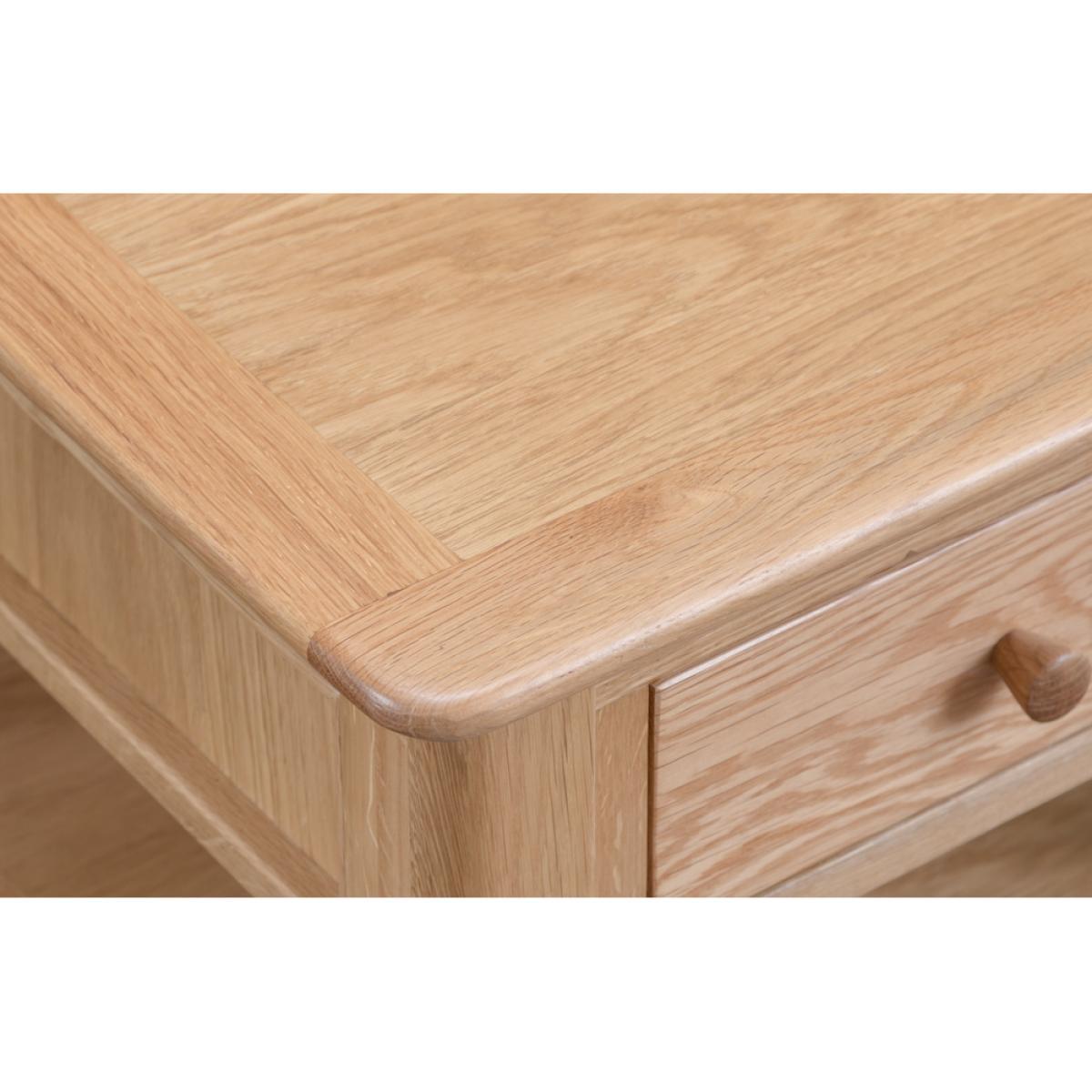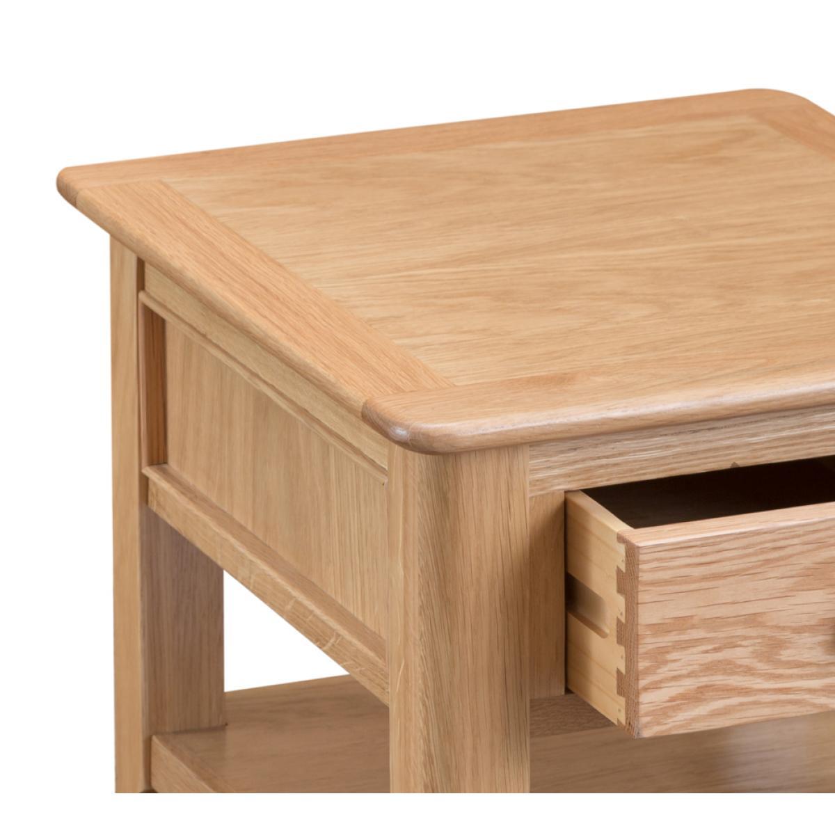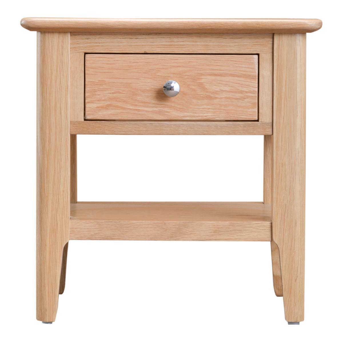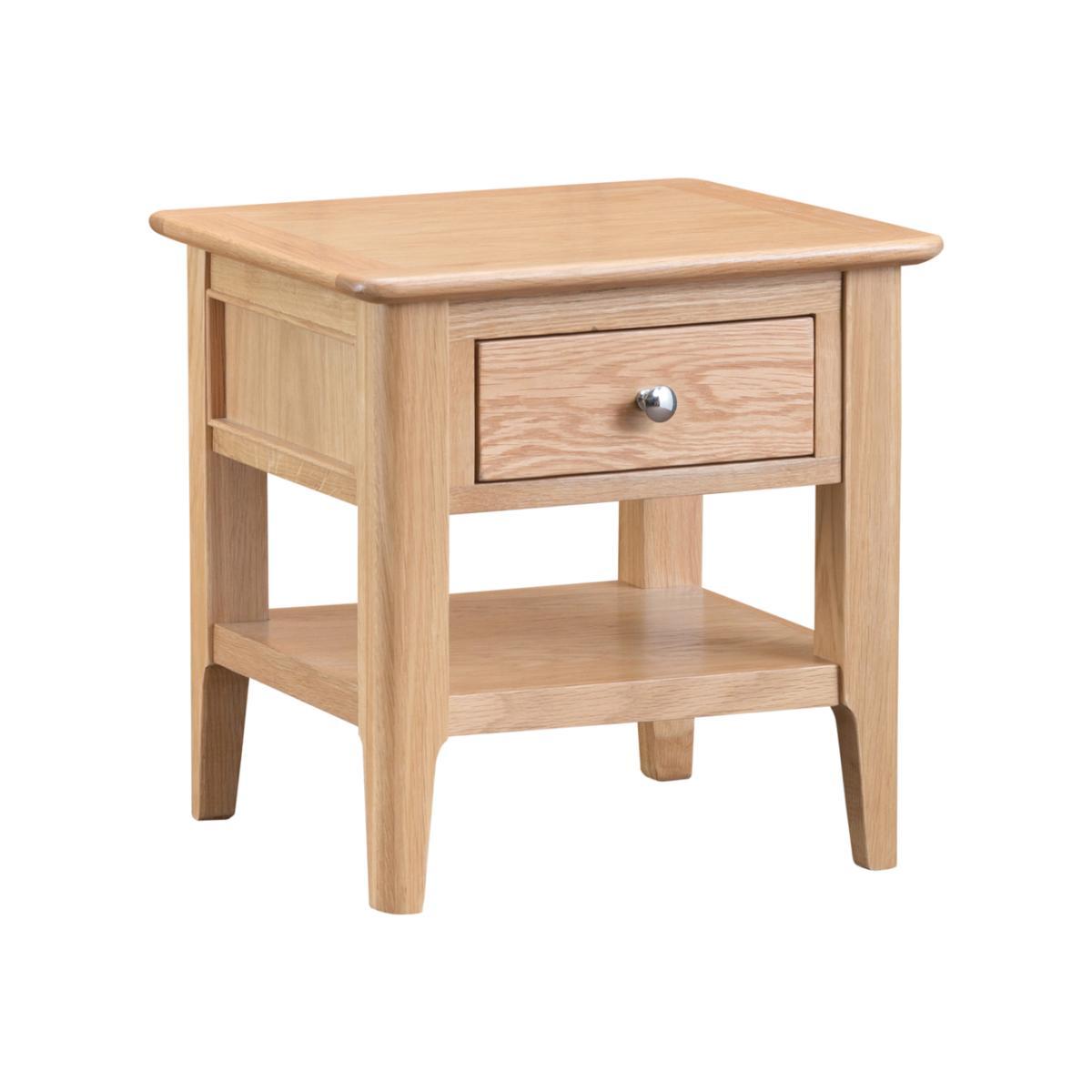 Low and versatile, the charming Sadie Lamp Table features a square shape, a soft oak finish and multiple storage and display options. Boasting a small sliding drawer (with the choice of either a chrome or wooden handle) and low shelf, with sturdy and supportive oak legs and a smooth table top. Featuring a versatile square shape. With a smooth top table and single sliding drawer for hidden, handy storage. Crafted in quality materials for a sturdy, lasting piece An additional 16cm lower shelf offers further storage and display. Comes with a choice of either a wooden or chrome handle. Matches the entire Sadie furniture collection