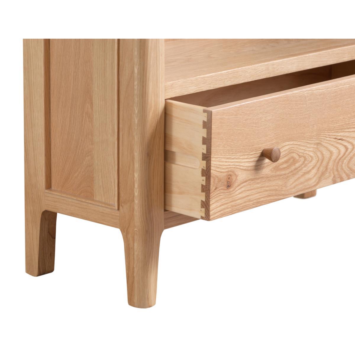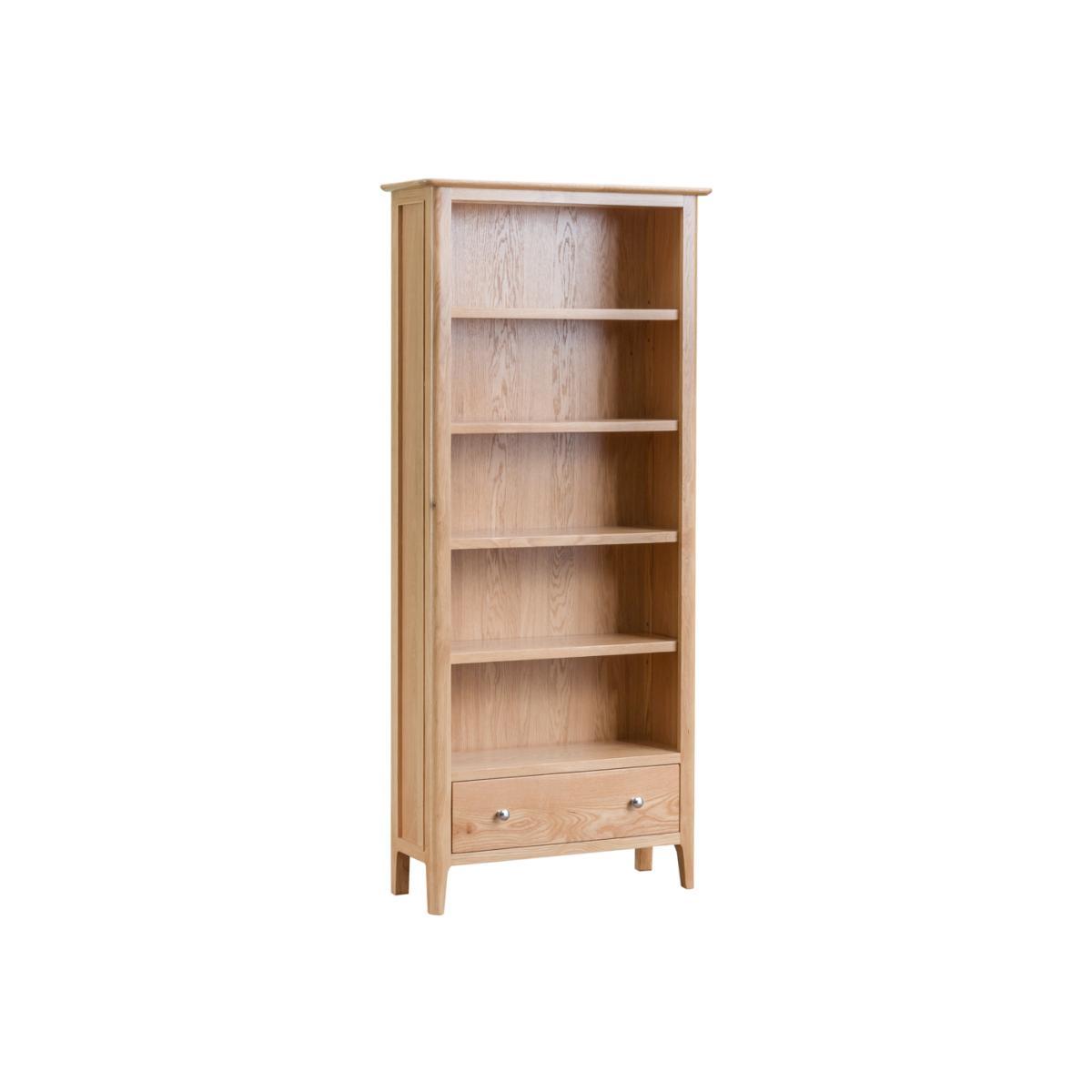 Tall and sturdy, the minimal Sadie Oak Large Bookcase boasts 3 shelves and an additional sliding bottom drawer with a choice of either a chrome or wooden handle. Simple, charming and featuring sturdy oak legs and smooth edges; designed for lasting quality and versatile styling and storage within every home. Tall, wide and lean for maximum space and elegant storage. Crafted in quality materials for a charming, sturdy piece that lasts. Features 3 shelves for open storage and display, and one sliding drawer. Comes with the choice of either a chrome or wooden handle. Supported by strong, sturdy oak legs. Matches the entire Sadie furniture range