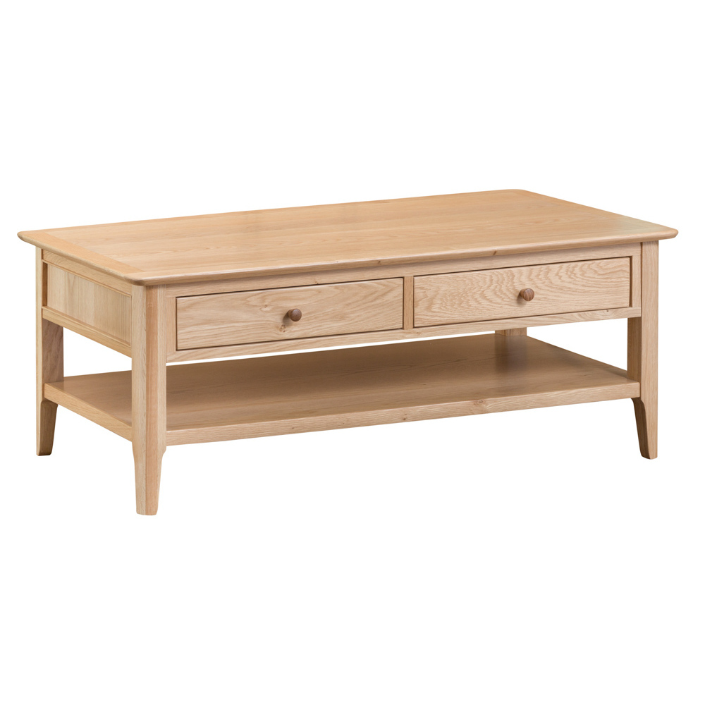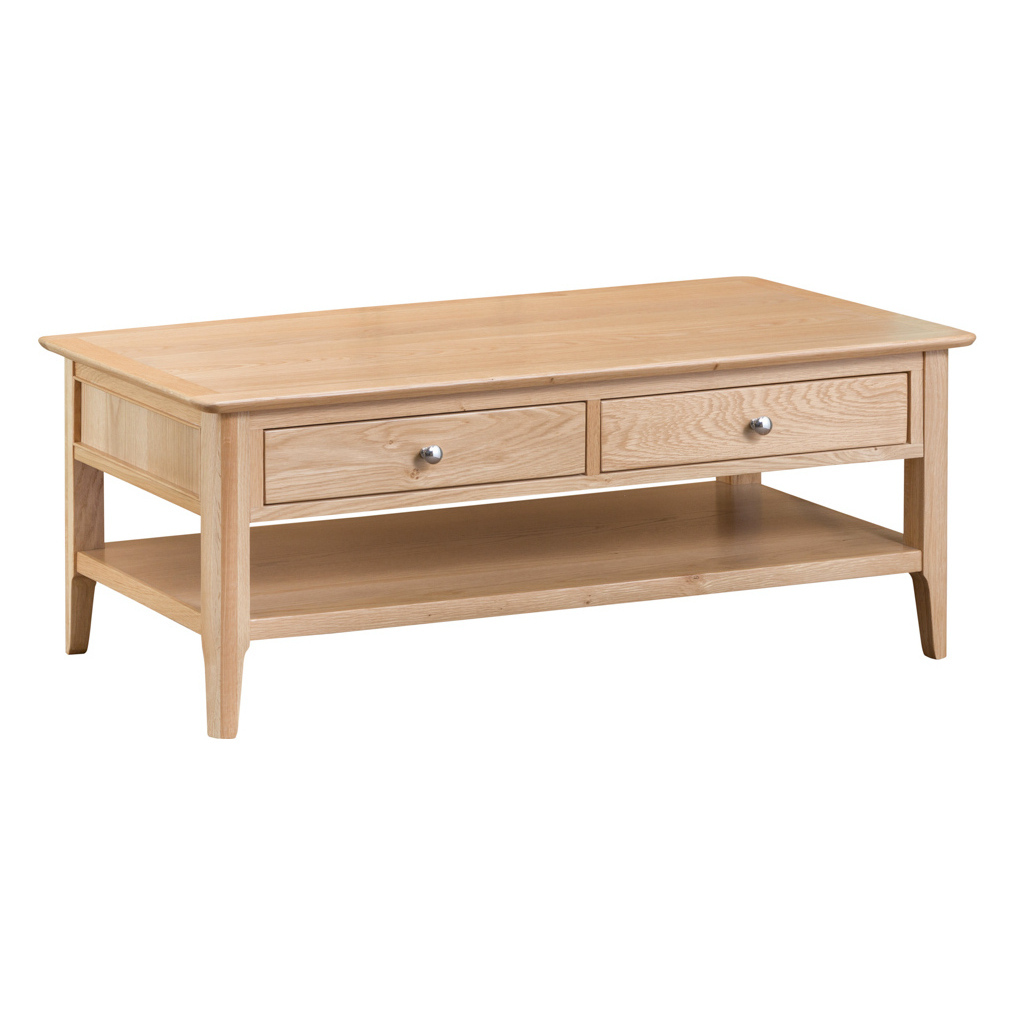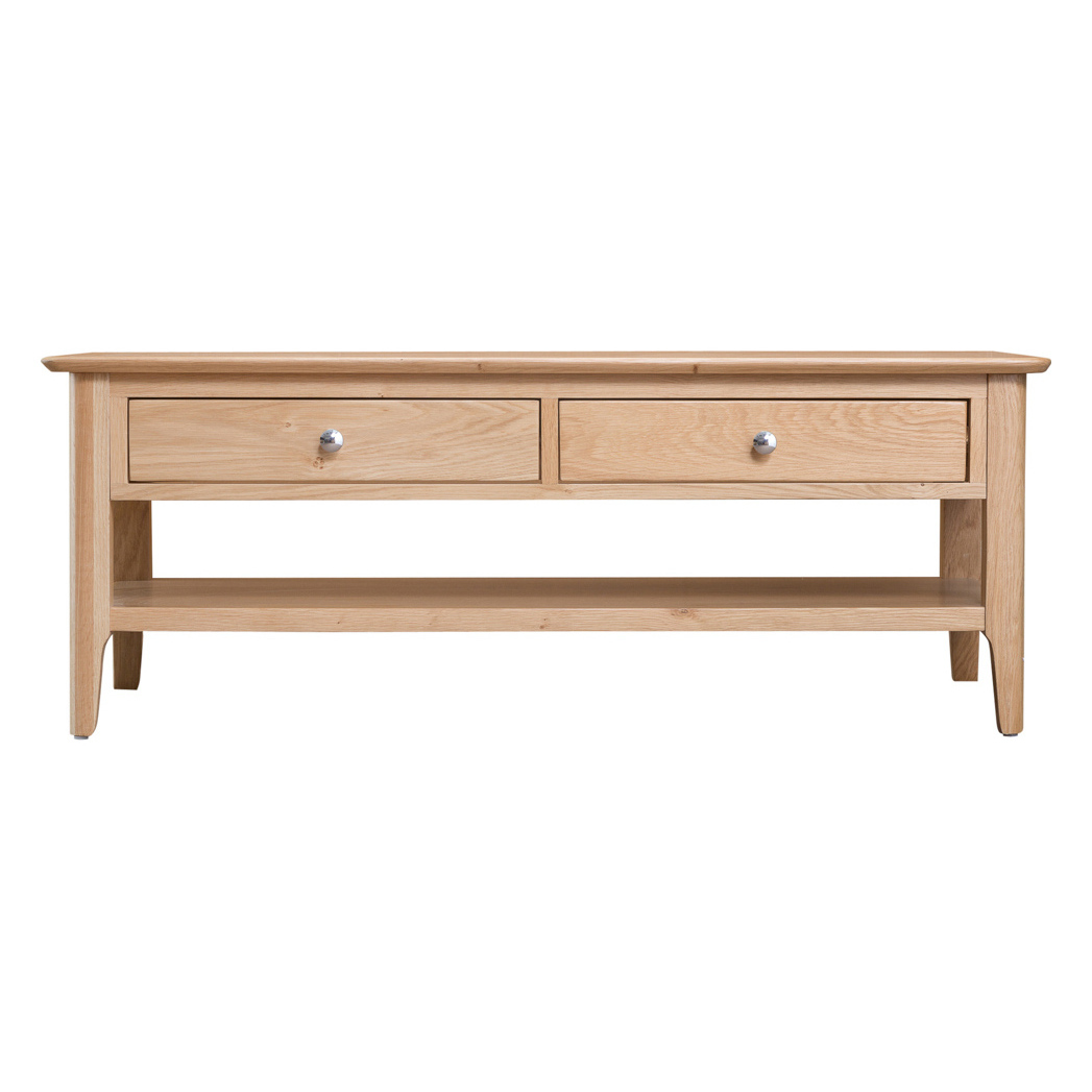 Low and wide, the Sadie Large Coffee Table is the perfect piece for a simple, charming centre piece, plus an abundance of additional storage. Boasting a versatile light oak tone, smooth finish, an open lower shelf and two slim sliding drawers with the choice of either wooden or chrome handles. Crafted in quality materials for a charming, sturdy piece that lasts. Featuring an open 16cm lower shelf for additional display and storage. Two slim sliding drawers to hide and store. Comes with a choice of wooden or chrome handles. Wide and low, for the ultimate in length and storage. Supported by sturdy oak legs for the ultimate support. Matches the entire Sadie range.