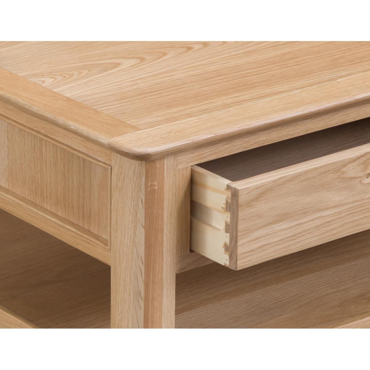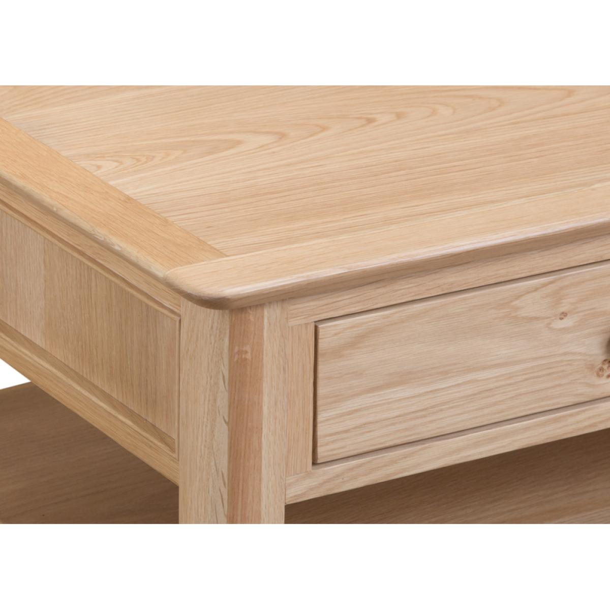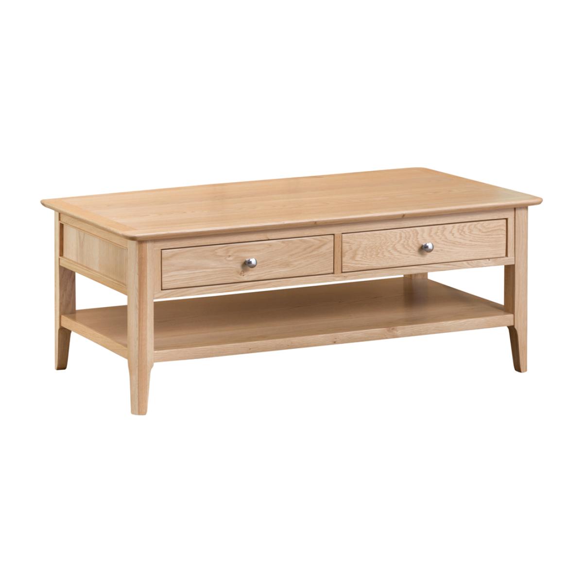 Low and wide, the Sadie Large Coffee Table is the perfect piece for a simple, charming centre piece, plus an abundance of additional storage. Boasting a versatile light oak tone, smooth finish, an open lower shelf and two slim sliding drawers with the choice of either wooden or chrome handles. Crafted in quality materials for a charming, sturdy piece that lasts. Featuring an open 16cm lower shelf for additional display and storage. Two slim sliding drawers to hide and store. Comes with a choice of wooden or chrome handles. Wide and low, for the ultimate in length and storage. Supported by sturdy oak legs for the ultimate support. Matches the entire Sadie range