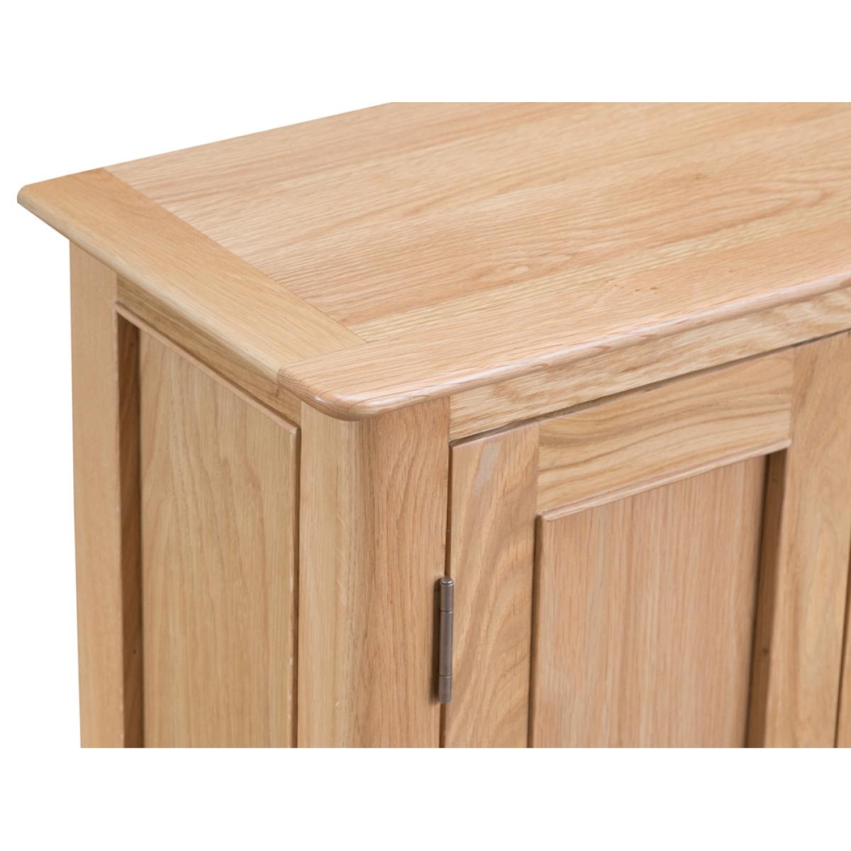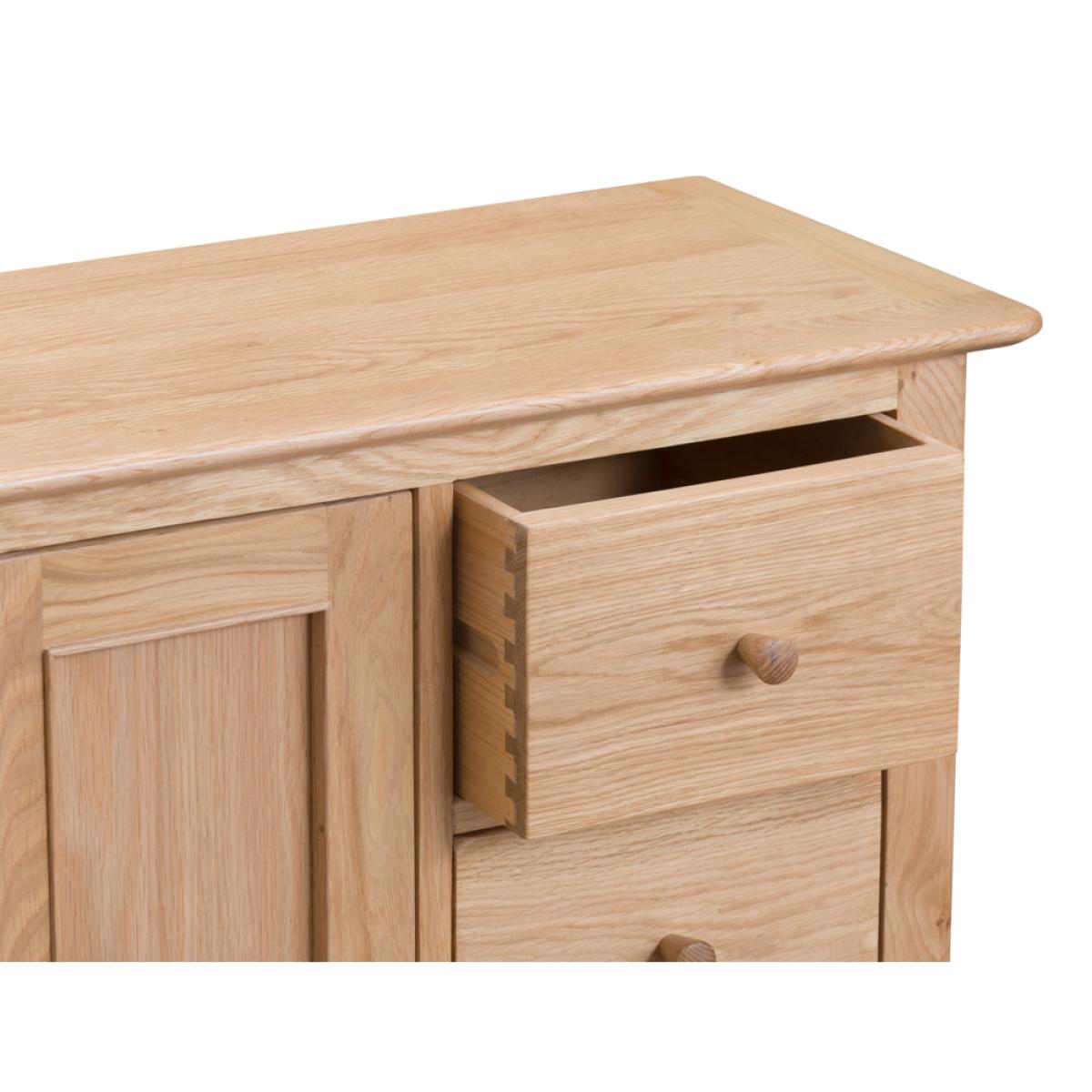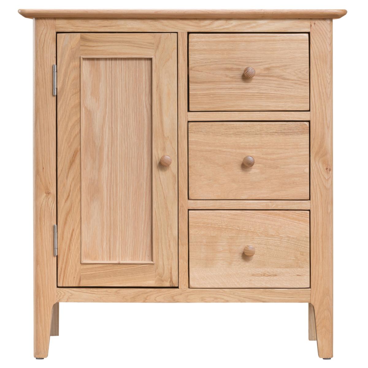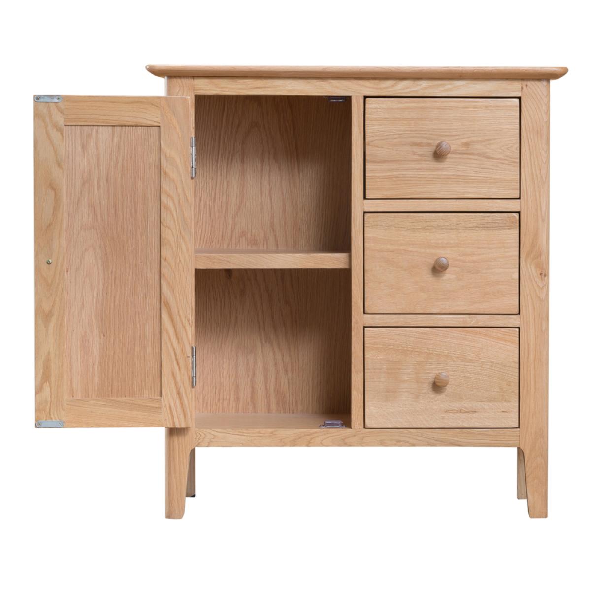 Designed for the ultimate in storage and style, the charming Sadie Oak large Combi Cupboard features a sturdy structure, with a 3 drawer and single cupboard combo. A flat and smooth table top and short sturdy oak legs add to its minimal appeal, with the option of either chrome or wooden handles offering versatility within every style of home. Crafted in quality materials for a charming, sturdy piece that lasts. Featuring one cupboard with magnetic closer, and 3 sliding drawers for maximum hidden storage. Comes with a choice of wooden or chrome handles. Supported by sturdy oak legs for the ultimate support. Matches the entire Sadie range