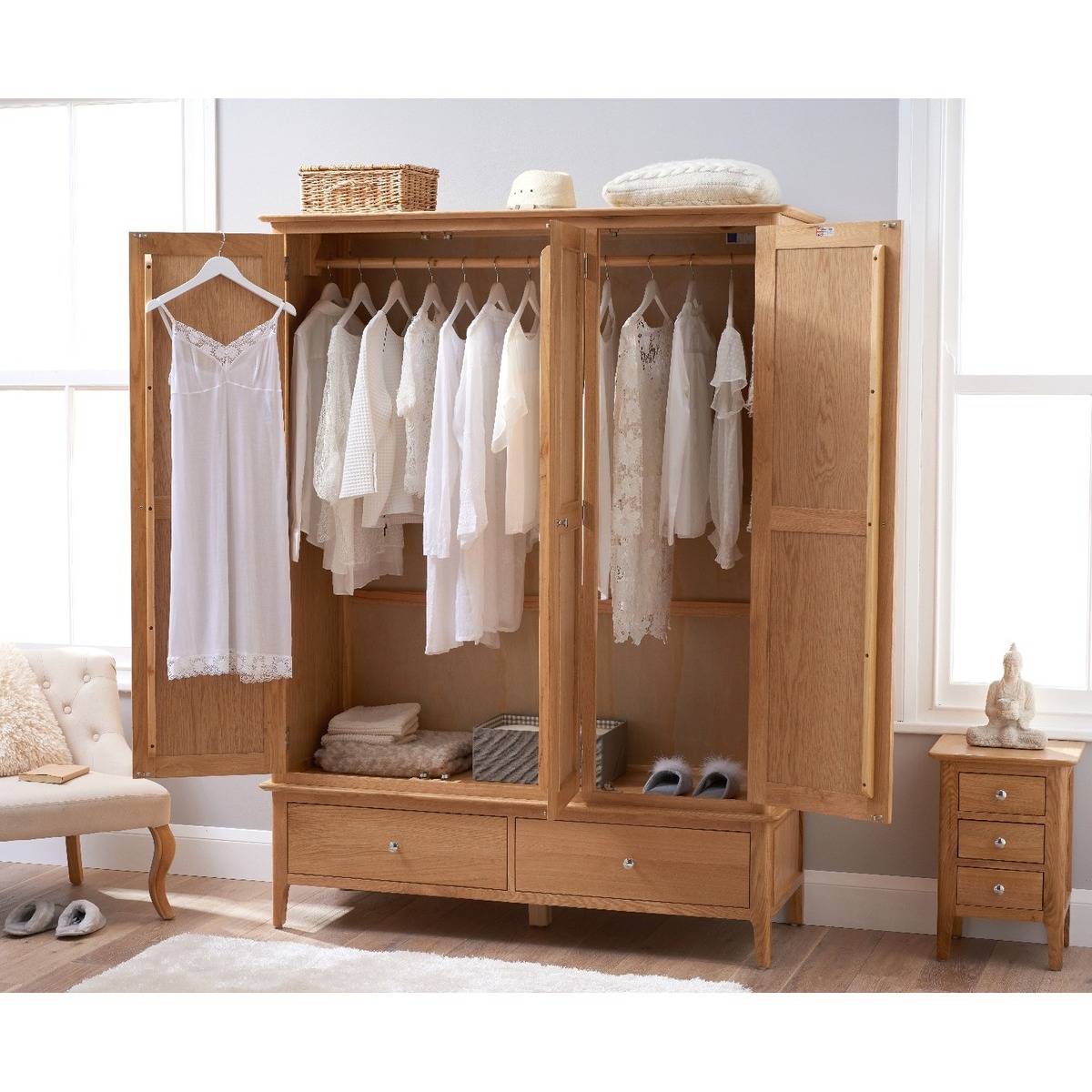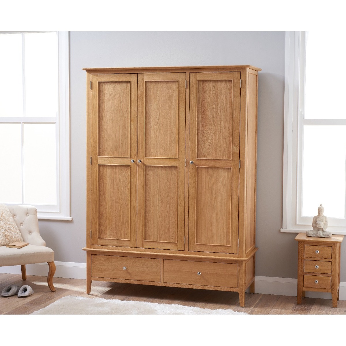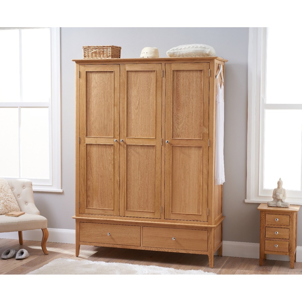 Bring minimalist style and practicality to your bedroom with the Sadie Oak Large Three Door Wardrobe. Featuring a sturdy frame with a natural light oak finish, the large wardrobe features a hardwood hanging rail and is complete with handy lower drawers for additional storage. Large three door wardrobe. Natural light oak finish for a stylish minimalist look. Hardwood hanging rail for optimum support. Two handy lower drawers with metal ball bearing runners provide additional storage. Comes with both oak and chrome knobs so you can choose your ideal look. Complements other items in the oak bedroom furniture collection