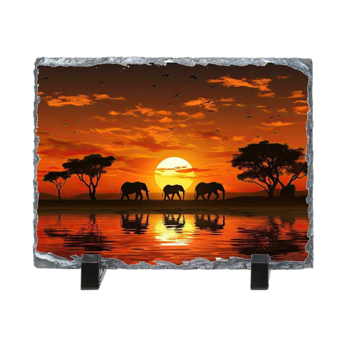 This elephants rock slate makes a fantastic statement piece in both contemporary and rustic interiors, thanks to its dramatic sunset scene and textured slate frame. I love how its natural materials add an organic touch, making it a versatile artwork that works well in living rooms, Hallways, or even bedrooms with nature-inspired themes. To style it effectively, consider pairing it with earthy tones or minimalistic decor to allow the vibrant colours and detailed scene to stand out. It’s also effective on a mantel or sideboard, where it can be a focal point, or hung on a feature wall as a striking piece of wall art. Keep surrounding accessories simple, and it will truly shine as the centrepiece of your space.