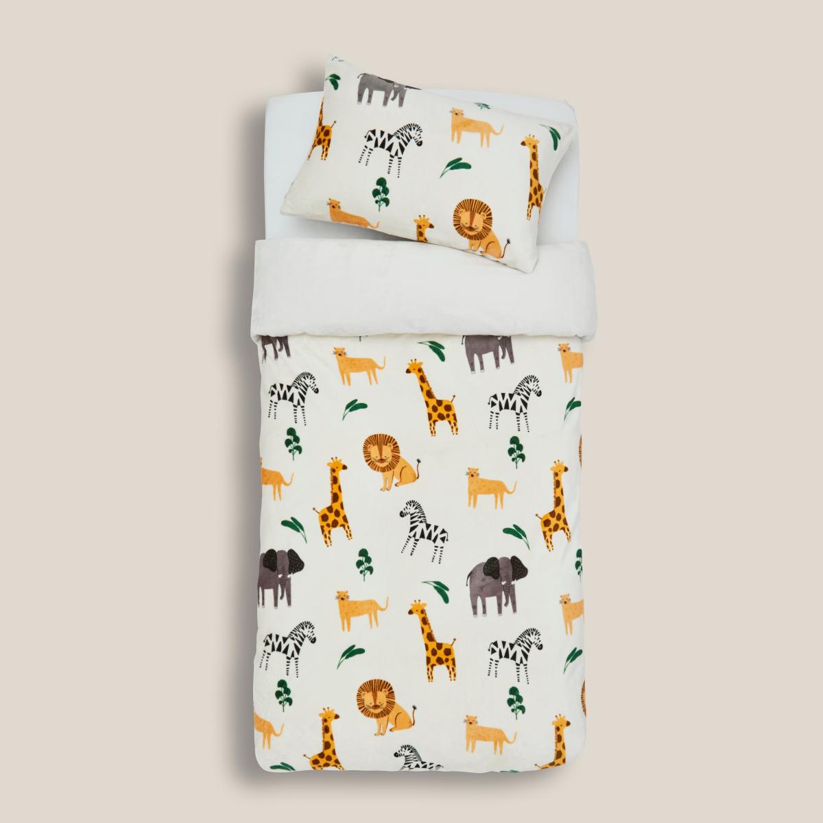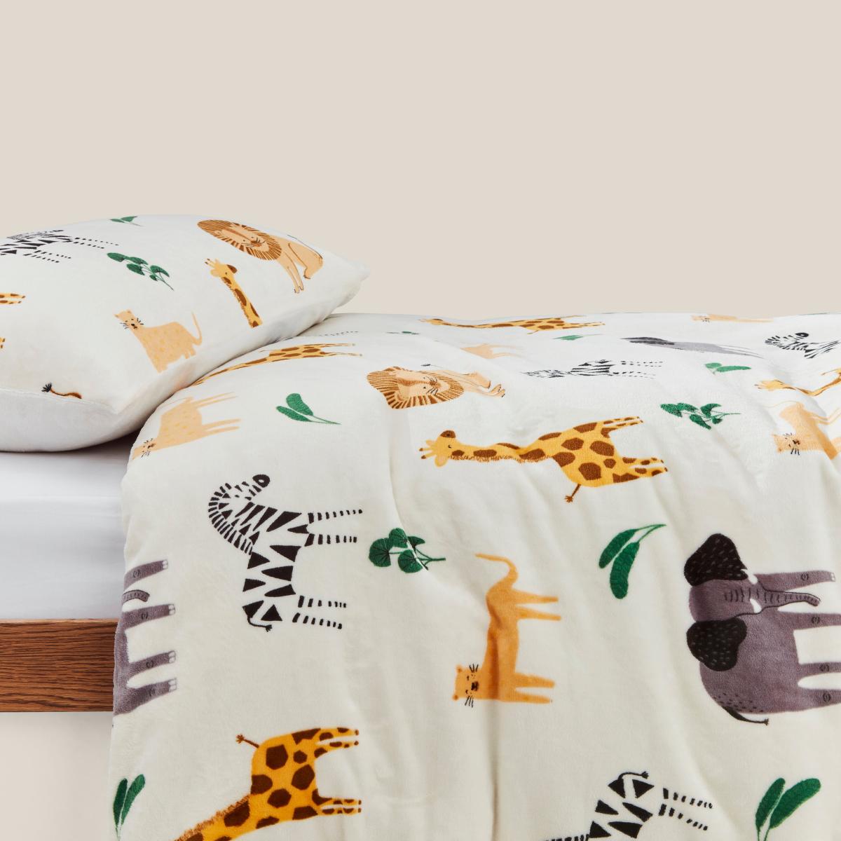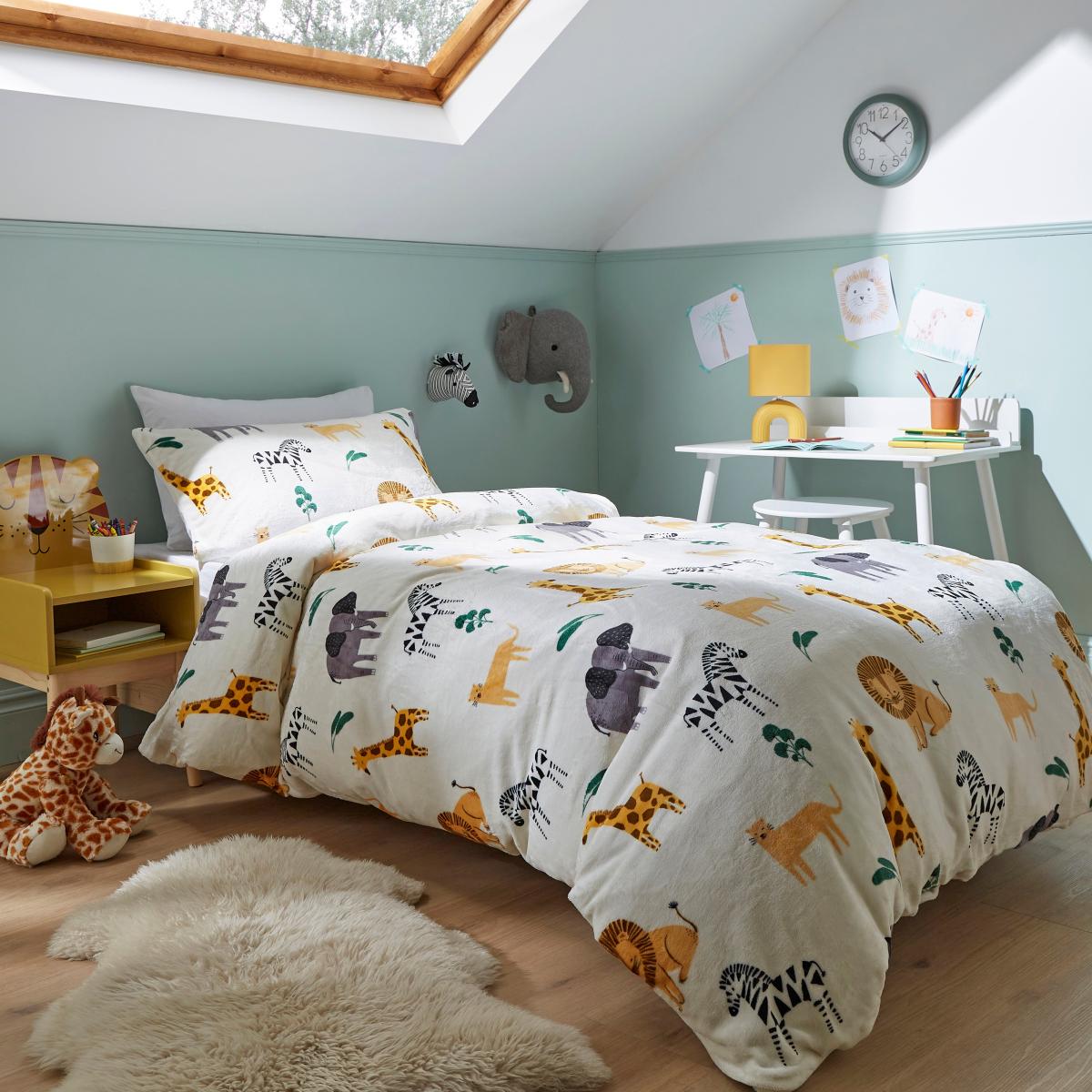 I love this duvet set because it brings a playful, animal-loving vibe to any child's room while remaining neutral enough to suit various colour schemes. It works particularly well in safari or jungle-themed interiors, adding a touch of adventure to the space. Practical styling tips include pairing it with earthy, textured accessories like woven baskets and leafy accents to enhance the safari feel. You can also layer it with plain or coordinating solid colour throws in warm tones like mustard or caramel for added warmth and visual interest. This set strikes a great balance between fun and stylish, making it a versatile choice for a child's bedroom update.