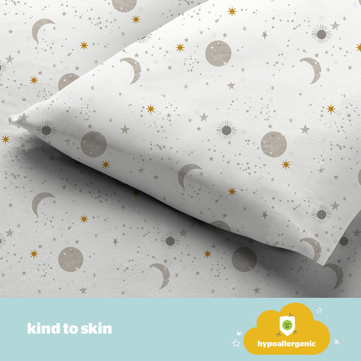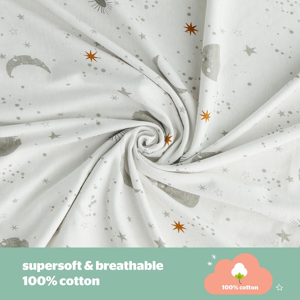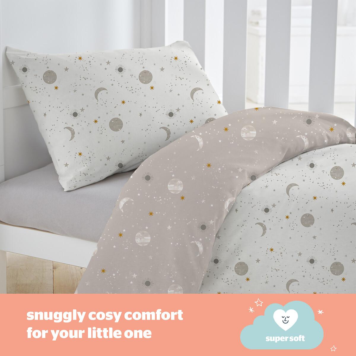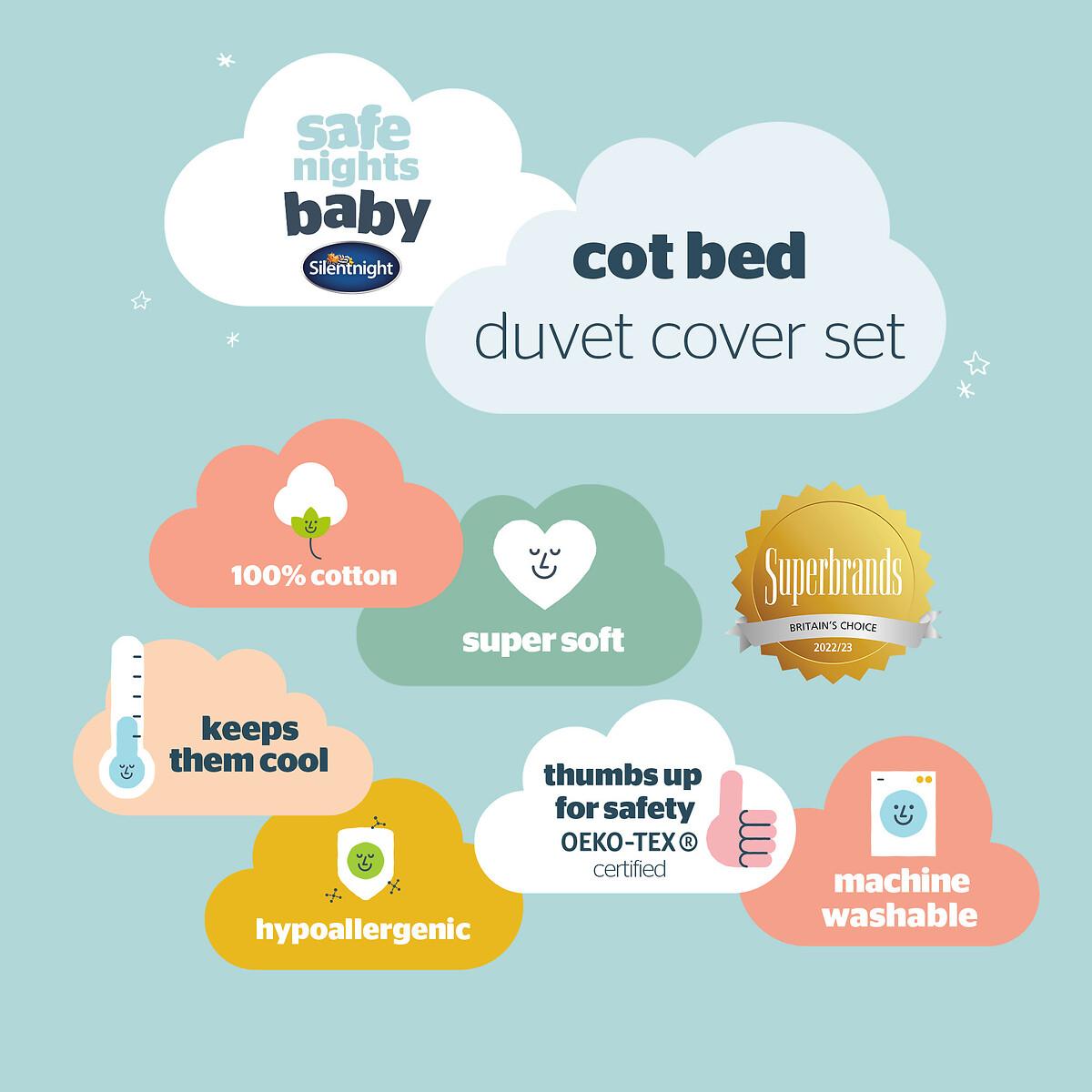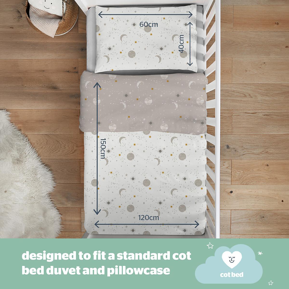 Features and Benefits:• SOFT COSY COMFORT:Offering snuggly cosy comfort for your little one throughout the night.• CERTIFIED SAFETY: Produced in OEKO-TEX® certified factory, this product has the ultimate seal of approval for safety standards.• CELESTIAL PRINT DESIGN:Featuring a stylish celestial print design, combining soft neutrals, earthy sage, and calming greys. Duvet set measures 120cm x 150cm and the pillowcase measures 60cm x 40cm.• BREATHABLE COTTON JERSEY: 100% breathable cotton jersey which feels super soft and gentle on the skin.• HYPOALLERGENIC:Kind to skin and doesn’t contain any materials likely to cause allergies.• MACHINE WASHABLE:Machine washable and tumble try safe. Soft, cosy comfort for your little one. Once your baby is at least 12 months old, it’s perfectly safe to use a light tog duvet and a really soft pillow. Of course, that means you’ll need an equally soft and snuggly duvet cover and pillowcase. This lovely set is crafted in 100% jersey cotton which is naturally breathable and soft to the touch. The set features a duvet cover and one pillowcase to fit a standard cot bed duvet and pillow. In a stylish celestial design, combining soft neutrals, earthy sage, and calming greys. Caring for the duvet set is simple, machine wash and tumble dry on a low heat, thanks to the easy-care cotton materials, the bedding has great recovery so will stand the test of time retaining shape after each wash. Produced in OEKO-TEX® certified factory, meaning this range has the ultimate seal of approval for safety standards. Part of Silentnight’s award-winning safe nights collection, creating safe and breathable products for your baby. Product Dimensions:120x 150 cm100% Jersey Cotton. One Size. This product will be dispatched by one of our trusted suppliers. You’ll be contacted by their selected courier about your delivery.
