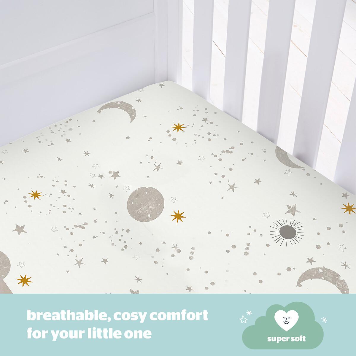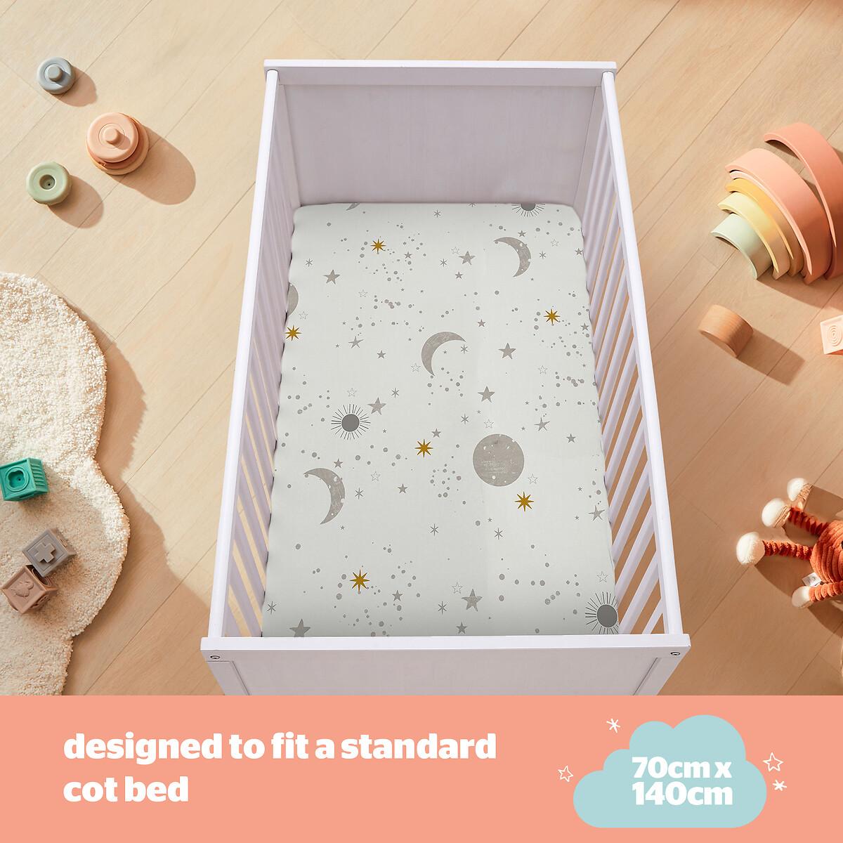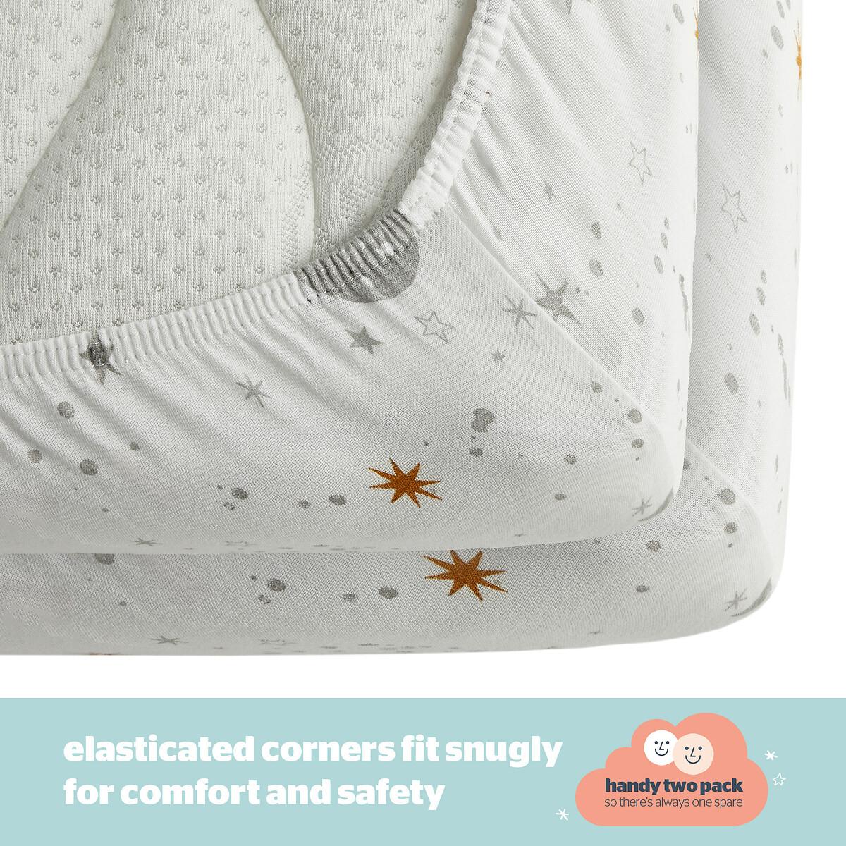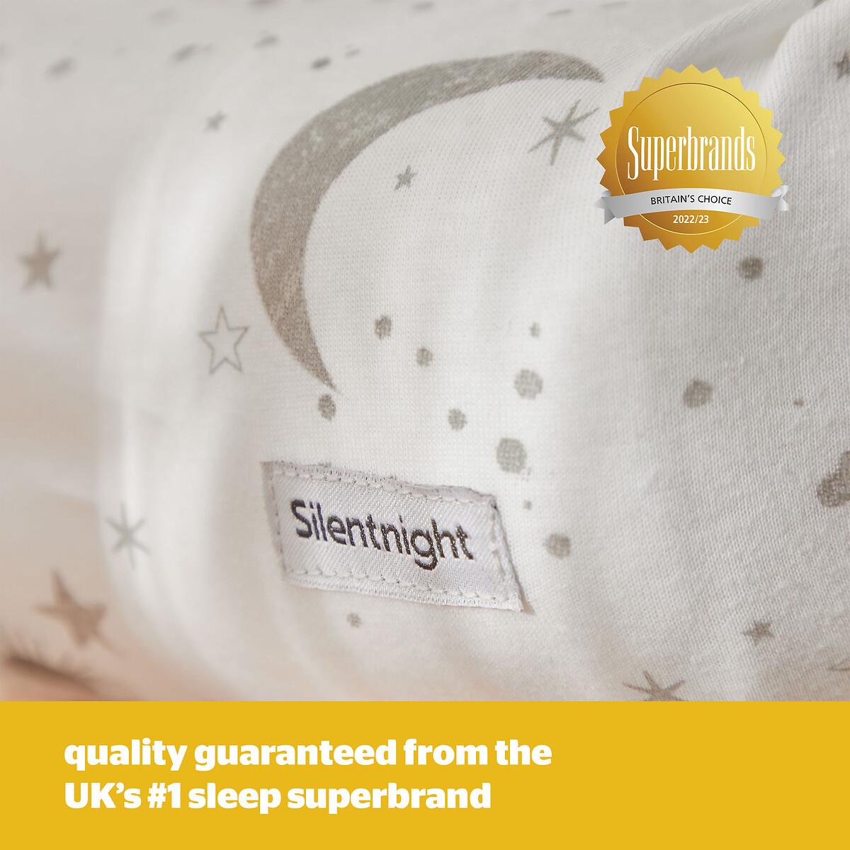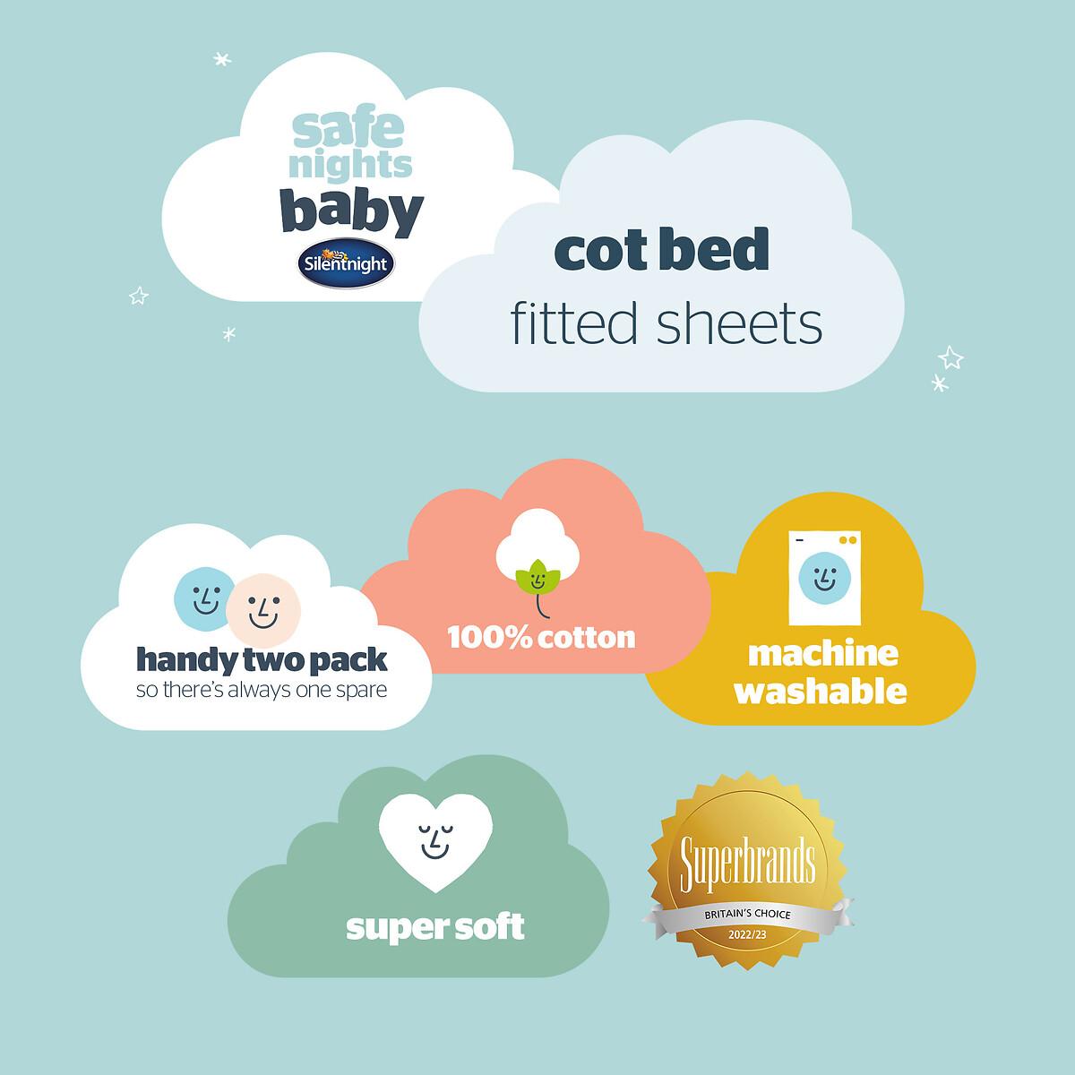 Features and Benefits: • SOFT COSY COMFORT:Offering breathable yet cosy comfort for your little one throughout the night.• CERTIFIED SAFETY: Produced in an OEKO-TEX® certified factory, this product has the ultimate seal of approval for safety standards.• BREATHABLE COTTON JERSEY: 100% breathable cotton jersey which feels super soft and gentle on the skin.• COT BED SIZE:The fitted sheets measures 140cm x 70cm with a depth of 12cm. Each pack includes 2 fitted sheets, so there is always a spare on hand!• SECURE FIT:It’s important that sheets fit neatly around your baby’s mattress for comfort and safety. The elasticated corners ensure a snug fit over your Cot Bed’s mattress.• MACHINE WASHABLE: Tested to 50 machine washes, tumble dry safe. It’s important that sheets fit neatly around your baby’s mattress for comfort and safety. The Silentnight Safe Nights fitted sheets are an essential for every nursery. Made from 100% cotton which is soft and breathable with your babies’ comfort in mind, always. The handy 2 pack means you will always have a spare. The sheets feature elasticated edges to provide a snug fit to your babies’ mattress. Produced in an OEKO-TEX® certified factory, this product has the ultimate seal of approval for safety standards. Fully machine washable and can be tumble dried on a low heat. The sheets are durable and designed to stand the test of time, they have been tested to withstand 50 washes. Part of Silentnight’s award-winning Safe Nights collection, creating safe and breathable products for your baby. Product Dimensions:140x 70 cm100% Jersey Cotton. One Size. This product will be dispatched by one of our trusted suppliers. You’ll be contacted by their selected courier about your delivery.