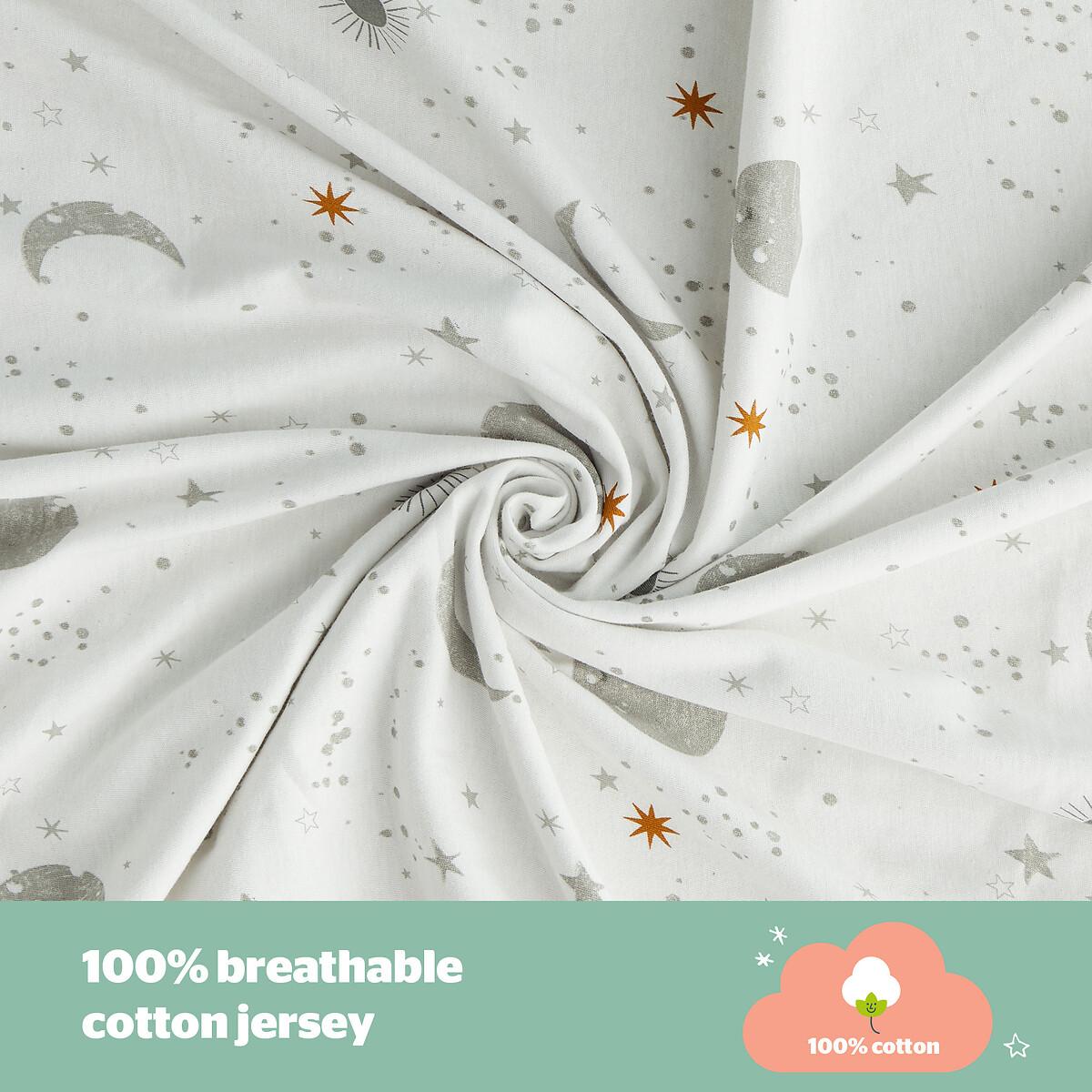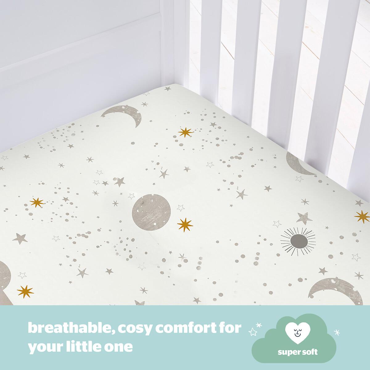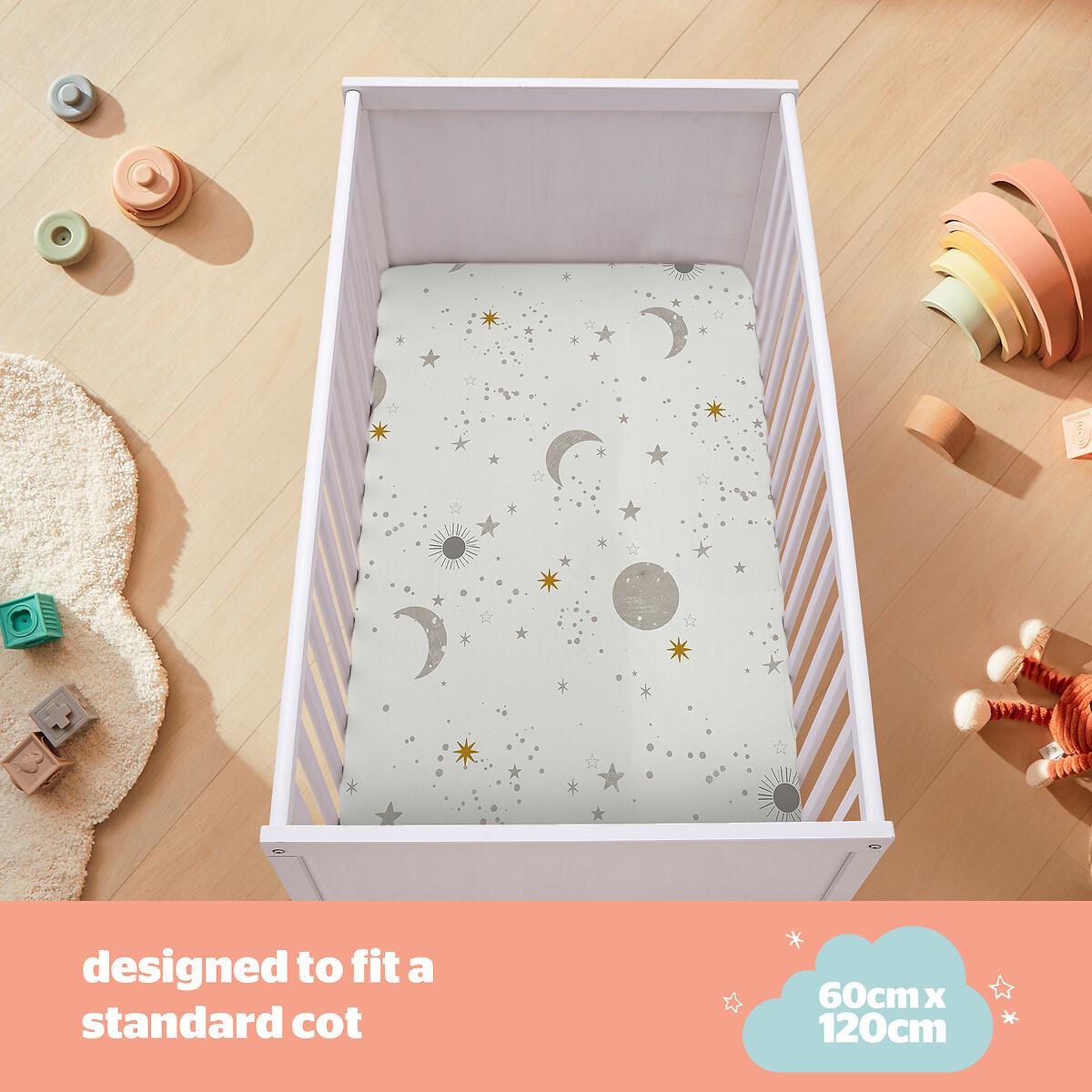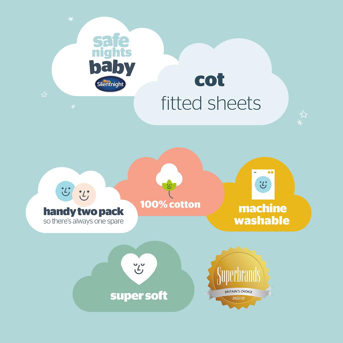 Features and Benefits: • SOFT COSY COMFORT:Offering breathable yet cosy comfort for your little one throughout the night.• CERTIFIED SAFETY: Produced in an OEKO-TEX® certified factory, this product has the ultimate seal of approval for safety standards.• BREATHABLE COTTON JERSEY: 100% breathable cotton jersey which feels super soft and gentle on the skin.• COT SIZE:The fitted sheets measures 120cm x 60cm with a depth of 12cm. Each pack includes 2 fitted sheets, so there is always a spare on hand!• SECURE FIT:It’s important that sheets fit neatly around your baby’s mattress for comfort and safety. The elasticated corners ensure a snug fit over your Cot’s mattress.• MACHINE WASHABLE: Tested to 50 machine washes, tumble dry safe. It’s important that sheets fit neatly around your baby’s mattress for comfort and safety. The Silentnight Safe Nights fitted sheets are an essential for every nursery. Made from 100% cotton which is soft and breathable with your babies’ comfort in mind, always. The handy 2 pack means you will always have a spare. The sheets feature elasticated edges to provide a snug fit to your babies’ mattress. Produced in an OEKO-TEX® certified factory, this product has the ultimate seal of approval for safety standards. Fully machine washable and can be tumble dried on a low heat. The sheets are durable and designed to stand the test of time, they have been tested to withstand 50 washes. Part of Silentnight’s award-winning Safe Nights collection, creating safe and breathable products for your baby. Product Dimensions:120x 60 cm100% Jersey Cotton. One Size. This product will be dispatched by one of our trusted suppliers. You’ll be contacted by their selected courier about your delivery.